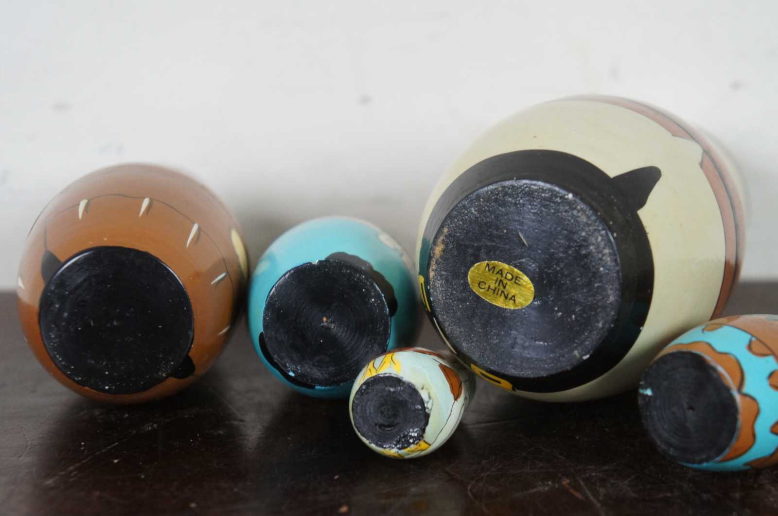 Vintage five piece set of American Thanksgiving themed nesting dolls featuring two Pilgrims, two Native Americans and a turkey.