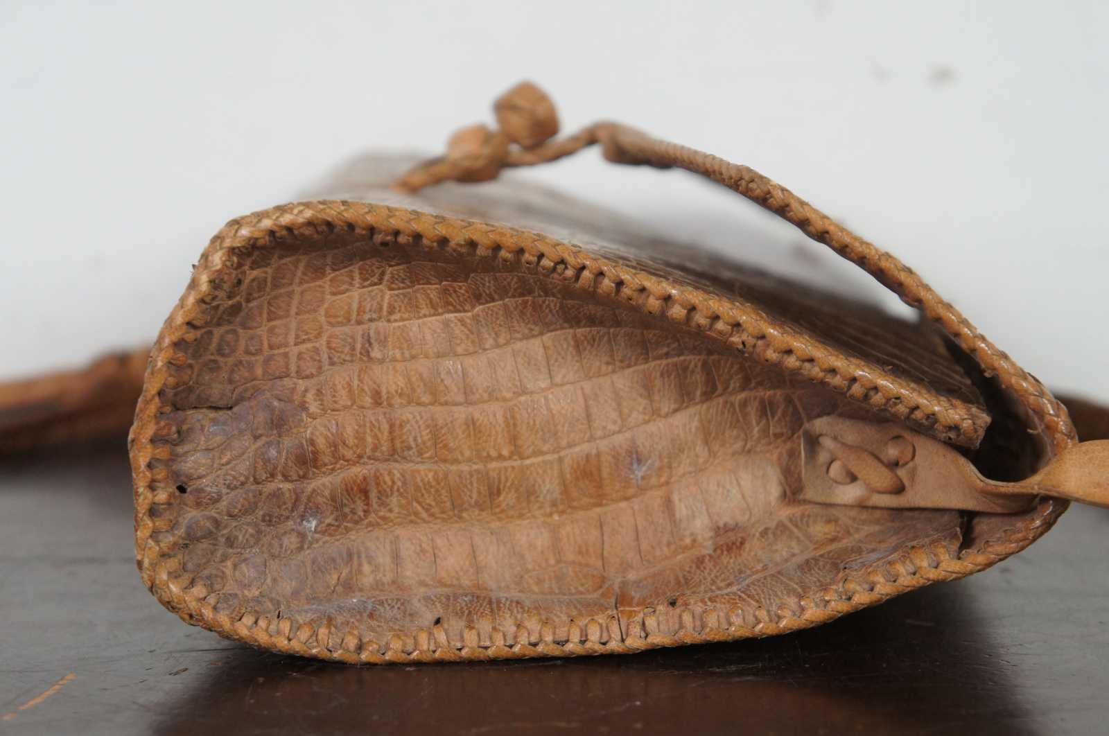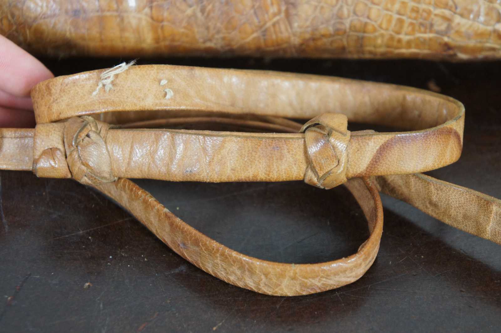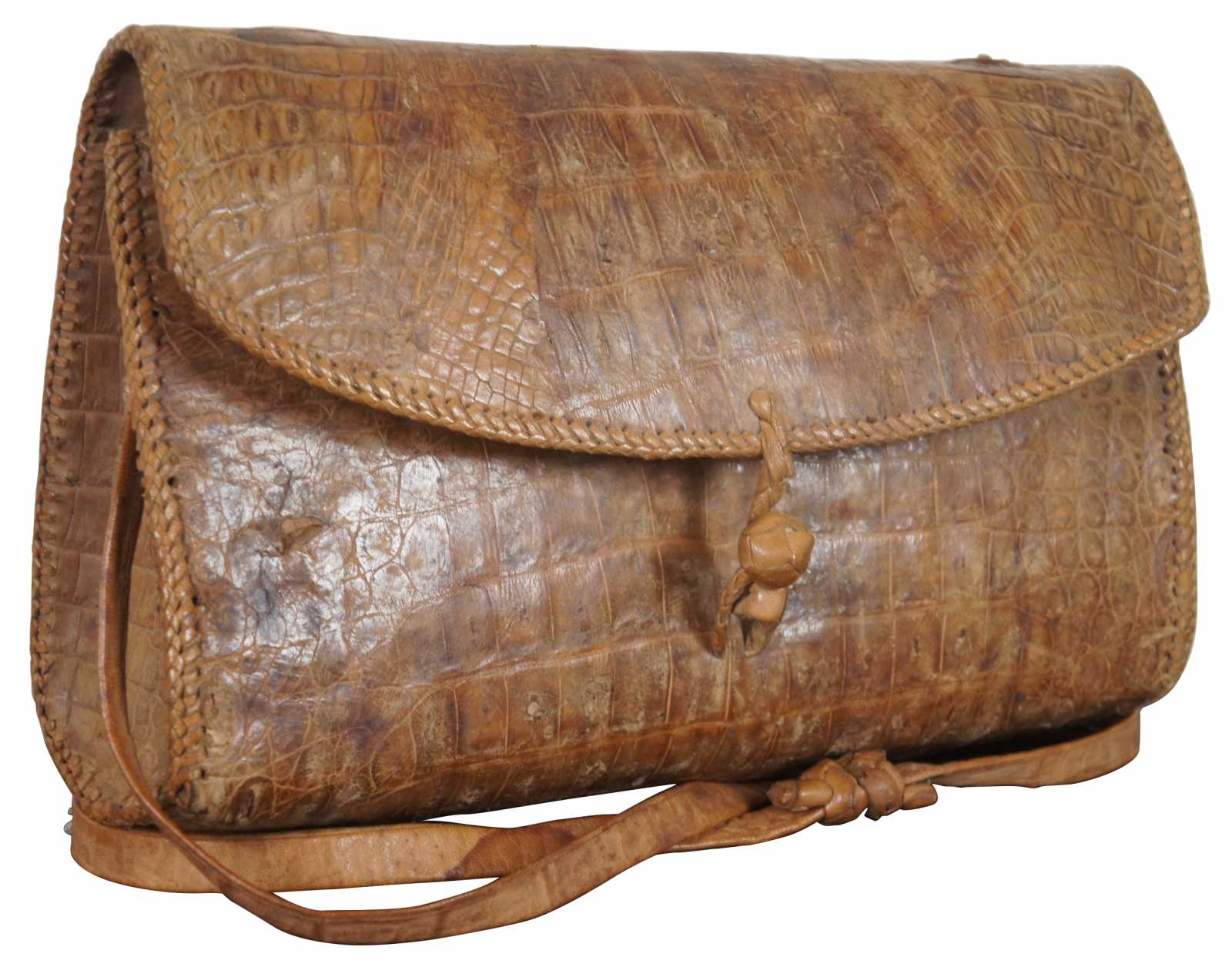 Vintage brown leather alligator skin bag with loop and toggle closure and fully adjustable shoulder strap.