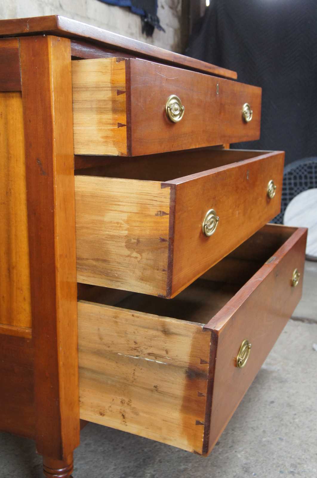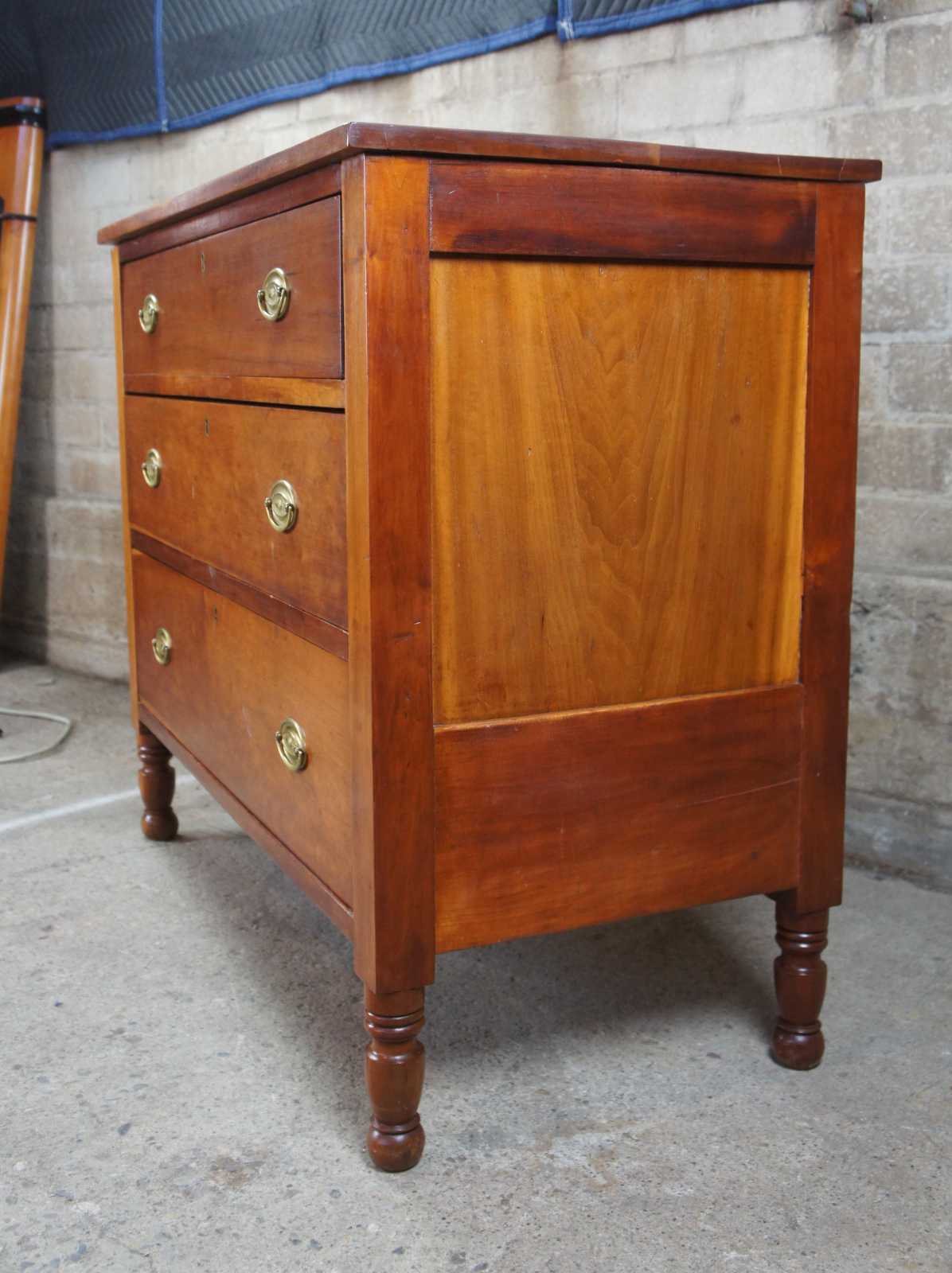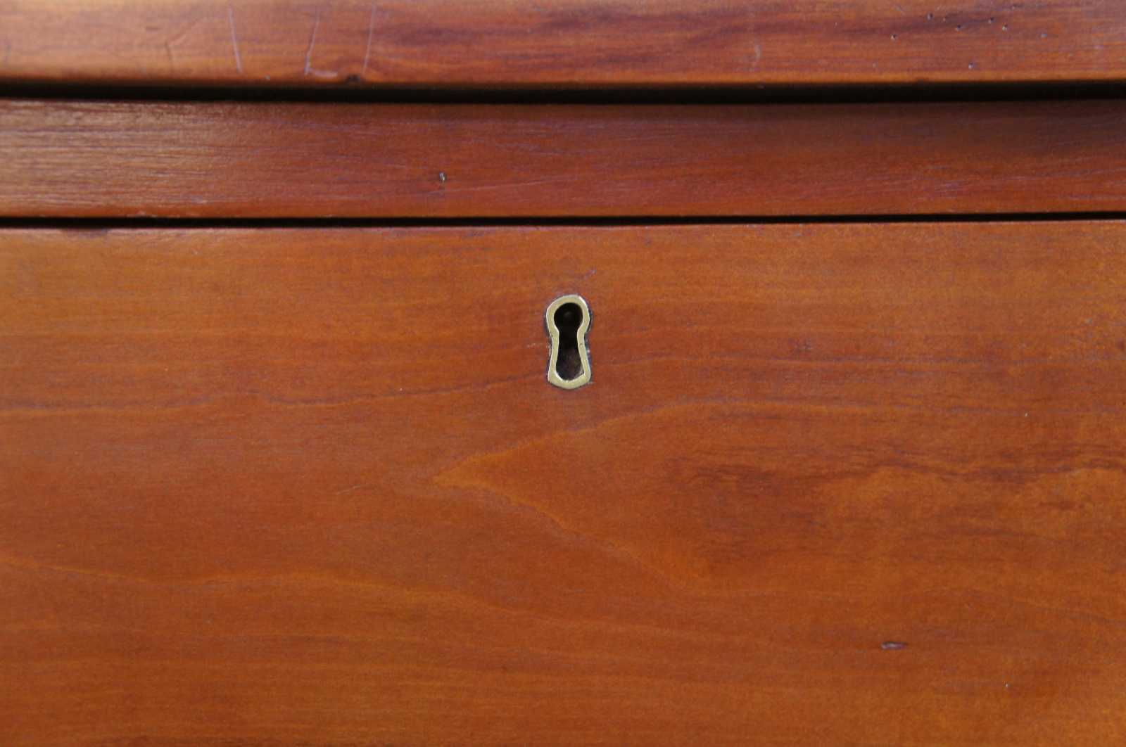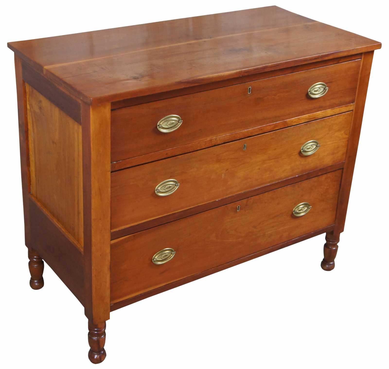 Antique Sheraton chest of drawers. Made from Cherry with a rectangular form. Features three hand dovetailed drawers and turned nub feet.