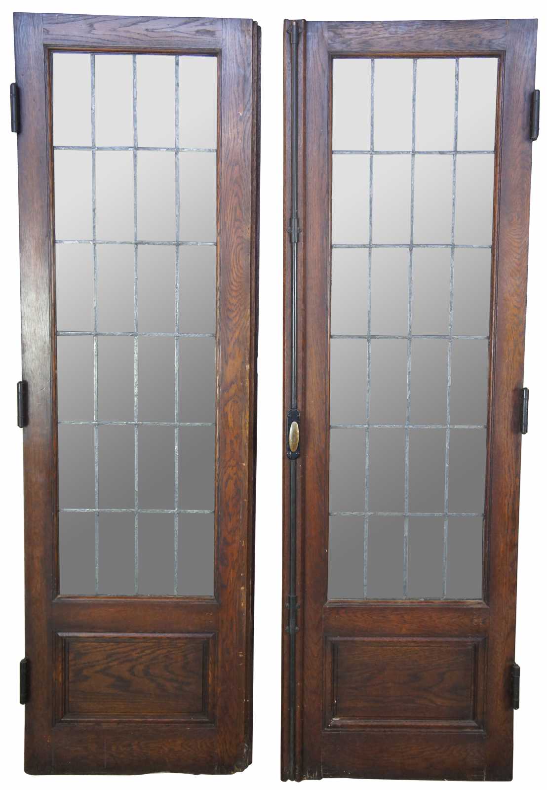 Ealy 20th century French doors. Made from solid oak with 24 panel leaded glass sections over paneled accent. Reclaimed from one of the first homes built in Oakwood, Ohio by Harry I Schenck, circa early 1900s. These doors were originally used between a patio and interior room, so they are painted red along one side.