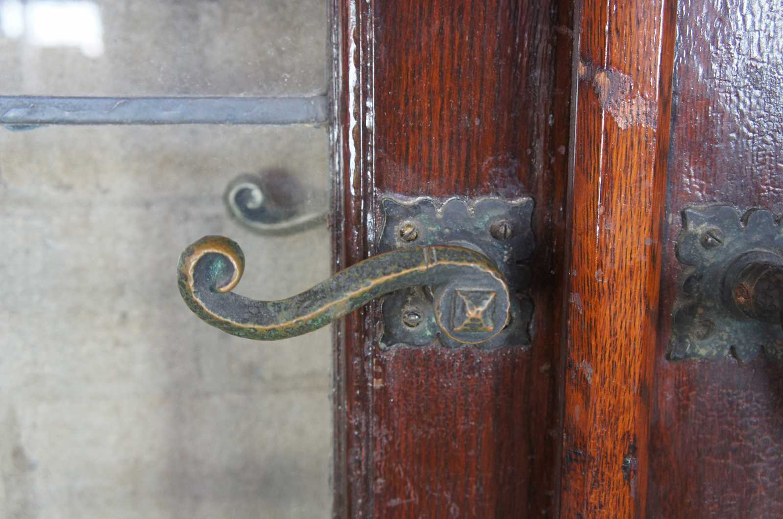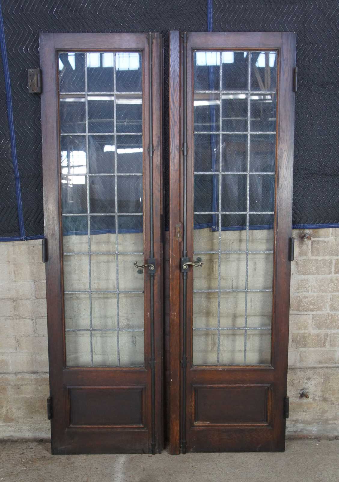 Ealy 20th century French doors. Made from solid oak with 24 panel leaded glass sections over paneled accent and spanish revival door handles. Reclaimed from one of the first homes built in Oakwood, Ohio by Harry I Schenck, circa early 1900s.