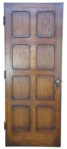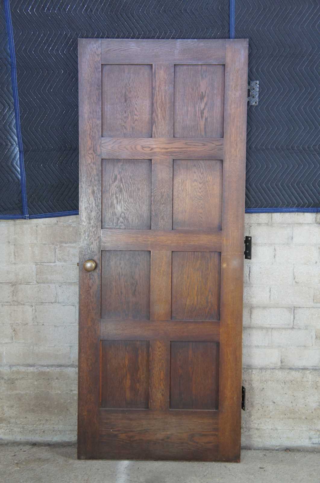 Early 20th century oak reclaimed door. Features eight panels in a grid pattern with Spanish Revival design hammered hardware with knobs and deadbolt. Comes from one of the first homes built in Oakwood, Ohio by Harry I Schenck, circa early 1900s.