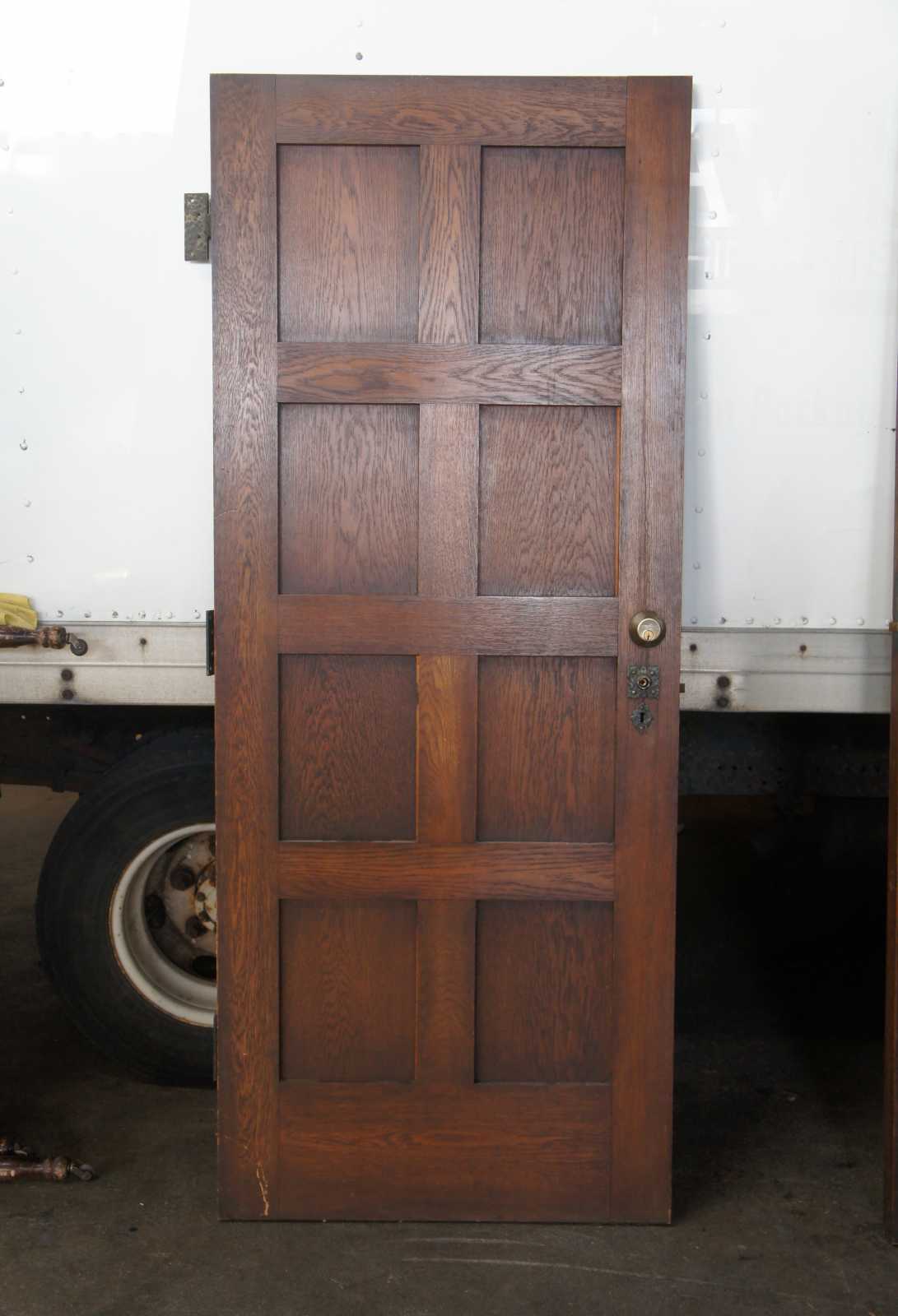 Early 20th century oak reclaimed door. Features eight panels in a grid pattern with Spanish Revival design. Comes from one of the first homes built in Oakwood, Ohio by Harry I Schenck, circa early 1900s.