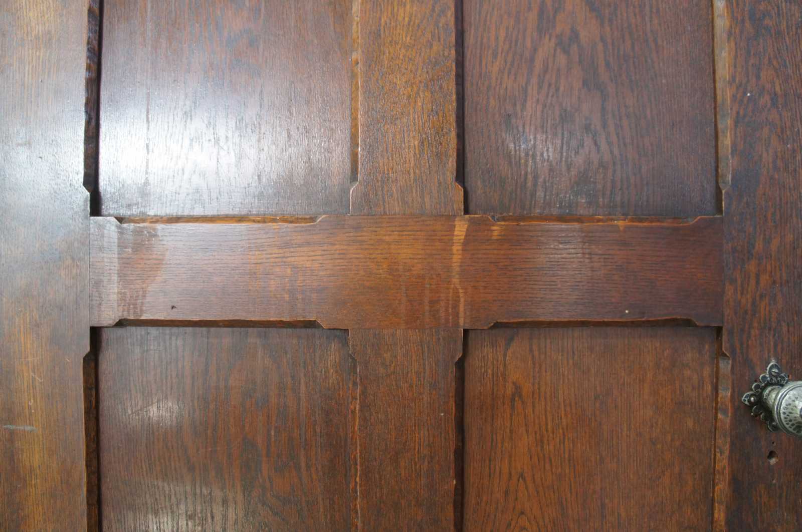 Early 20th century oak reclaimed door. Features eight panels in a grid pattern with Spanish Revival design hammered hardware with knobs and deadbolt. Comes from one of the first homes built in Oakwood, Ohio by Harry I Schenck, circa early 1900s.