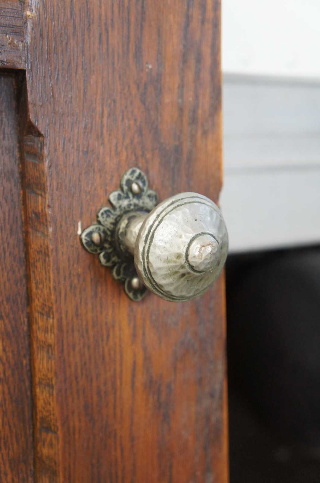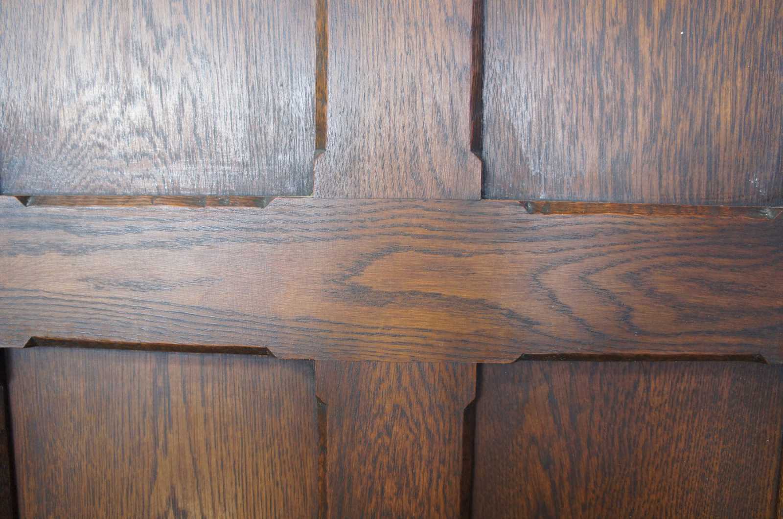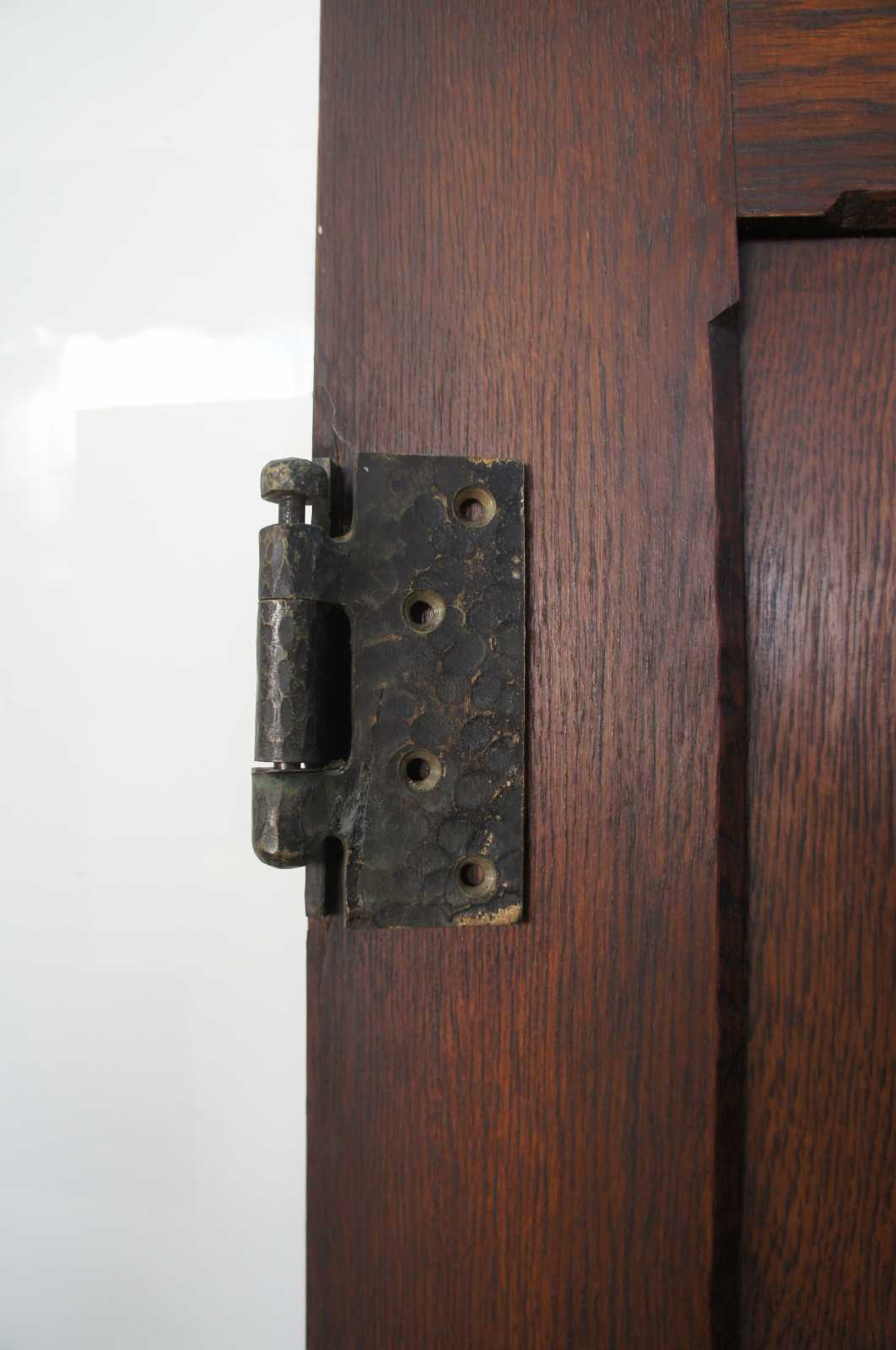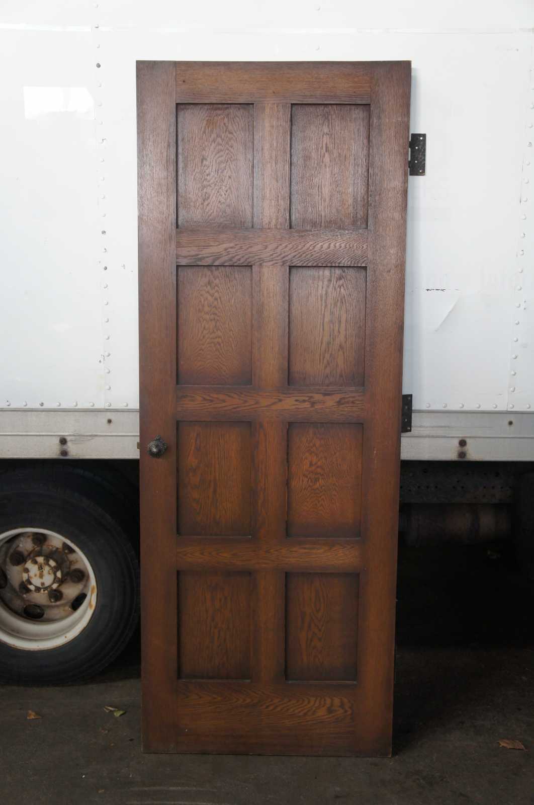 Early 20th century oak reclaimed door. Features eight panels in a grid pattern with Spanish Revival design and hammered hardware with knobs. Comes from one of the first homes built in Oakwood, Ohio by Harry I Schenck, circa early 1900s.