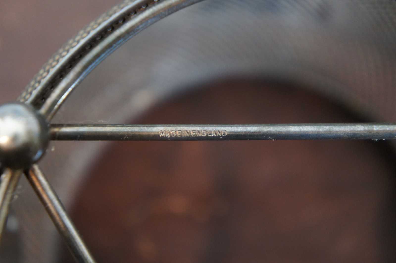 Vintage made in England biscuit barrel, tea caddy or small ice bucket made of metal mesh with shield accent (no monogram) and lions head handles. Includes tin insert.