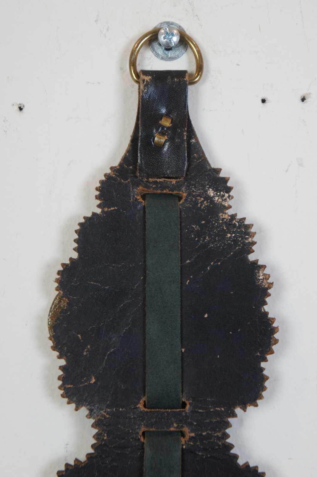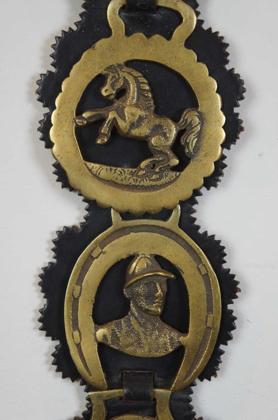 Vintage mid century black leather horse tack strap decorated with six brass bridal medallions.
