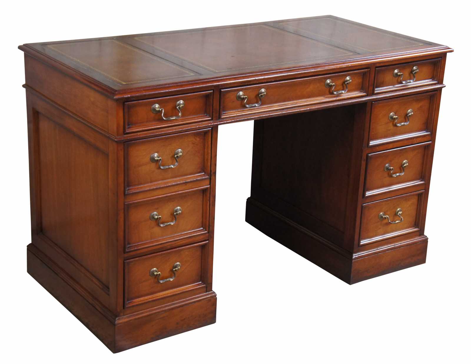 Mid century Sligh-Lowry desk. Made of mahogany featuring a tooled leather top and eight drawers.