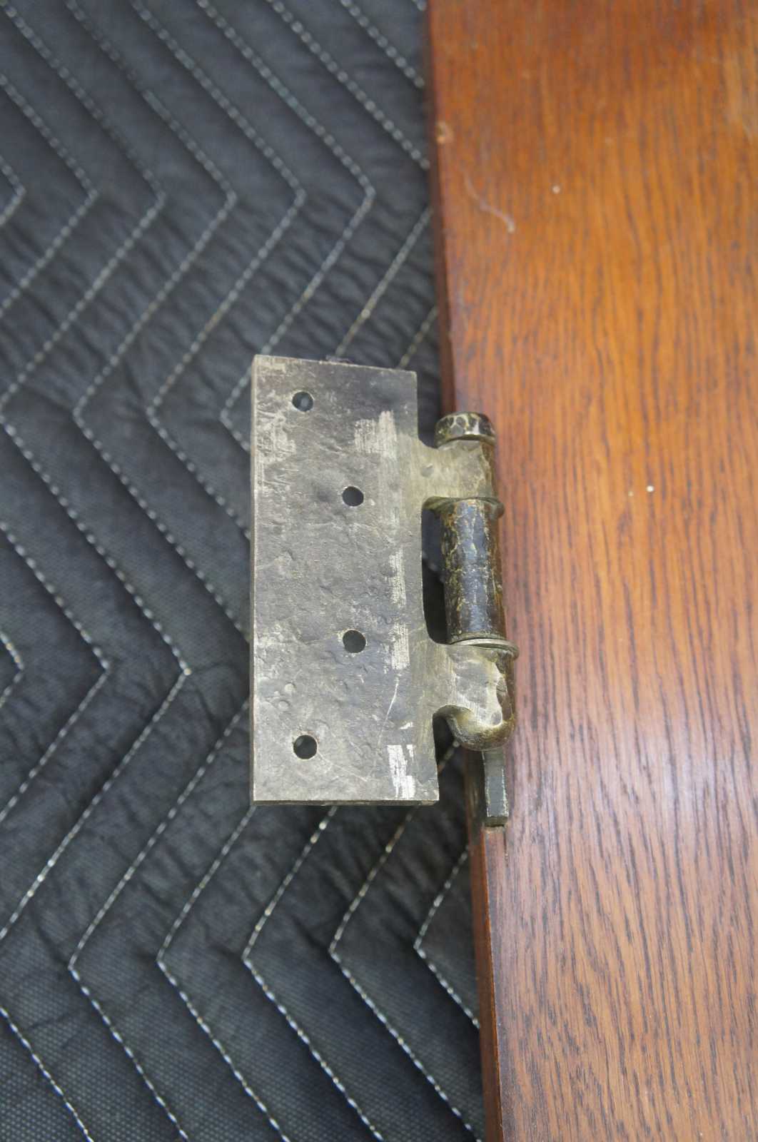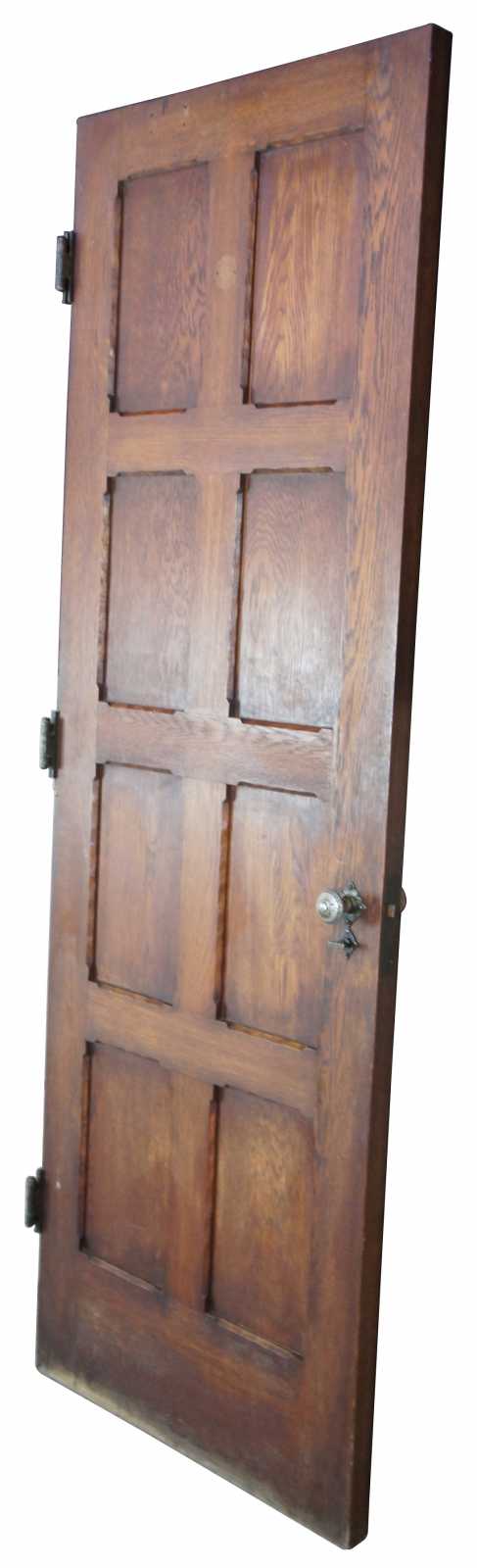 Early 20th century oak reclaimed door. Features eight panels in a grid pattern with Spanish Revival design hammered hardware with knobs and deadbolt. Comes from one of the first homes built in Oakwood, Ohio by Harry I Schenck, circa early 1900s.