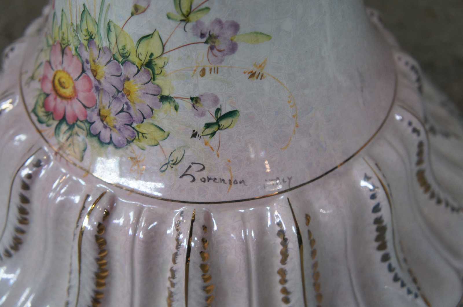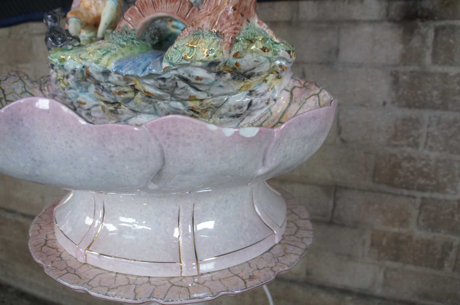 Gianni Lorenzon Italian illuminated fountain with flower petal lamp and hand painted accents. Features a colonial scene with a couple with alongside a waterfall. The gentleman can be seen playing a flute while the lady climbs the nearby tree. The fountain rest upon a base and pedestal. Hand Signed.