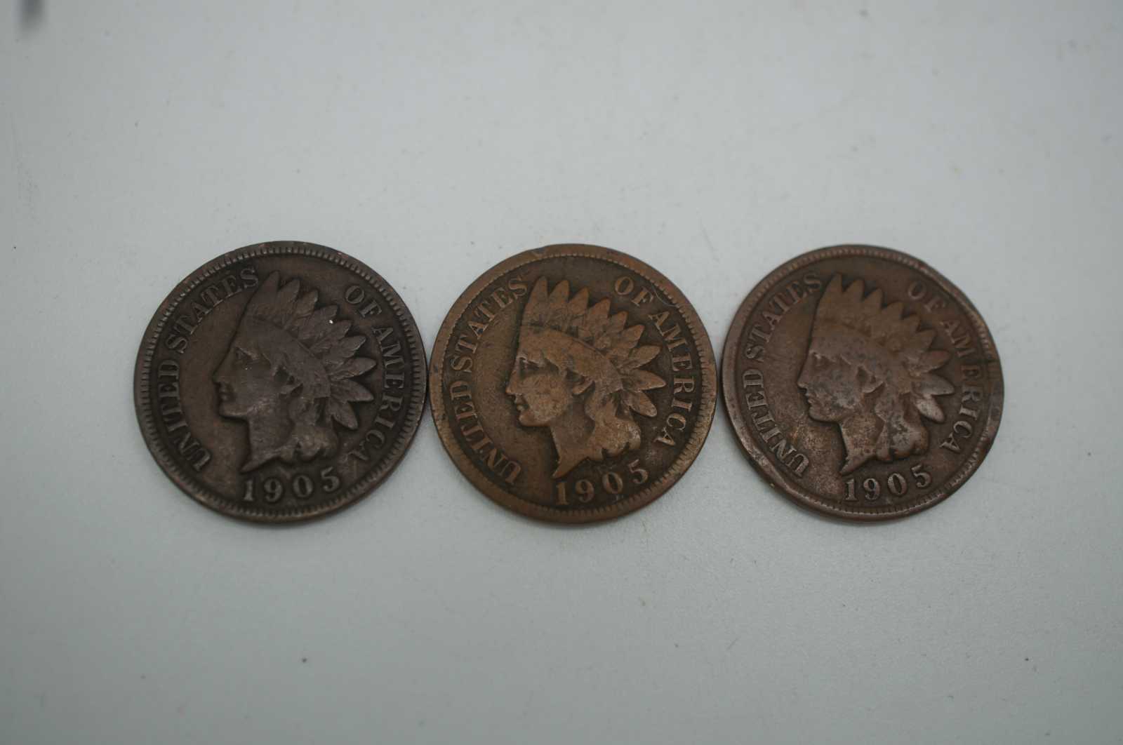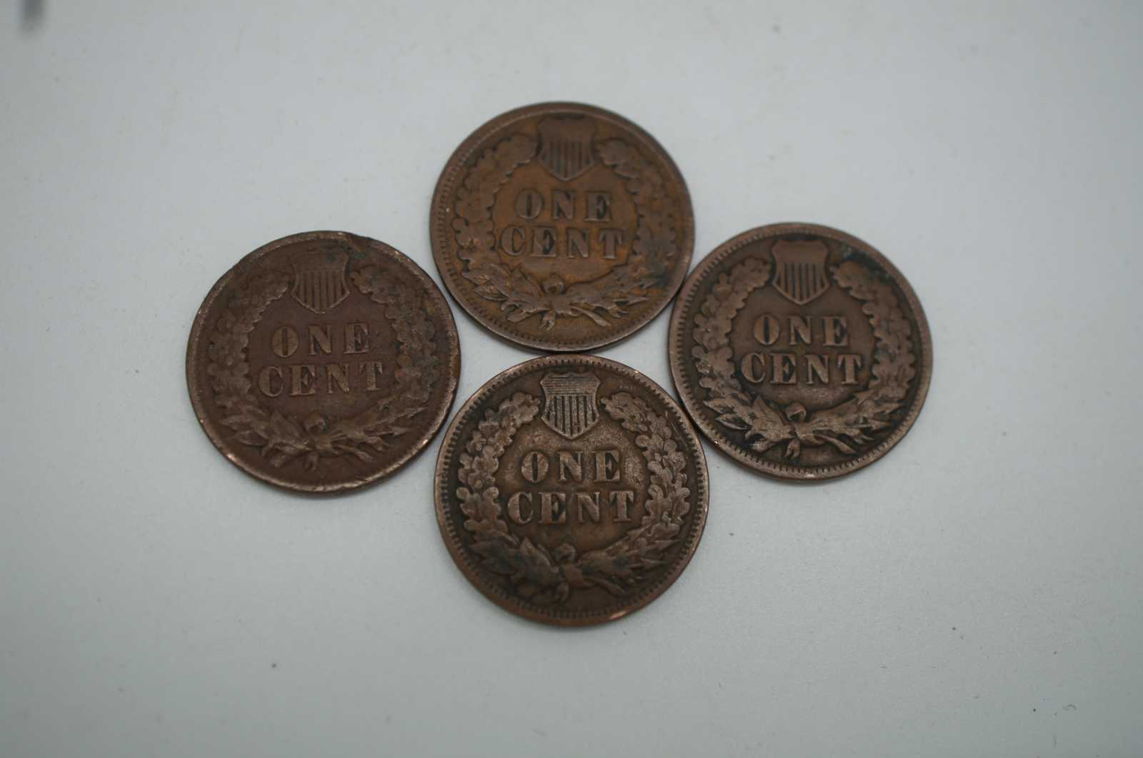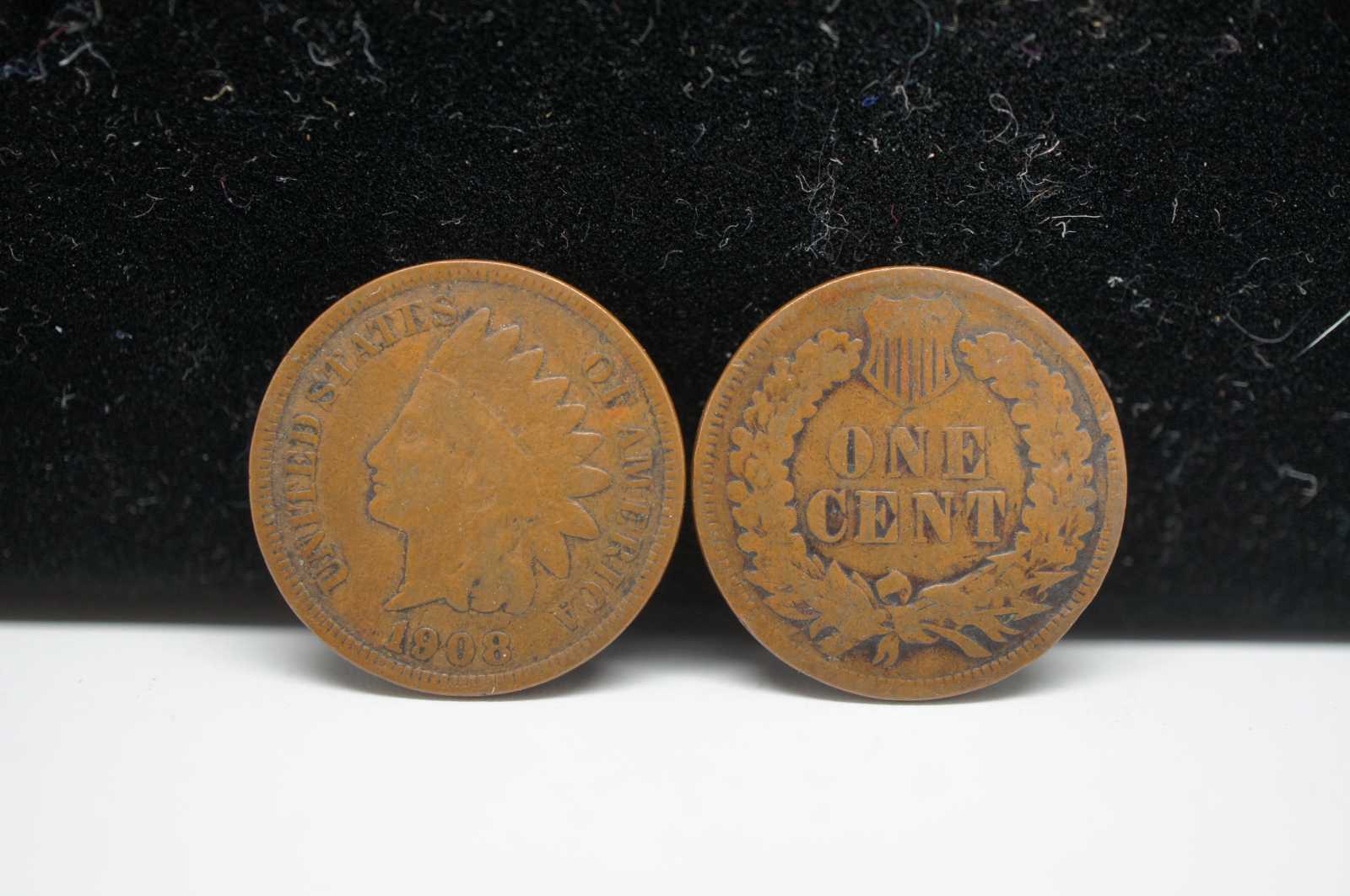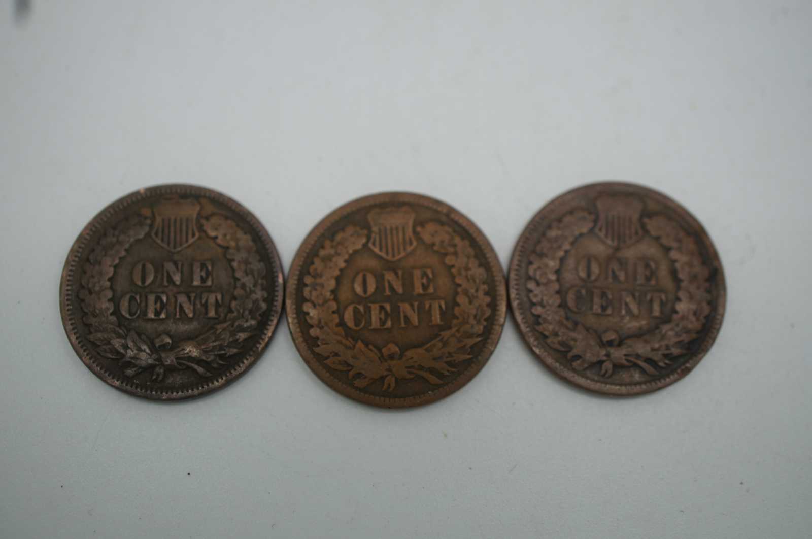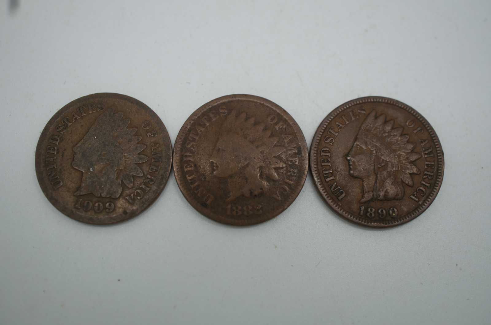 Lot of 13 antique Liberty head one cent coins. Obverse: the head of Liberty, looking left, wearing a Native American headdress; the words “United States of America” and the year around the edge. Reverse: a leafy wreath with arrows at the base and tied with a ribbon around the edge, with a stars and stripes shield at the top center; the words “One Cent” in the middle. Years included: 1882, 1890, 1891, 1897, 1898, 1900, 1905, 1906, 1908, 1909.