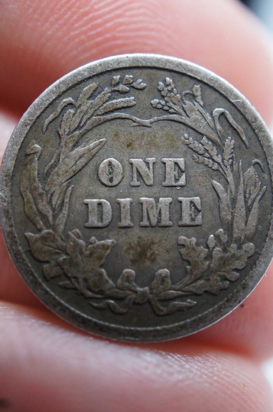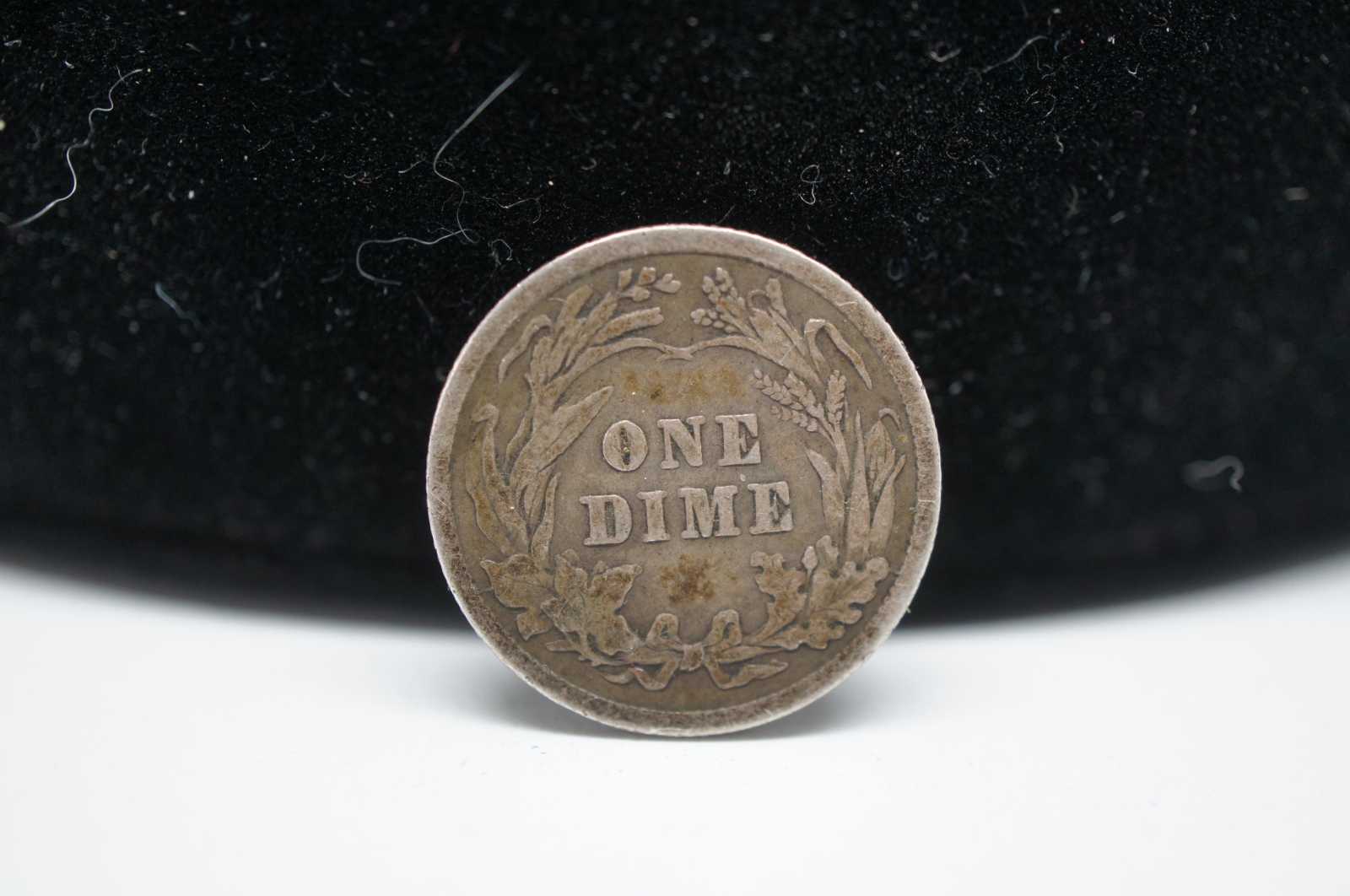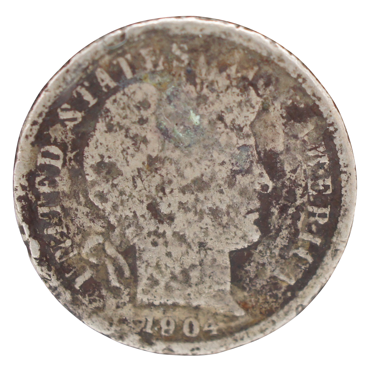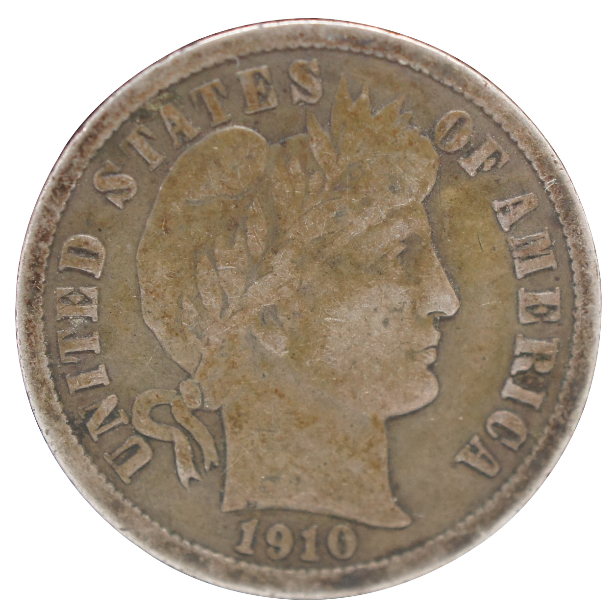 Pair of antique 1904 and 1910 Liberty head dimes. Obverse: the head of Liberty looking right crowned in a laurel wreath tied with a ribbon; the words “United States of America” and the year around the outside edge. Reverse: a leafy wreath of wheat and flowers tied with a ribbon surrounding the words “One Dime.”