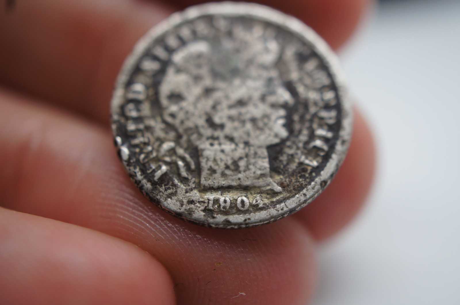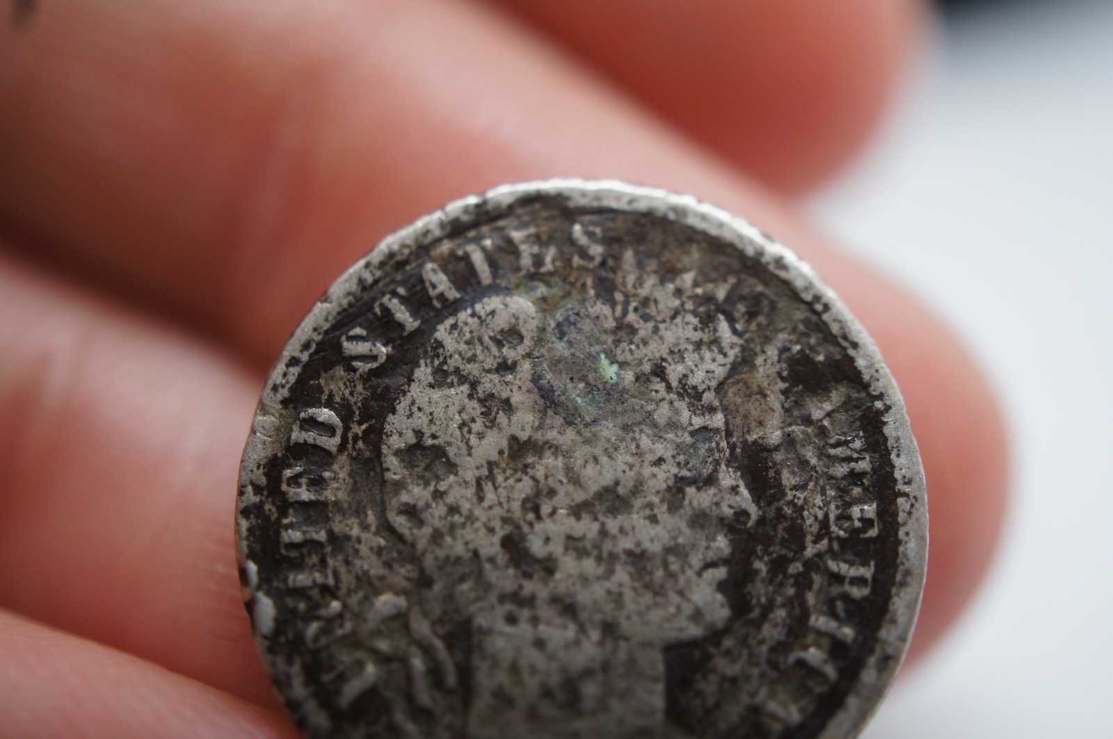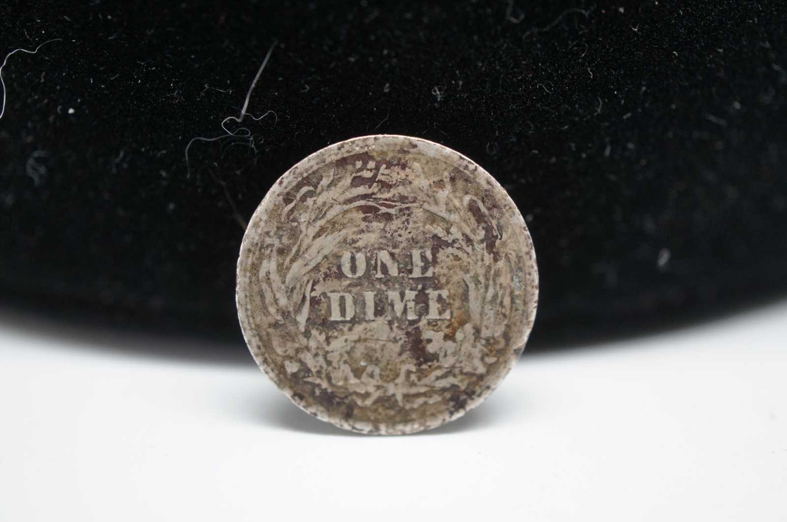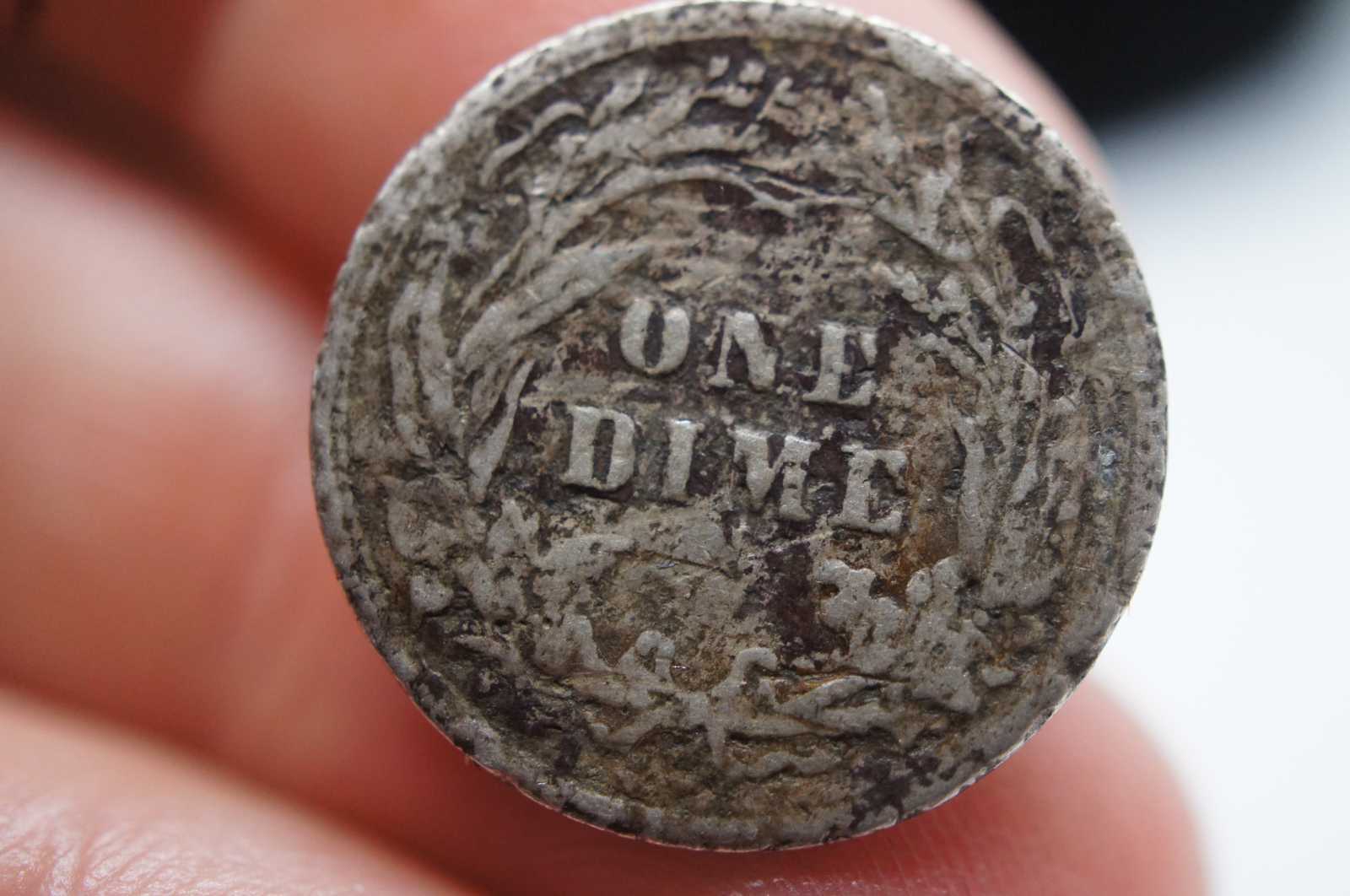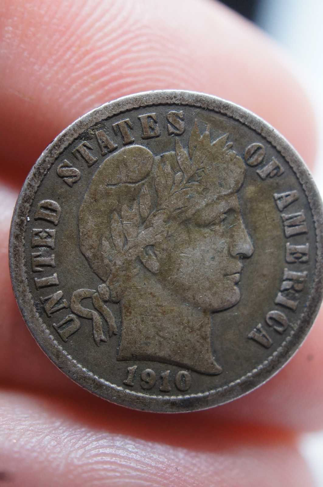 Pair of antique 1904 and 1910 Liberty head dimes. Obverse: the head of Liberty looking right crowned in a laurel wreath tied with a ribbon; the words “United States of America” and the year around the outside edge. Reverse: a leafy wreath of wheat and flowers tied with a ribbon surrounding the words “One Dime.”
