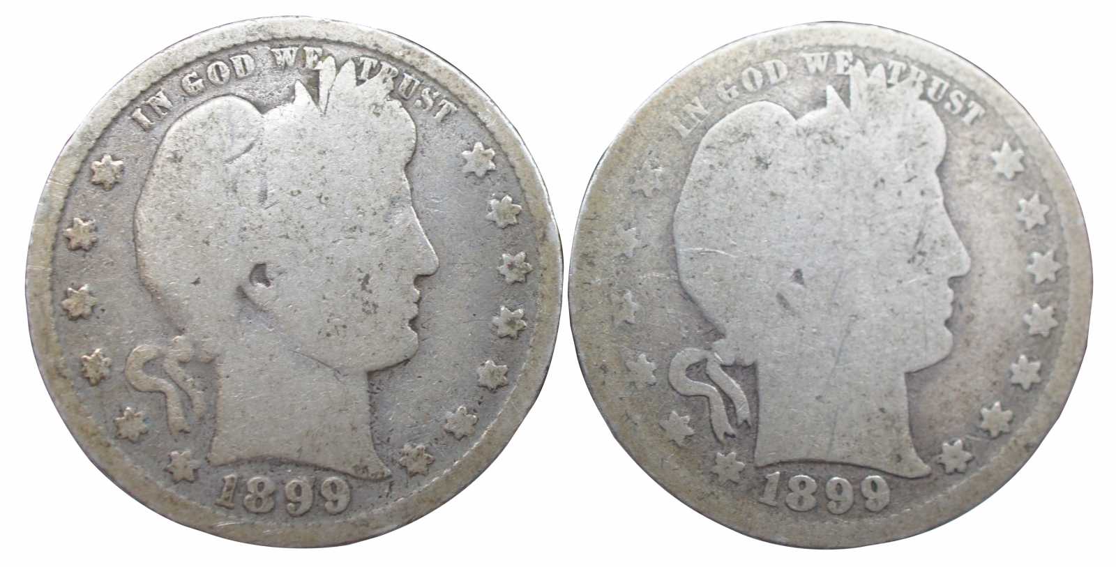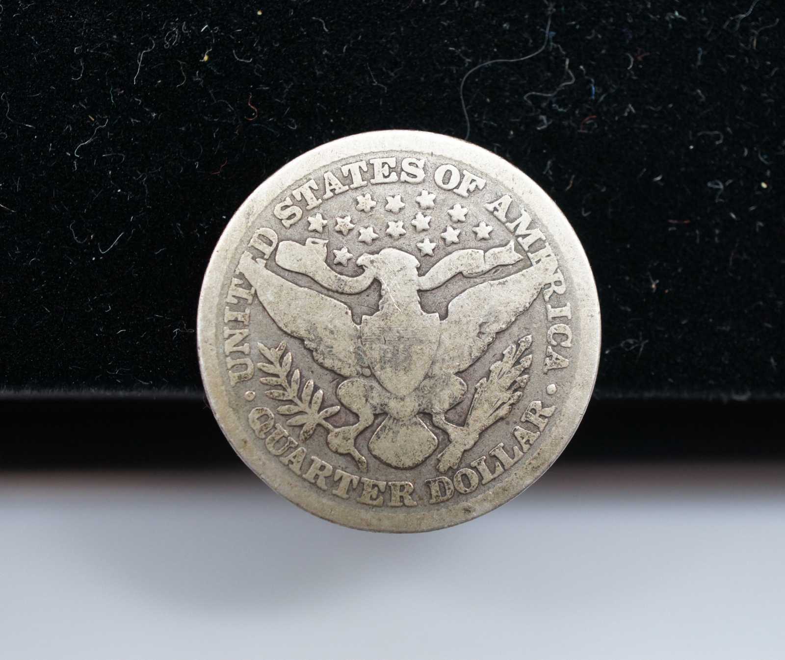Lot of five antique Liberty head quarters. Obverse: the head of Liberty, facing right, wearing an olive wreath, surrounded by a border of stars; the words “In God We Trust” centered on the top edge and the year at the bottom edge. Reverse: blad eagle with wings outstretched, facing left, with 13 stars above its head, a ribbon in its beak, a striped shield on its chest, and an olive branch and bundle of arrows in each of its respective talons; the words “United States of America” and “Quarter Dollar” flanked by two dots around the outside edge. Years included: 1898, 1899, 1908 and 1916.
