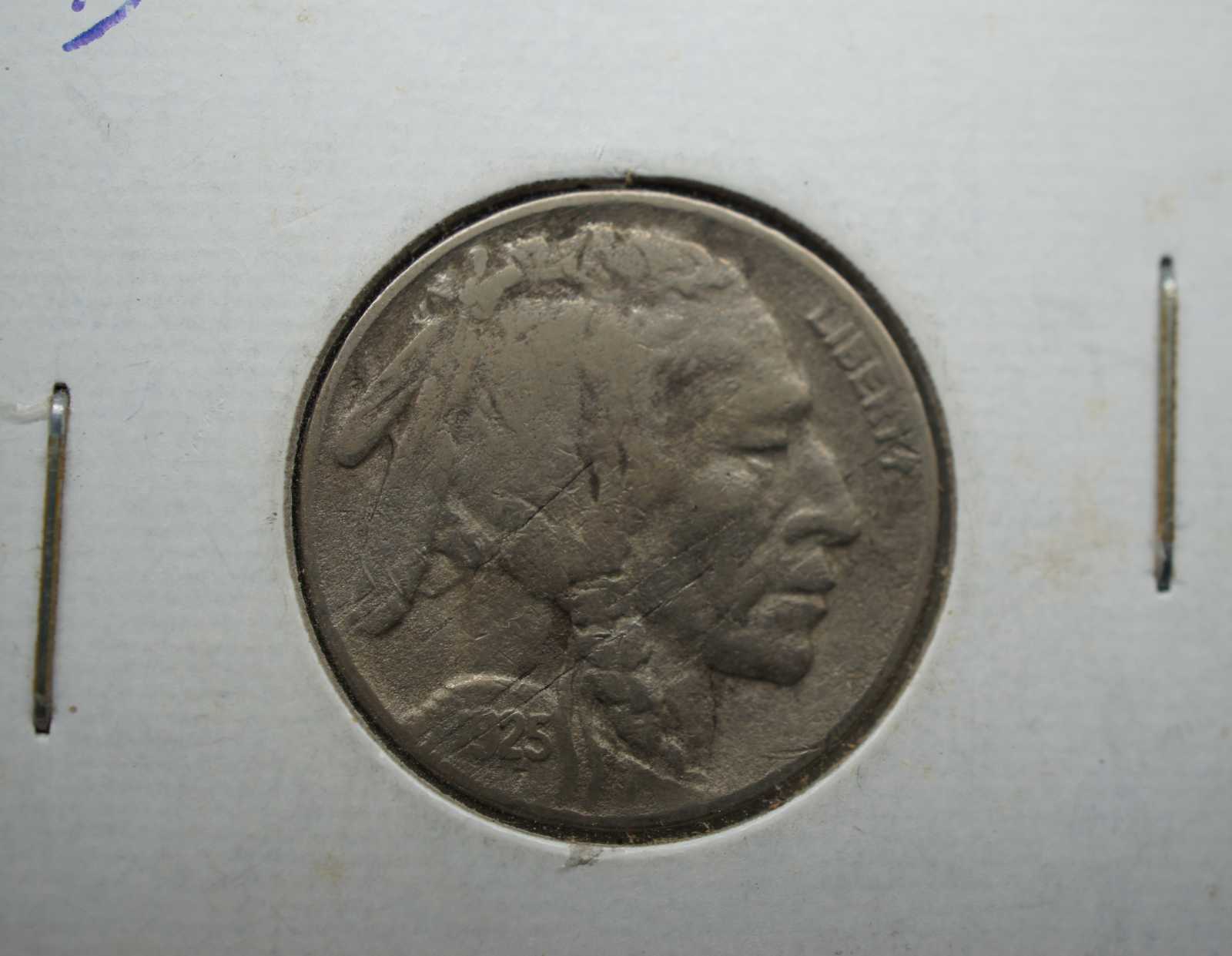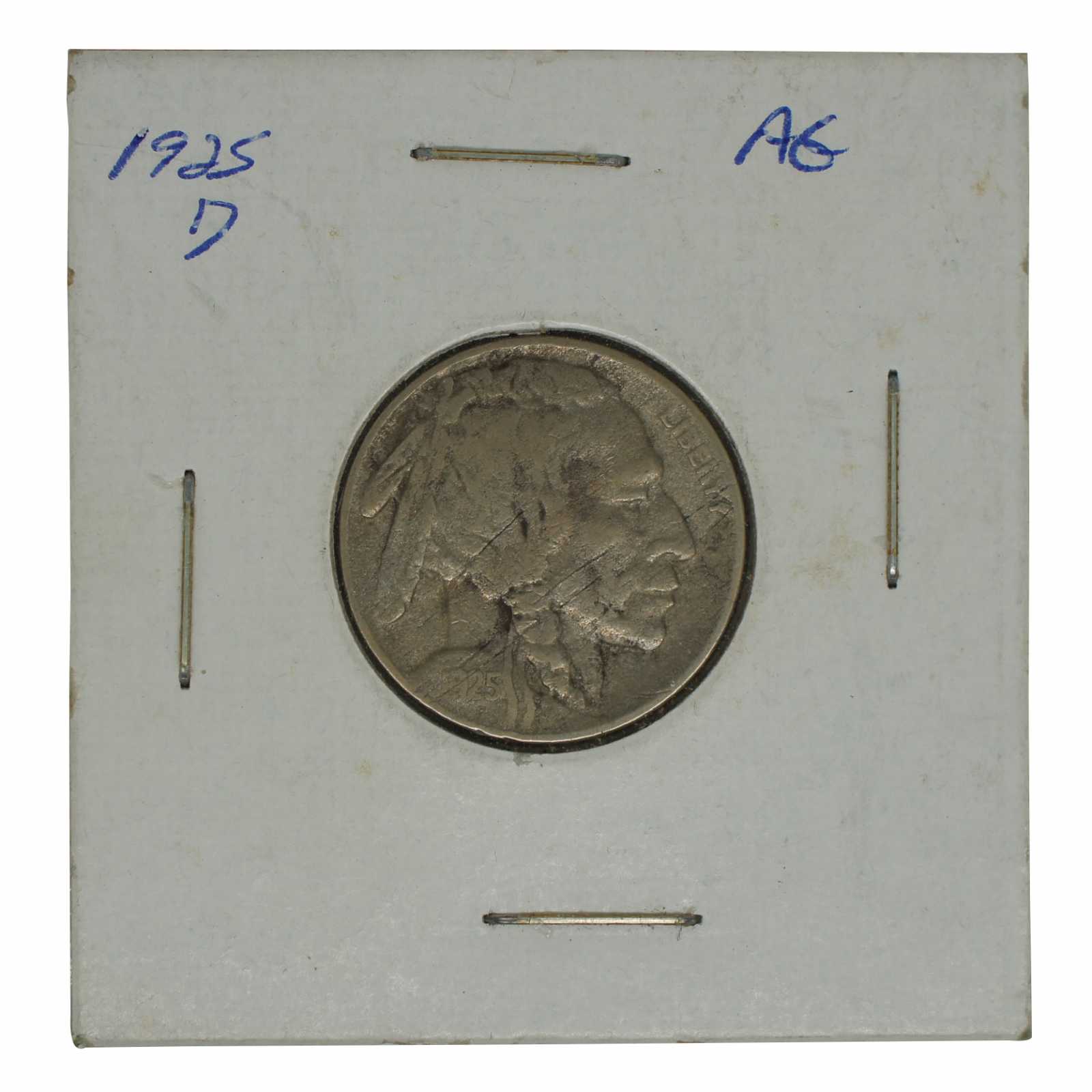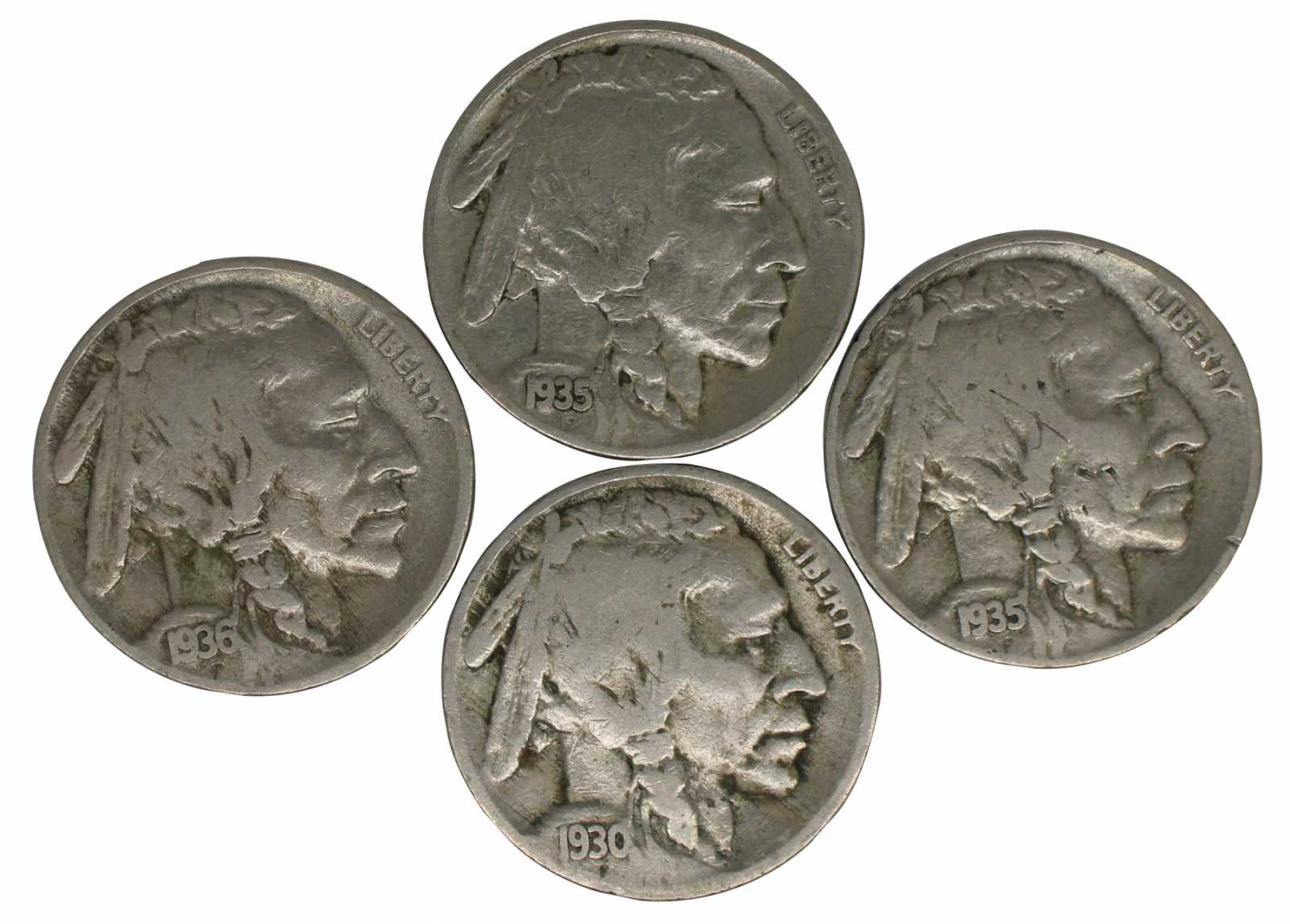 Lot of five Indian head/buffalo nickels. Obverse: the head of a Native American, facing right, with feathers and braids in his hair; the year on his shoulder; the word “Liberty” on the edge by his eyes. Reverse: a buffalo/bison, facing left; the words “United States of America” along the top edge, “Five Cents” centered on the bottom edge, and “E Pluribus Unum” above the bison’s back. Years included: 1925-D, 1930, 1935, and 1936.