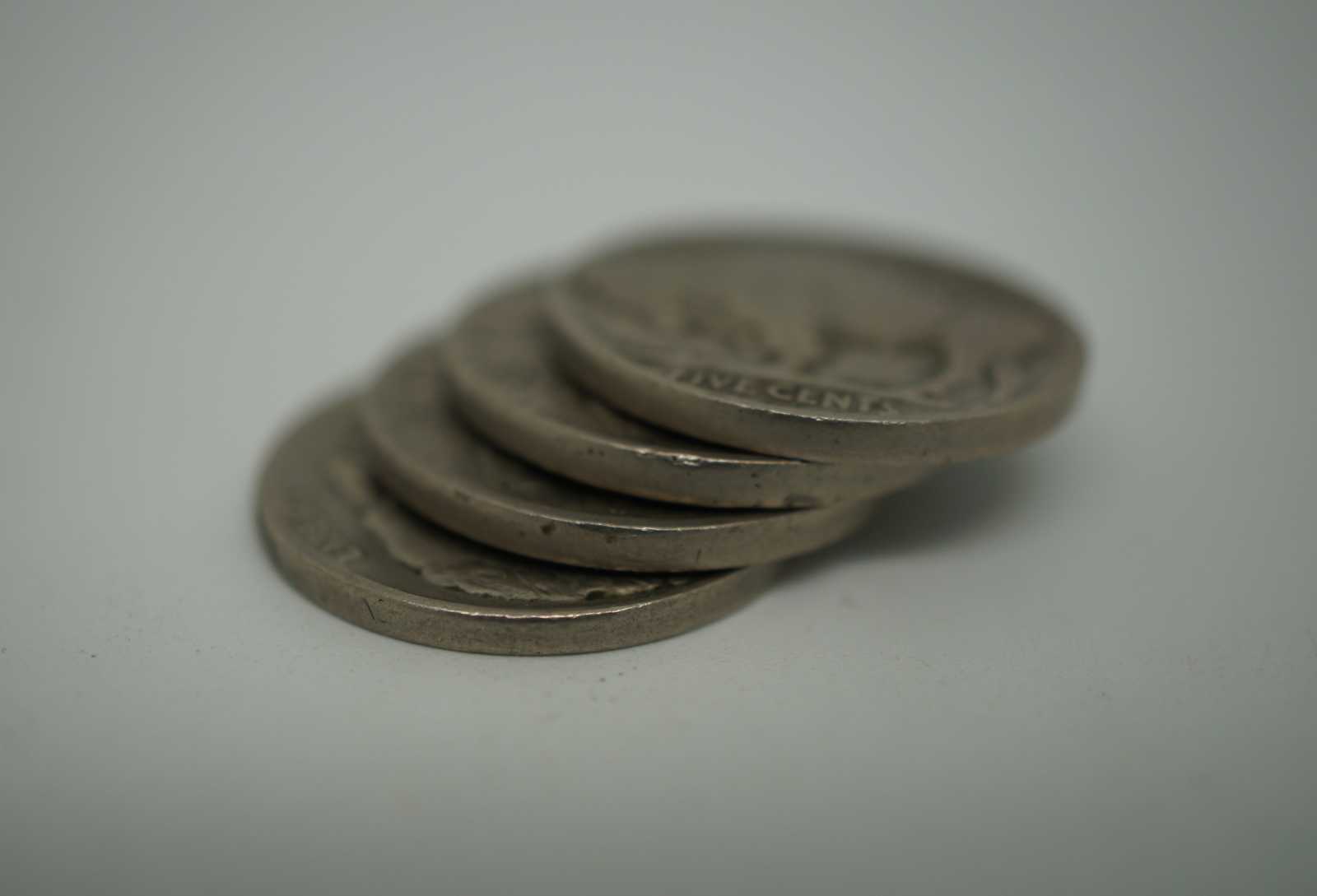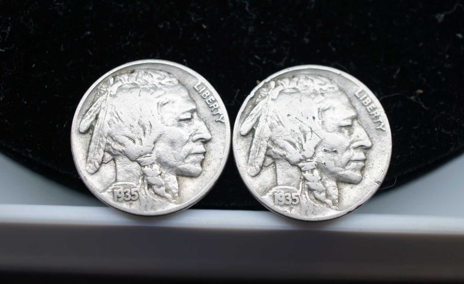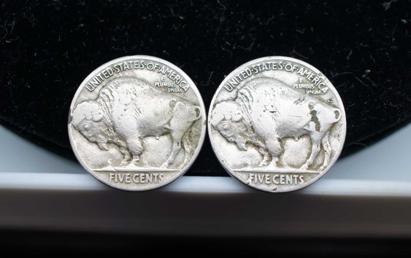Lot of five Indian head/buffalo nickels. Obverse: the head of a Native American, facing right, with feathers and braids in his hair; the year on his shoulder; the word “Liberty” on the edge by his eyes. Reverse: a buffalo/bison, facing left; the words “United States of America” along the top edge, “Five Cents” centered on the bottom edge, and “E Pluribus Unum” above the bison’s back. Years included: 1925-D, 1930, 1935, and 1936.