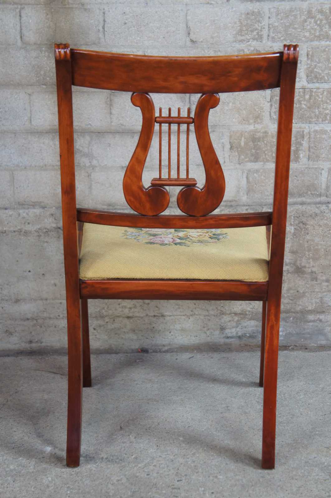 Pair of two antique R.H Macy & Co. side chairs. Circa 1900s. Made of cherry, featuring a yellow floral needlepoint embroidered seat and harp back.