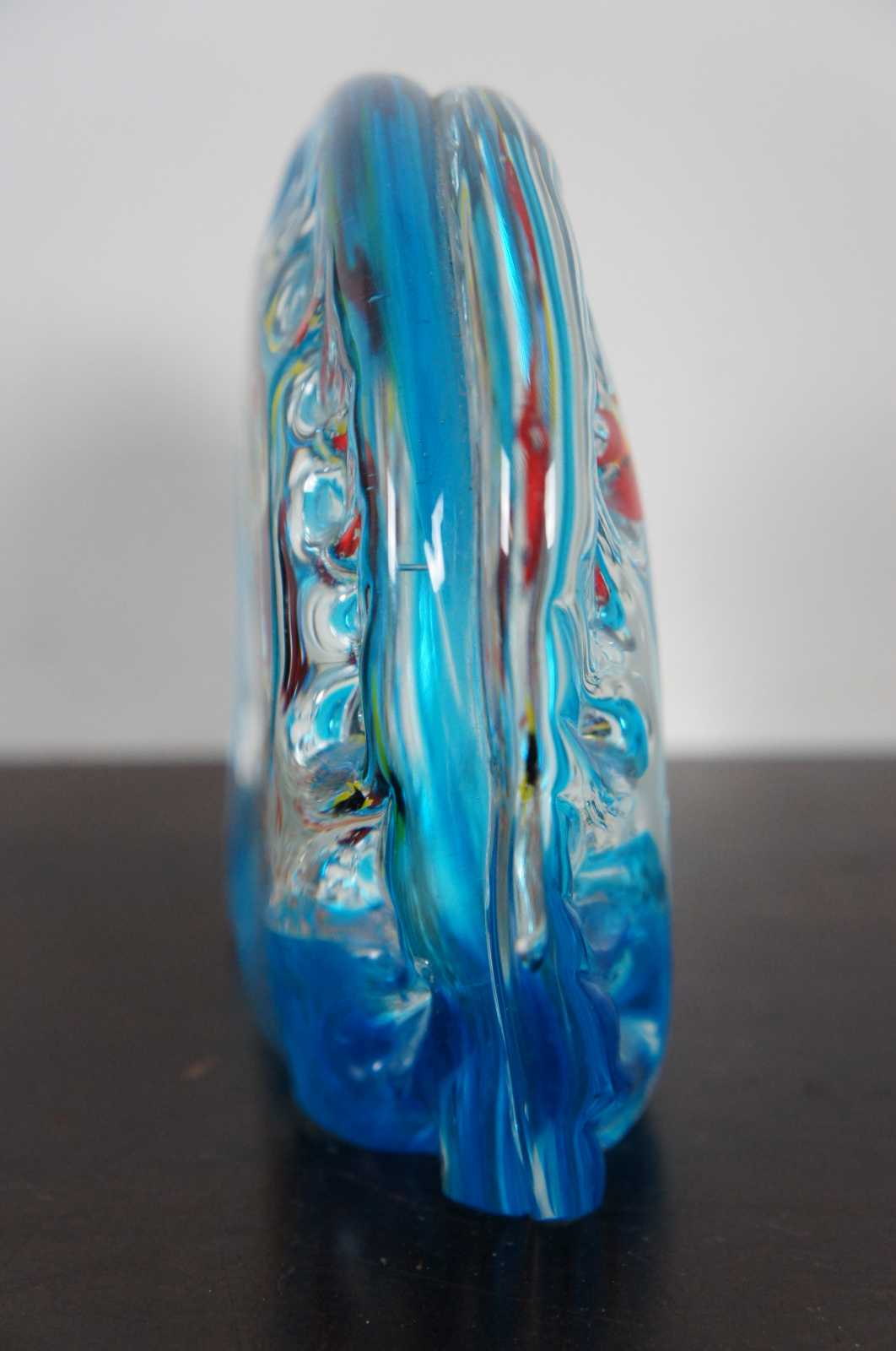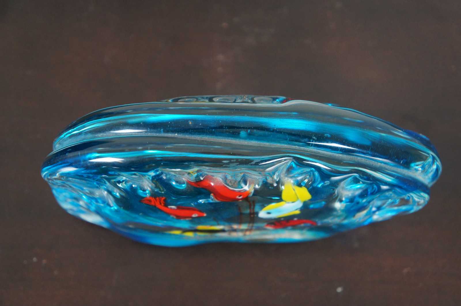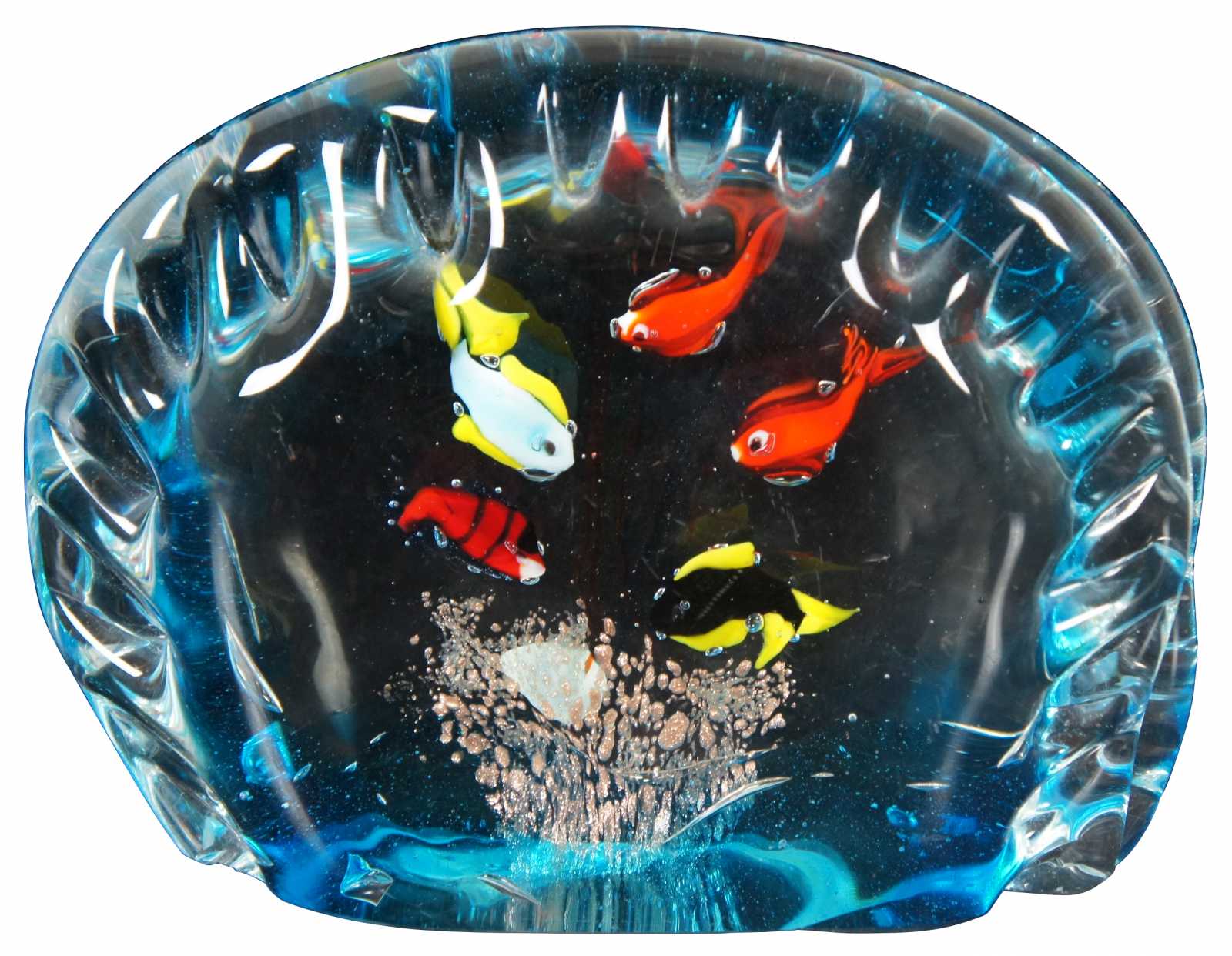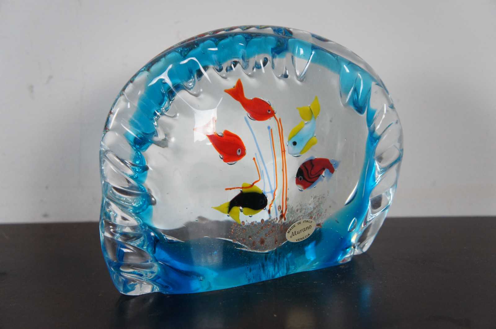 Italian art glass fish bowl paperweight, made in Murano with five fish. With original sticker Made in Italy Murano Venezia.
