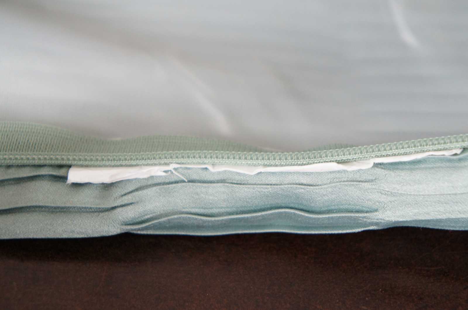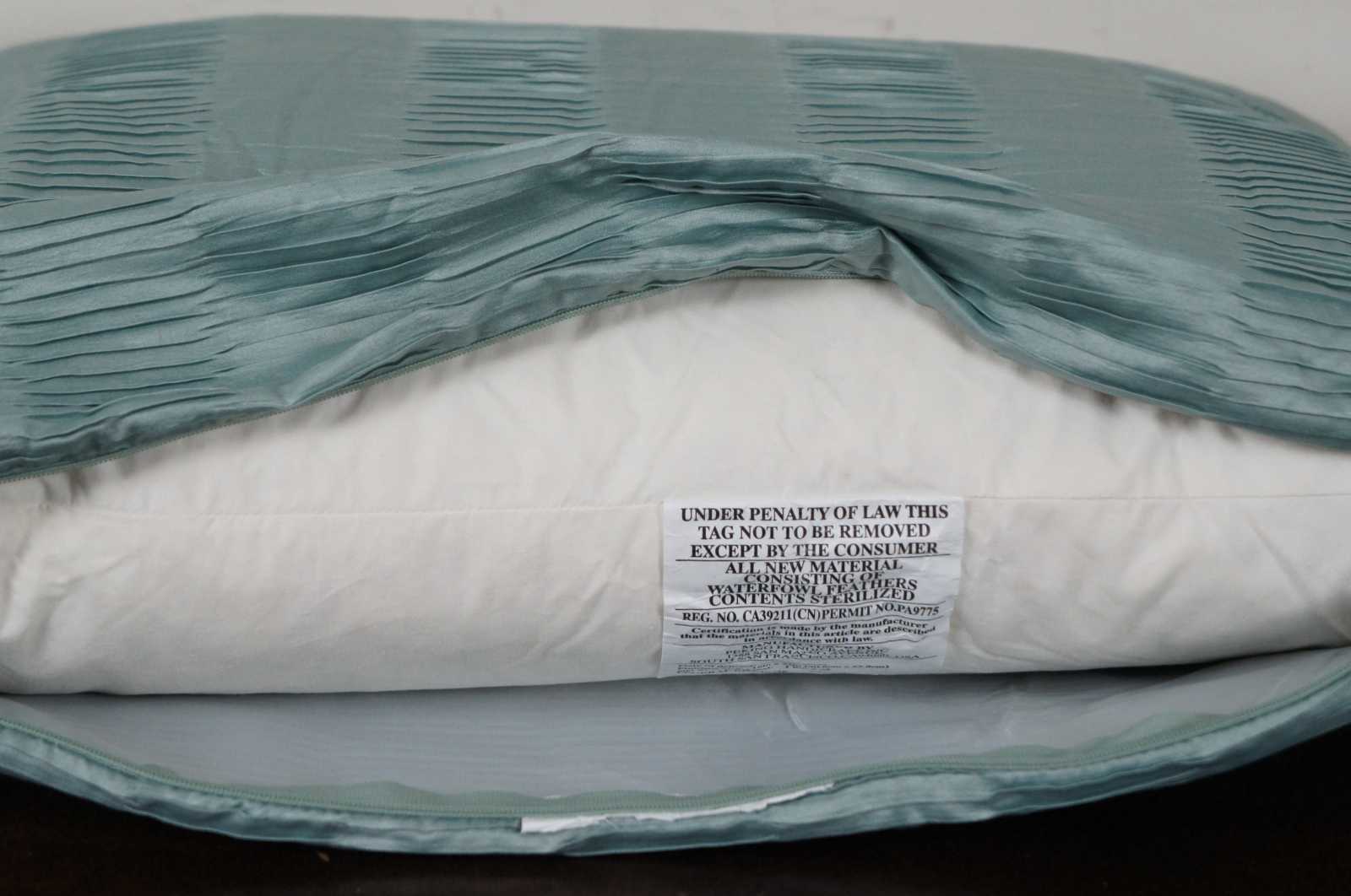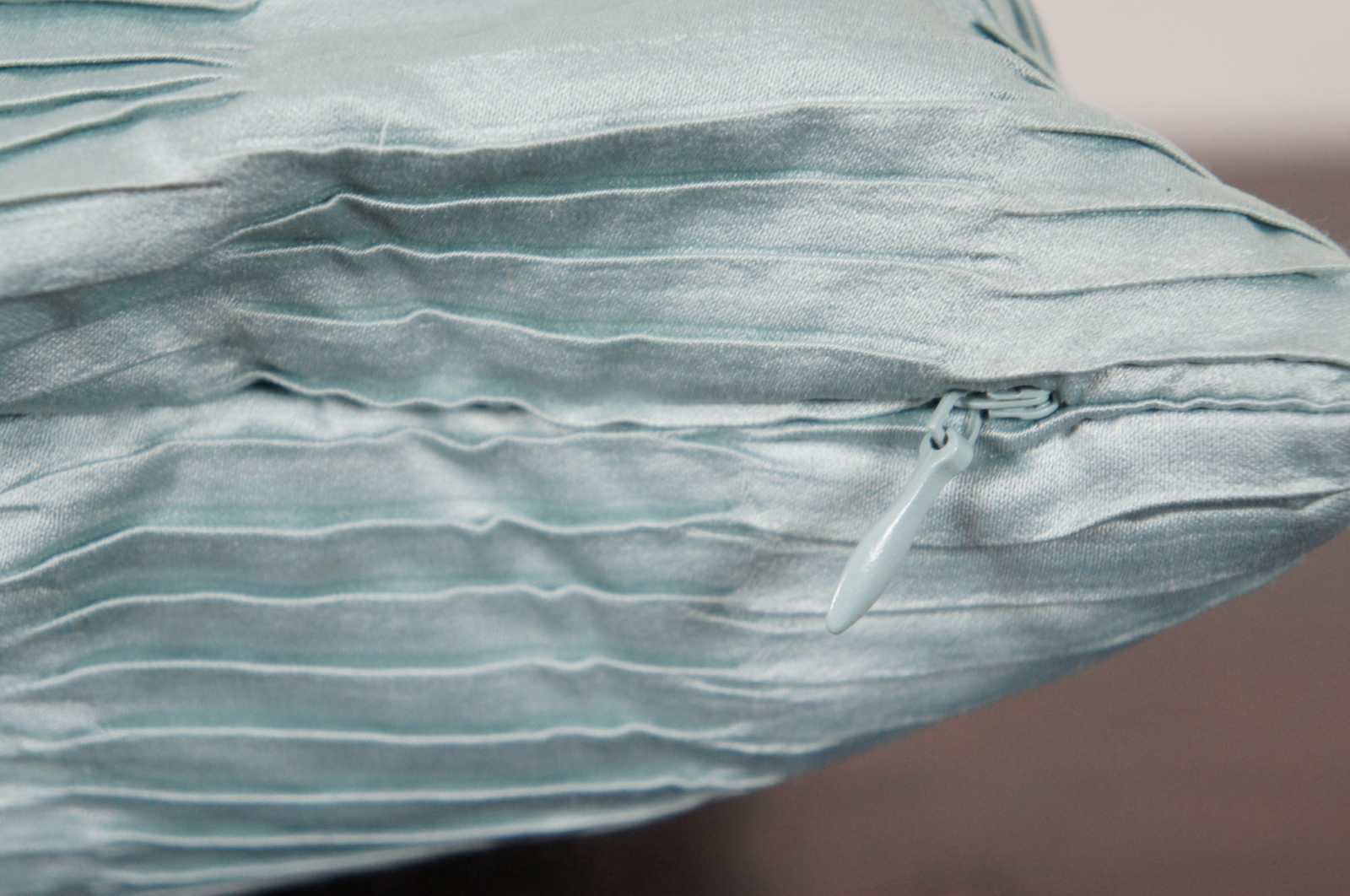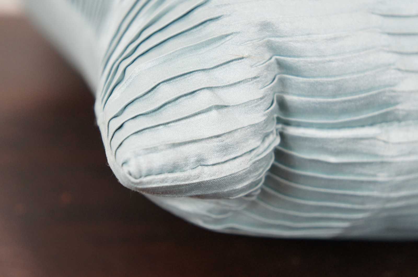 Light turquoise silk rectangular down filled throw pillow in a pattern of ruched stripes.