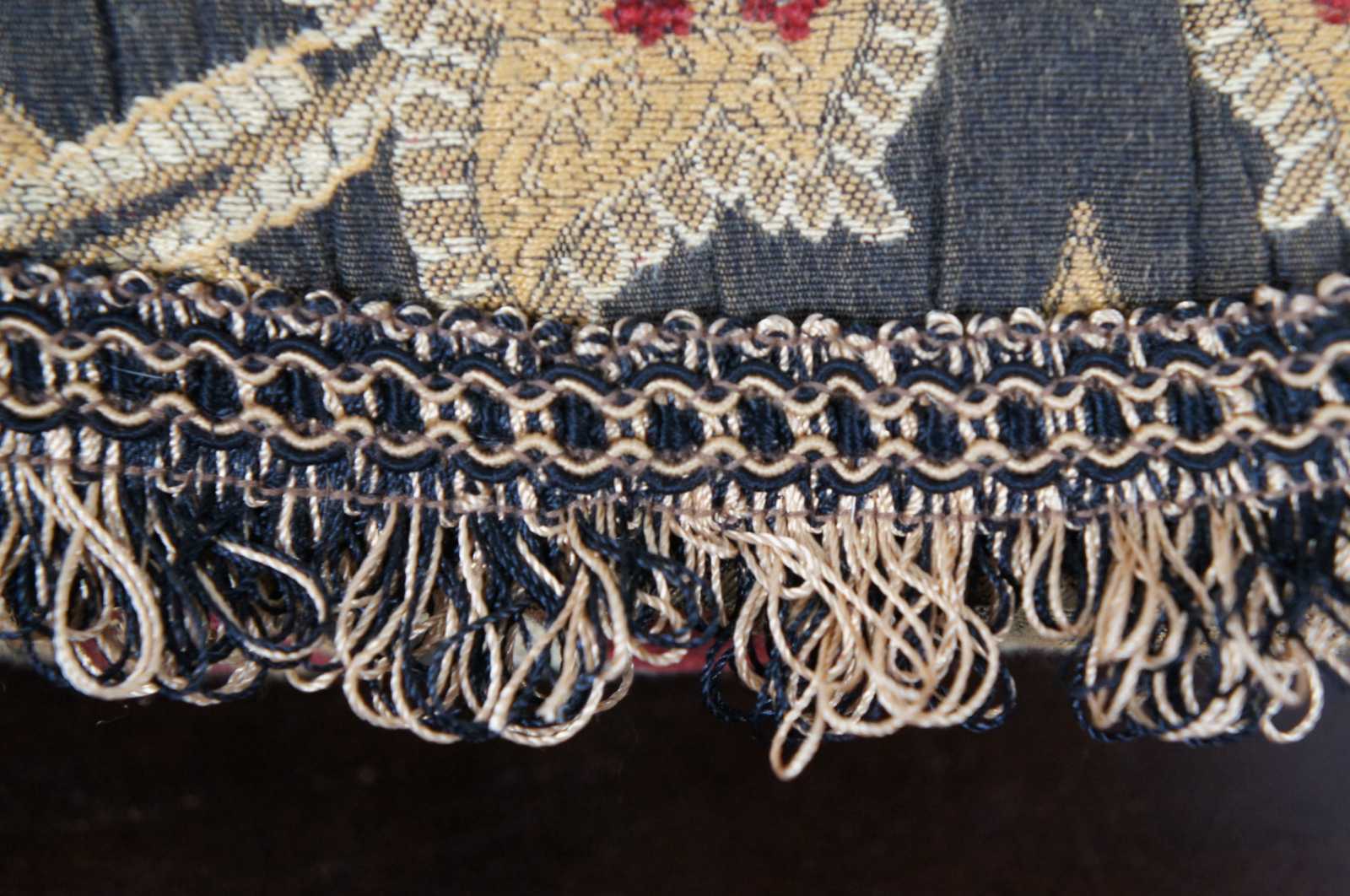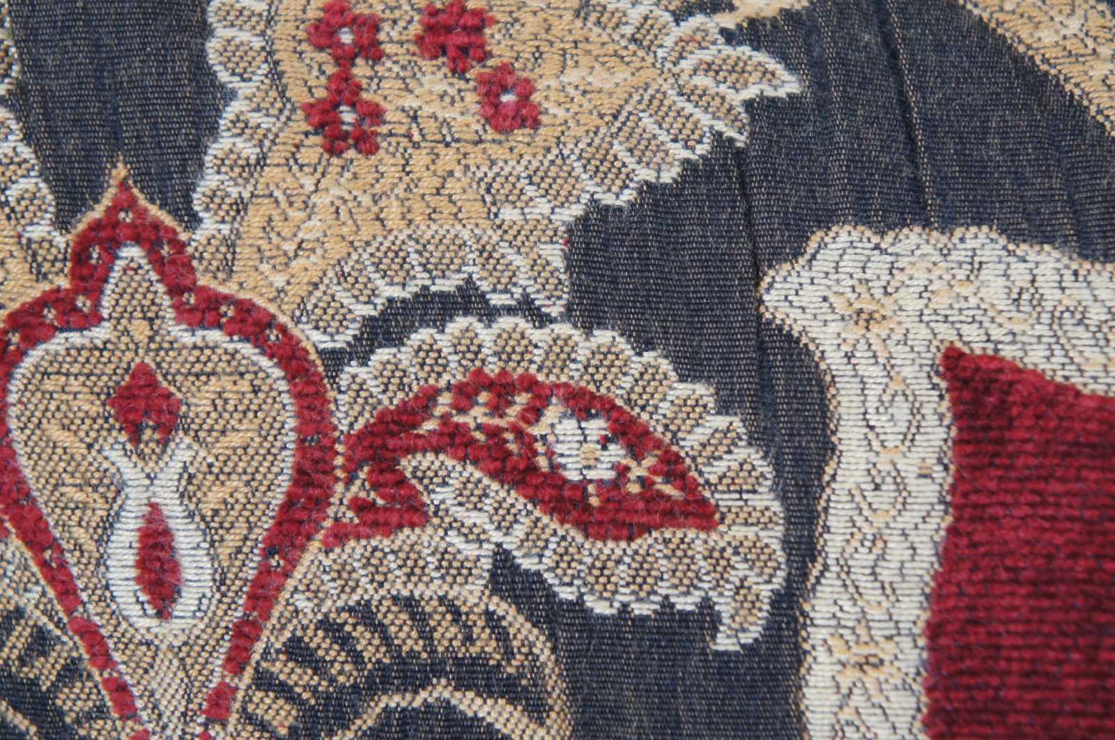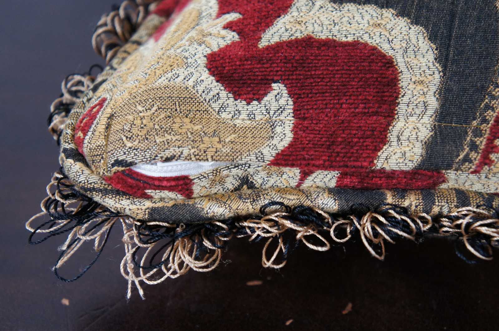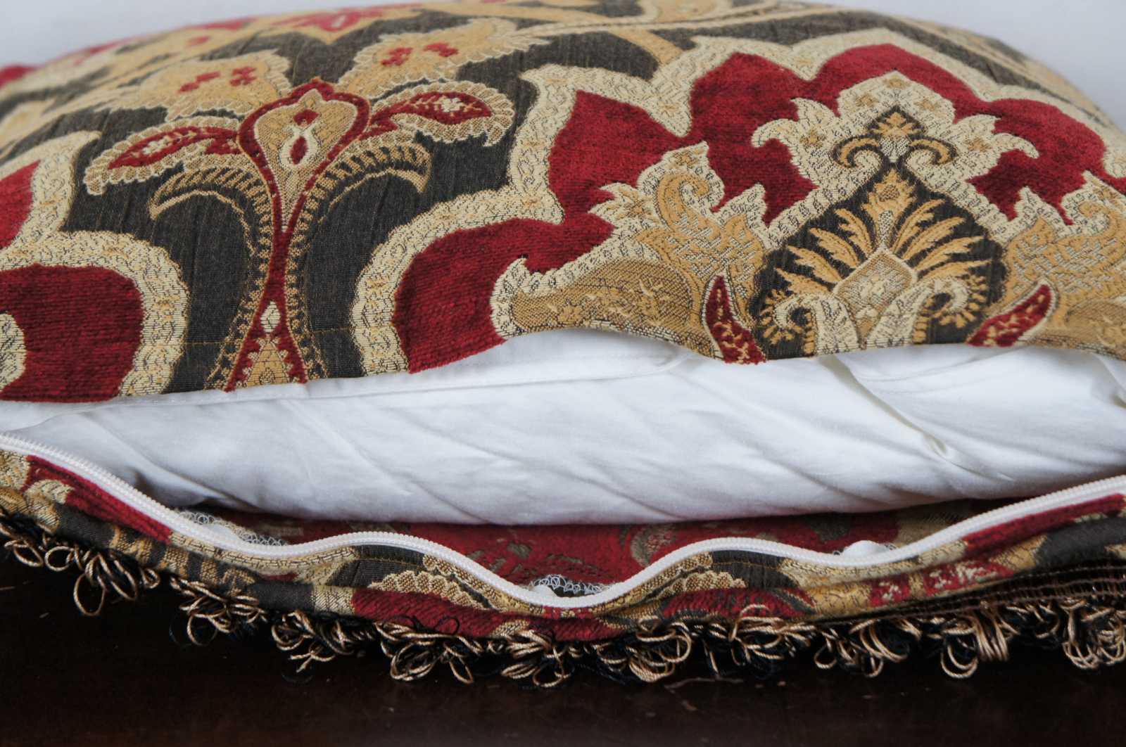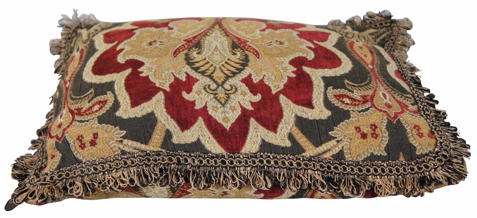 Red, gold and gray jacquard floral throw pillow with black and gold fringed edge and fiber filled form.