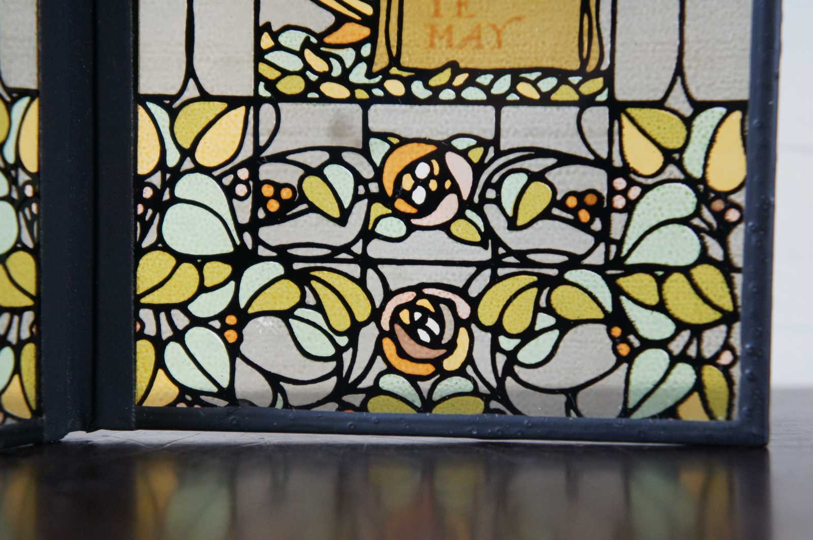 Vintage stained glass window diptych featuring two art nouveau style women with the phrase “Gather ye rosebuds while ye may,” a reproduction of works by Alexander Gascoyne. Born in 1877, Alexander Gascoyne ran an ‘Ecclesiastical artist’s business’ established by his father George Frederick in Nottingham, England. He became well known as a designer of stained glass and has numerous windows in English churches. He was a member of the British Society of Master Glass Painters and exhibited at the Royal Academy. He died in 1927.