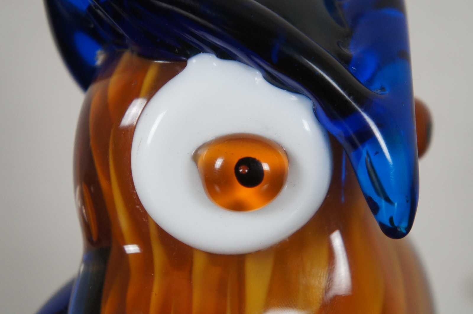 Vintage studio art glass figurine in the shape of a great horned owl with a swirling orange chest and blue wings and face.