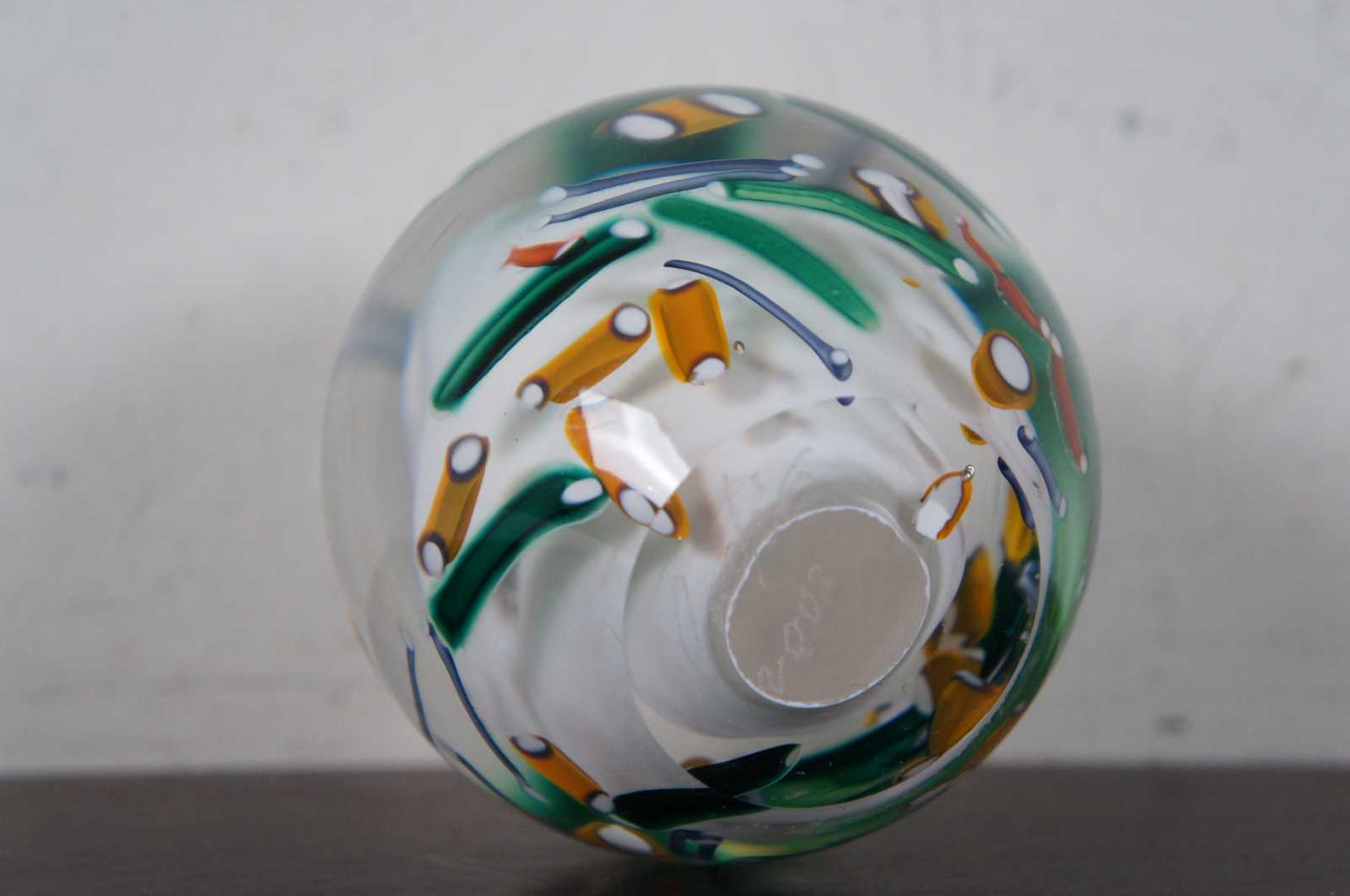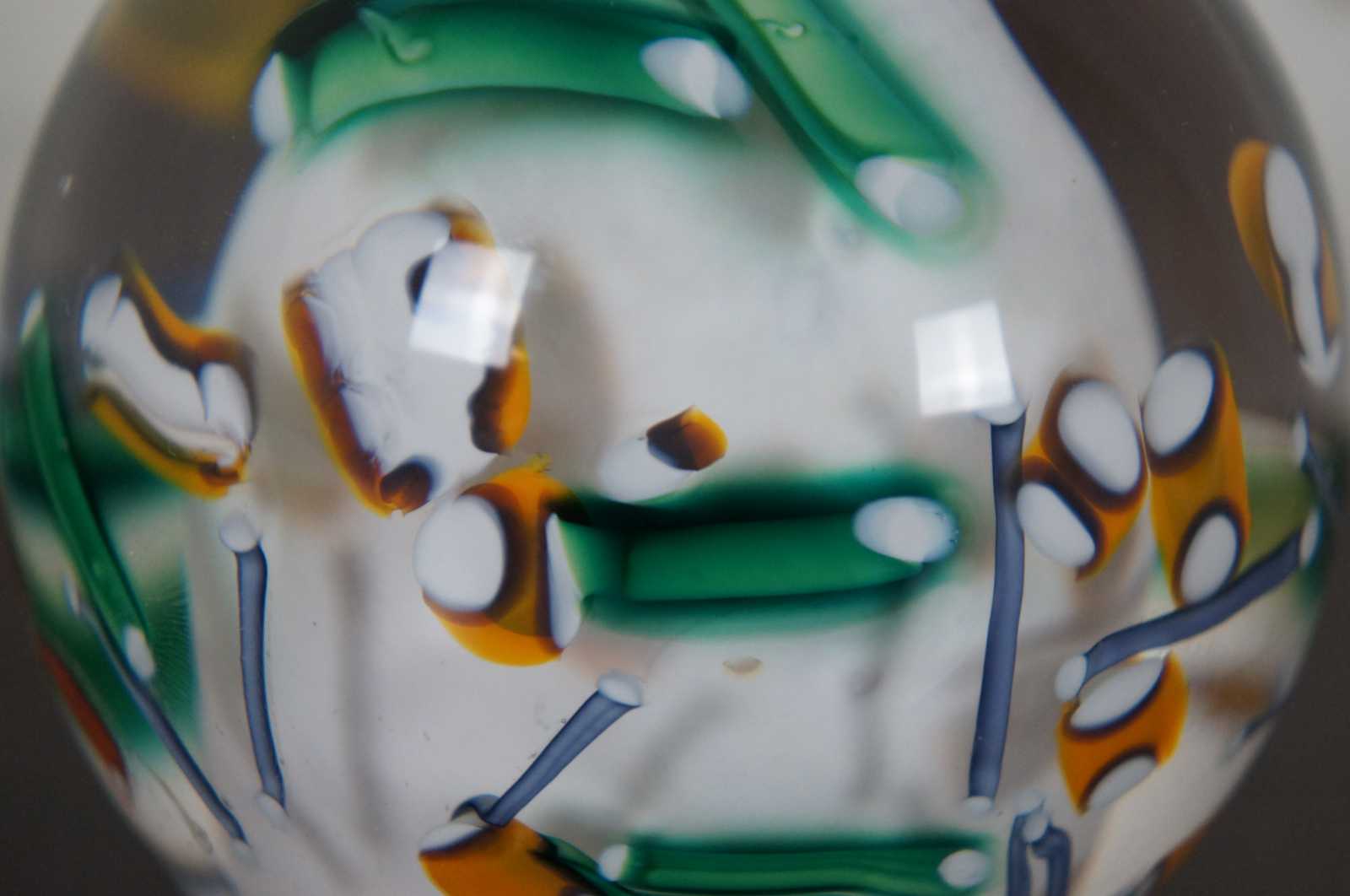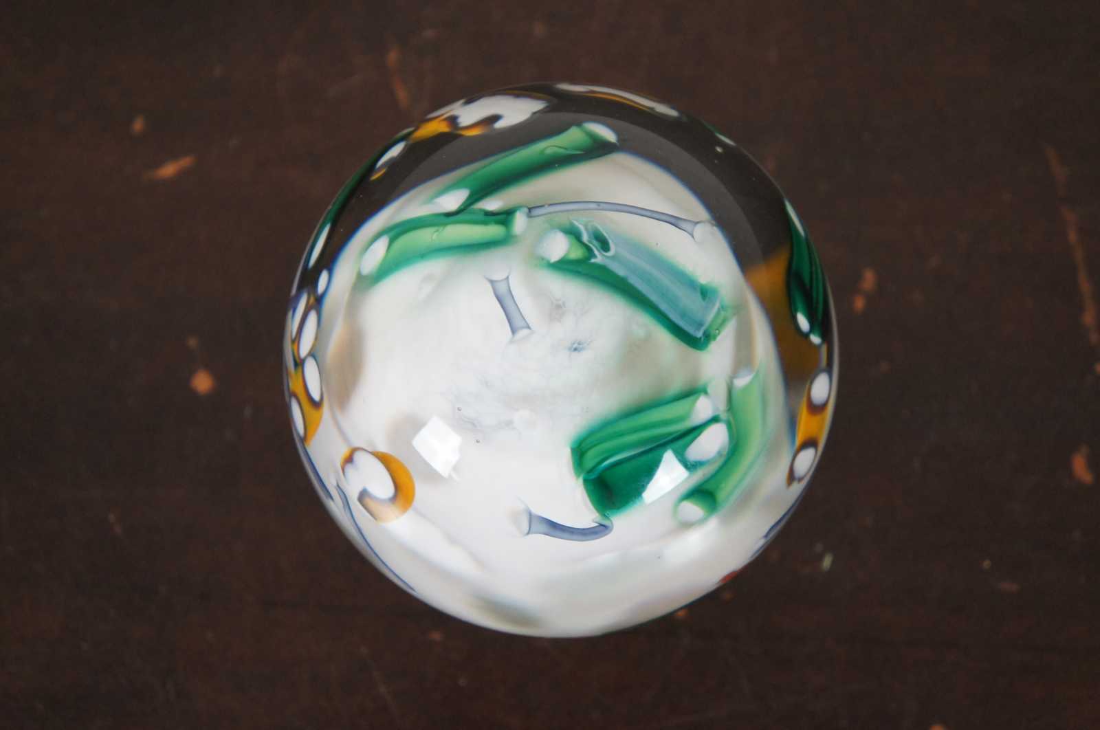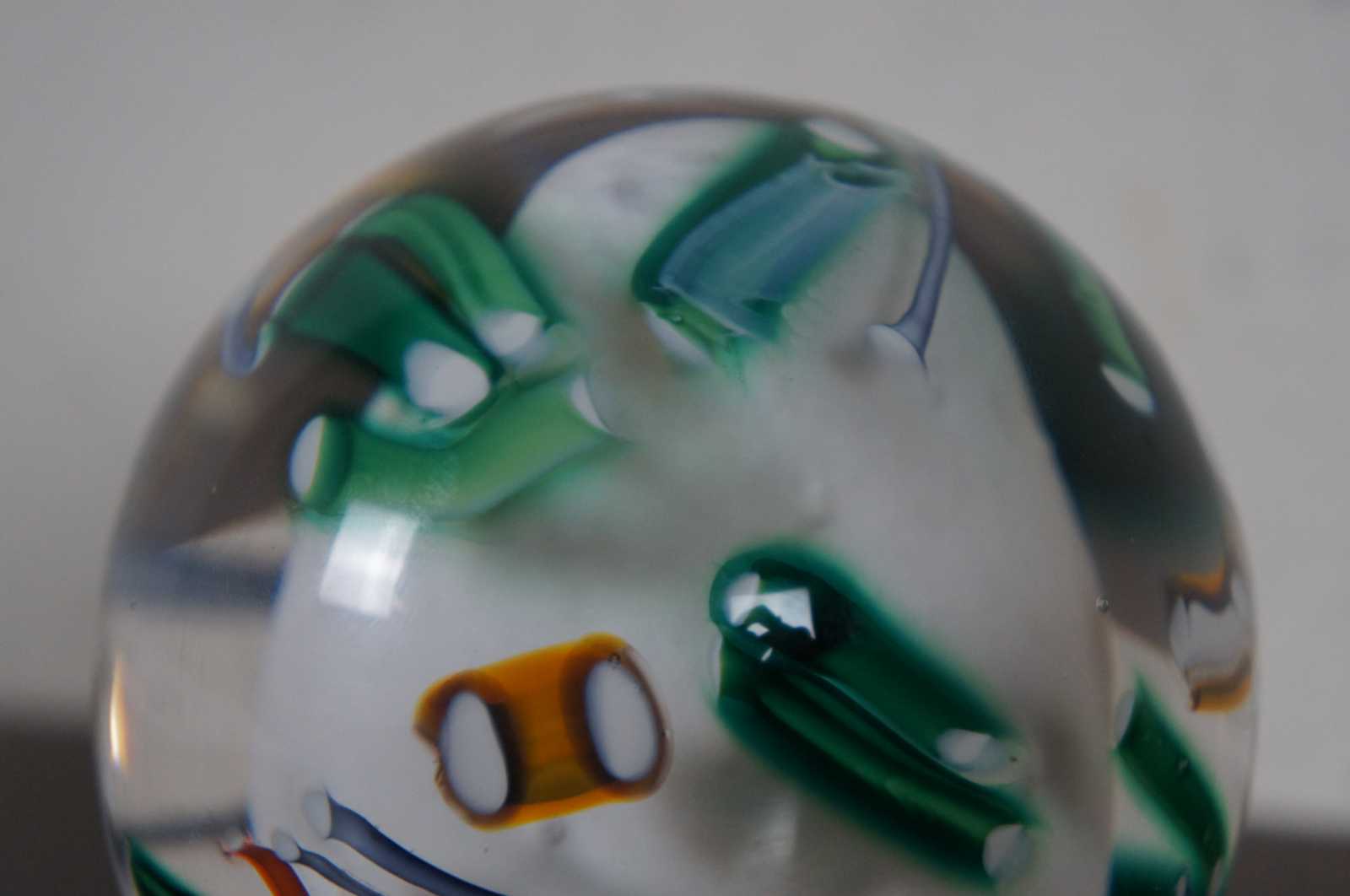 Vintage 2002 signed art glass paperweight orb featuring abstract shapes in white, green, blue and orange.