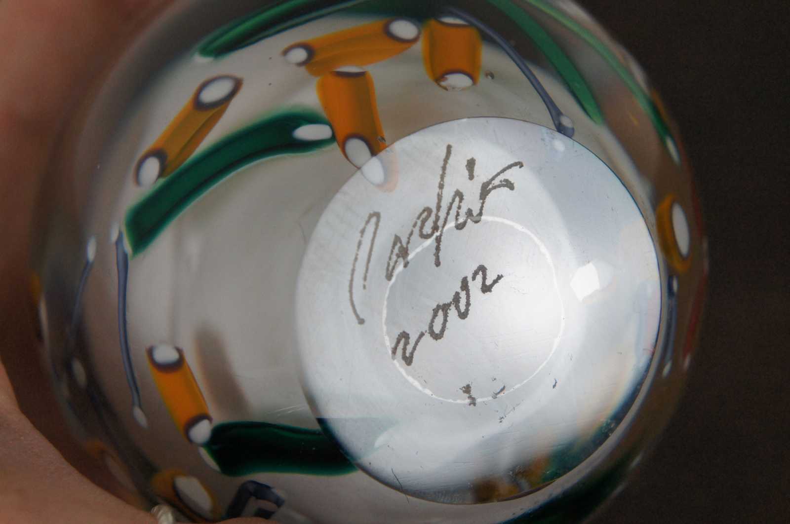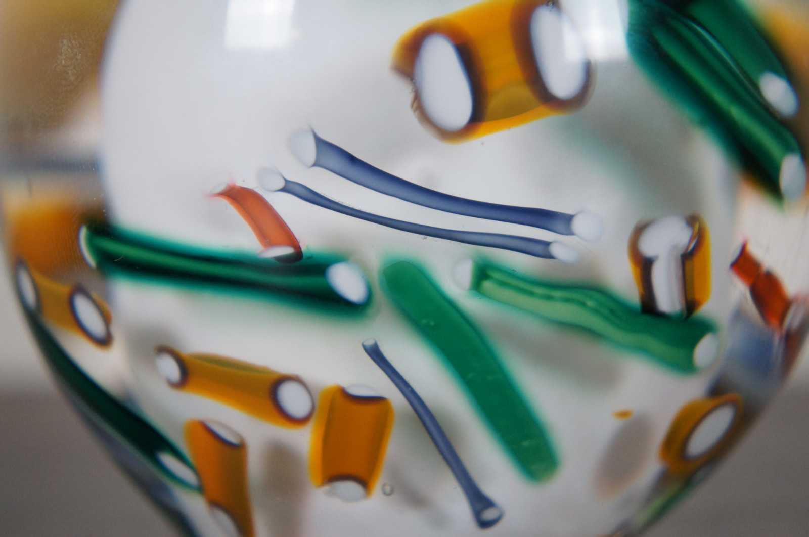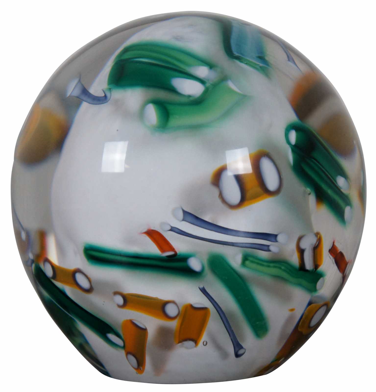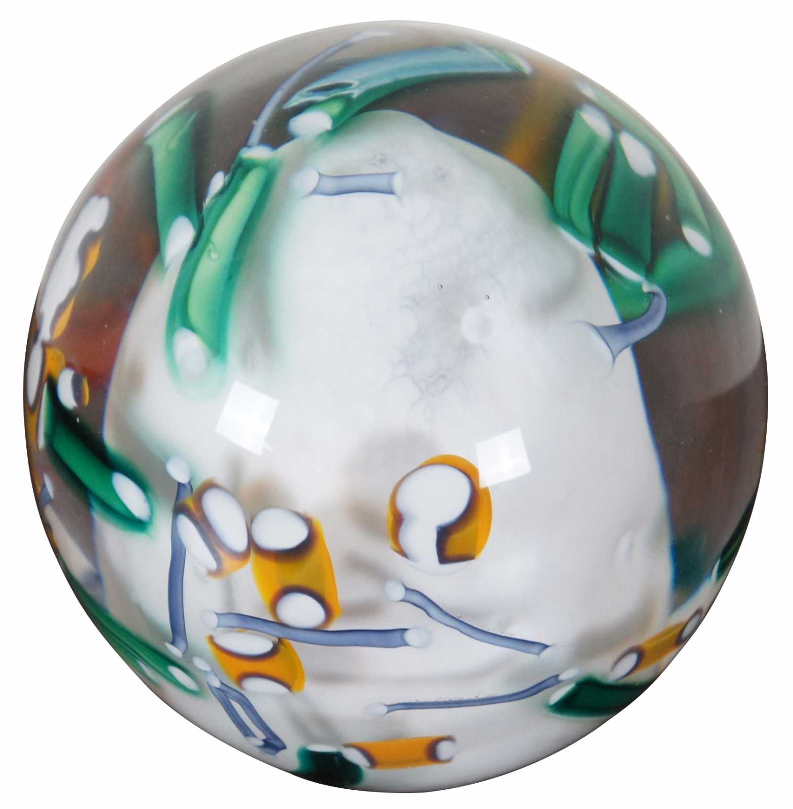 Vintage 2002 signed art glass paperweight orb featuring abstract shapes in white, green, blue and orange.