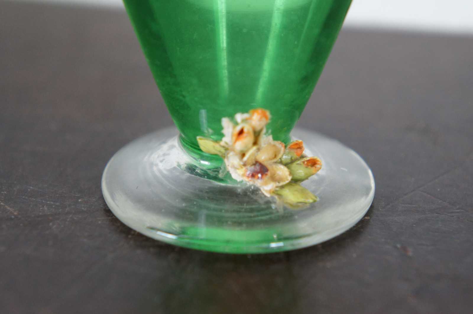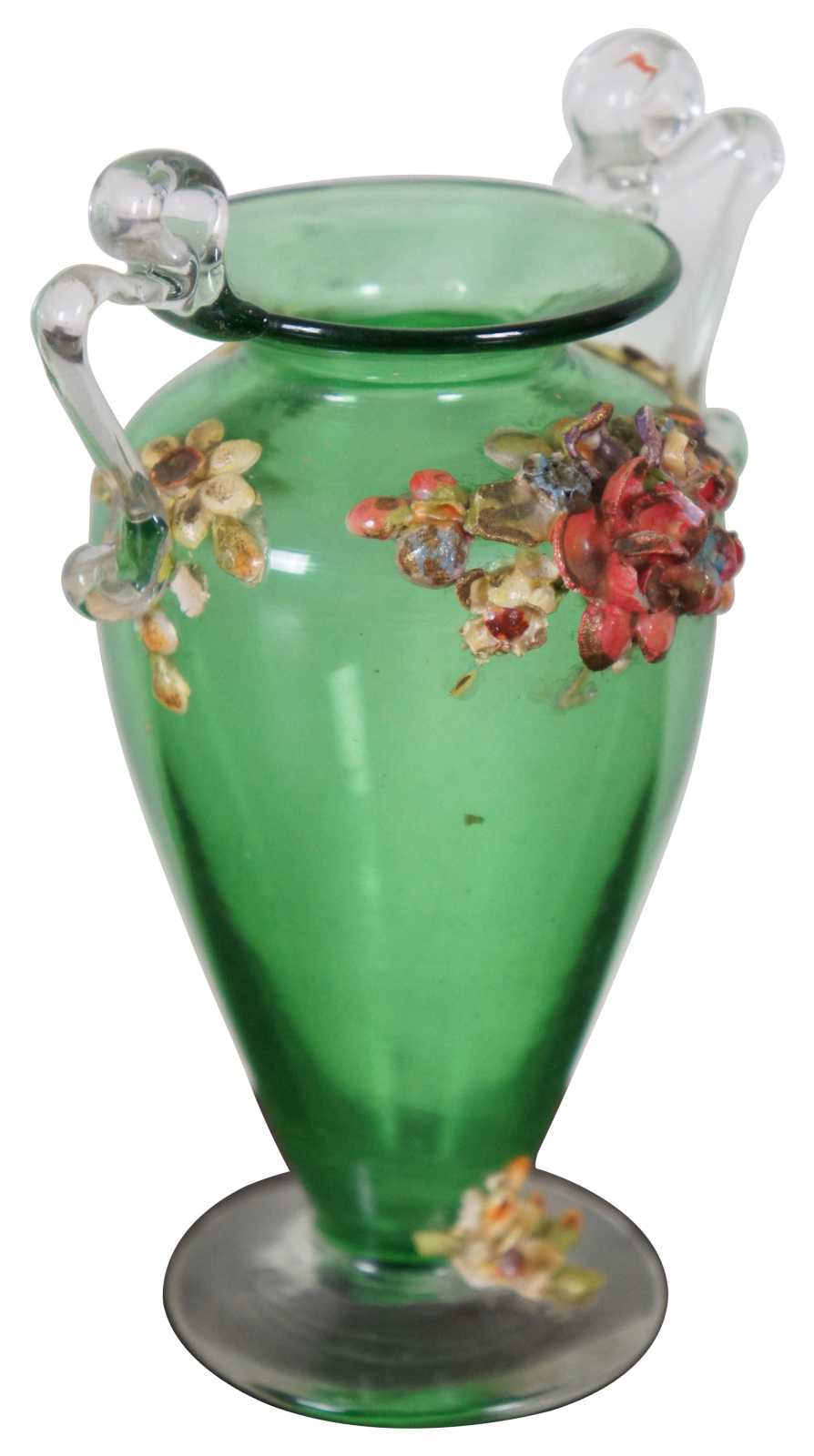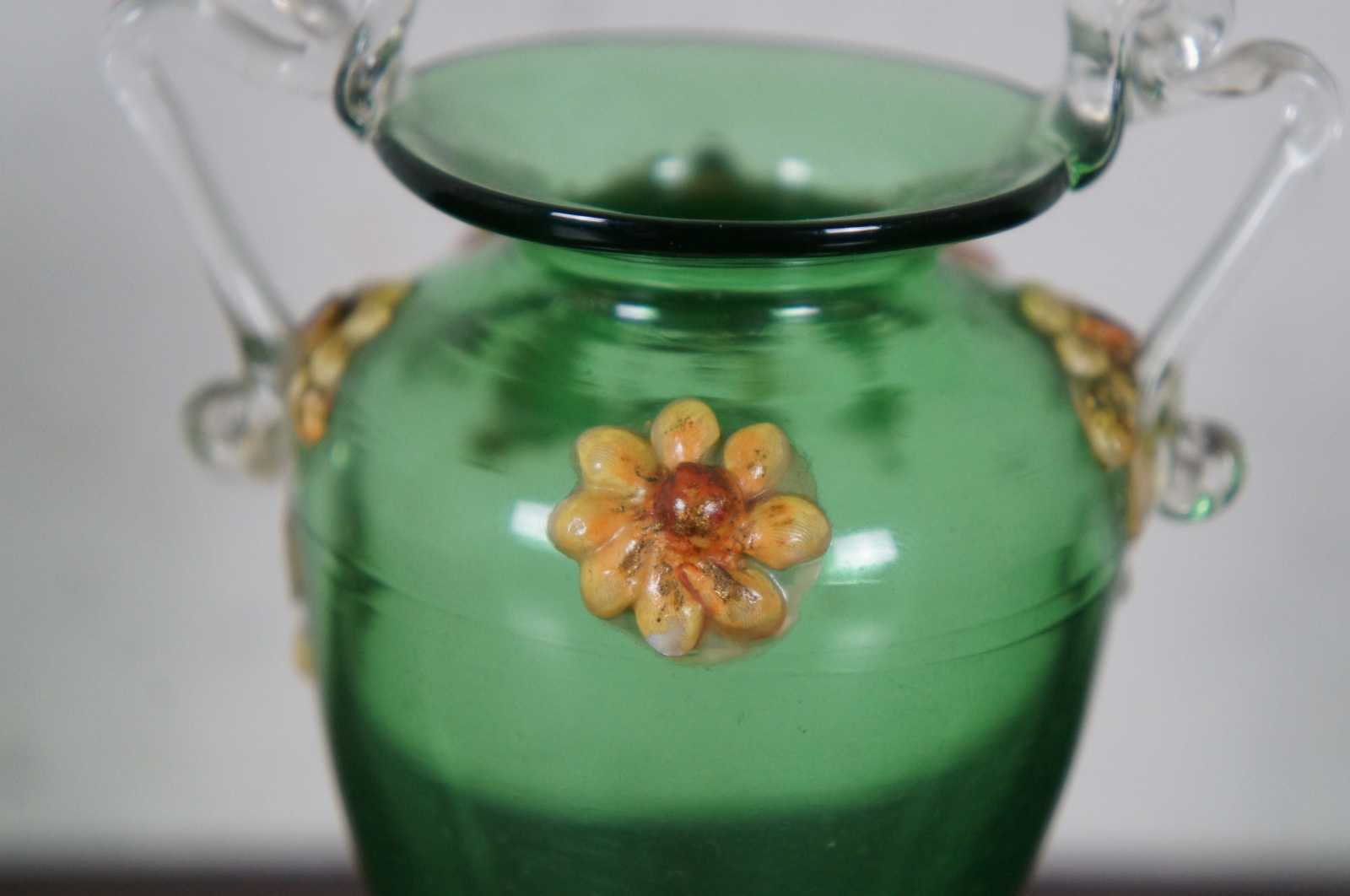 Vintage green glass trophy urn shaped bud vase with clear handles and accented with red and yellow ceramic flowers.
