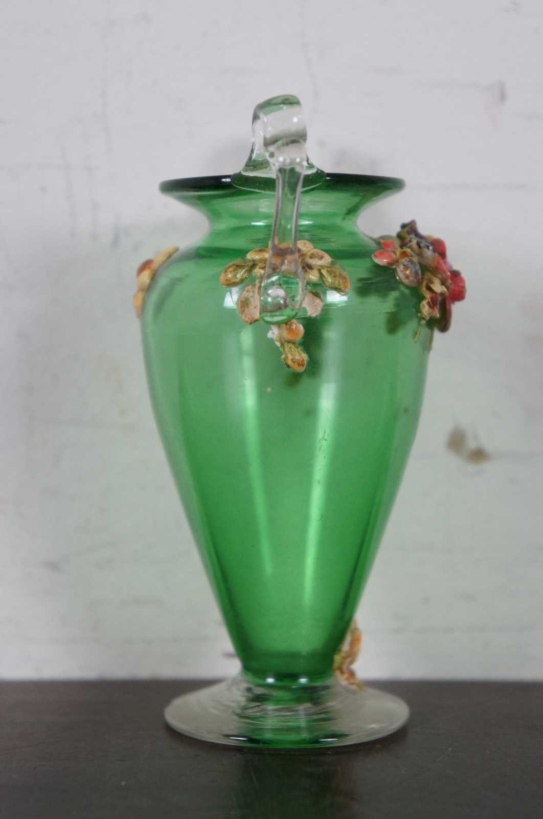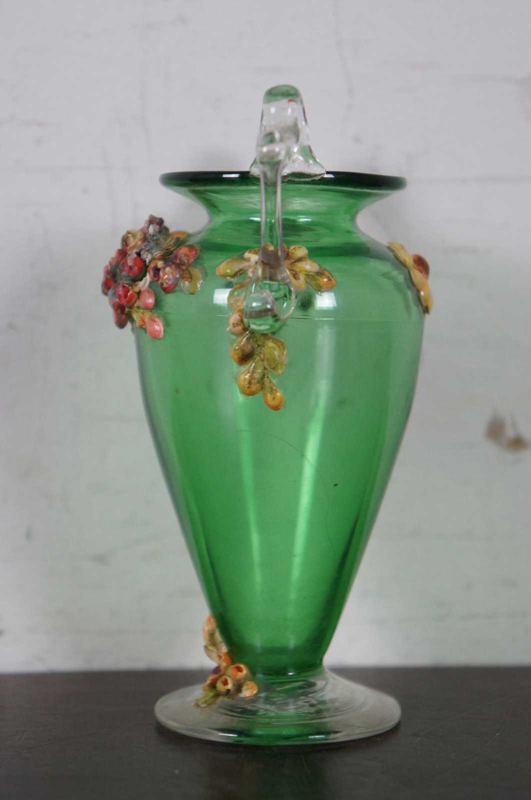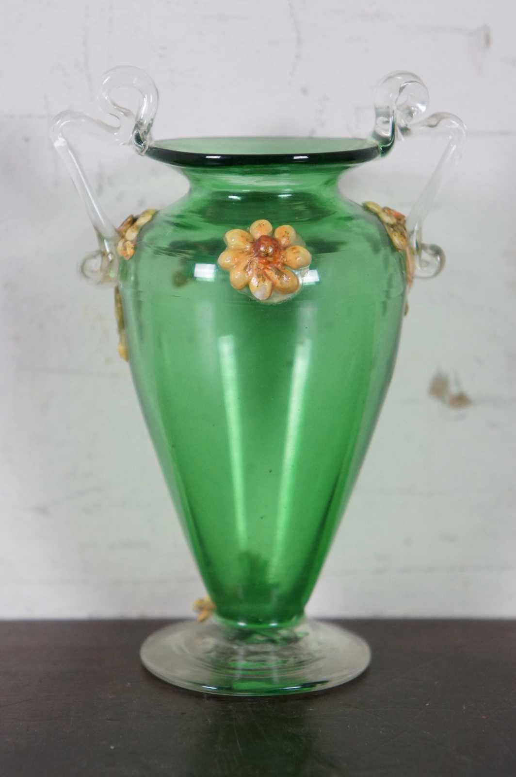 Vintage green glass trophy urn shaped bud vase with clear handles and accented with red and yellow ceramic flowers.