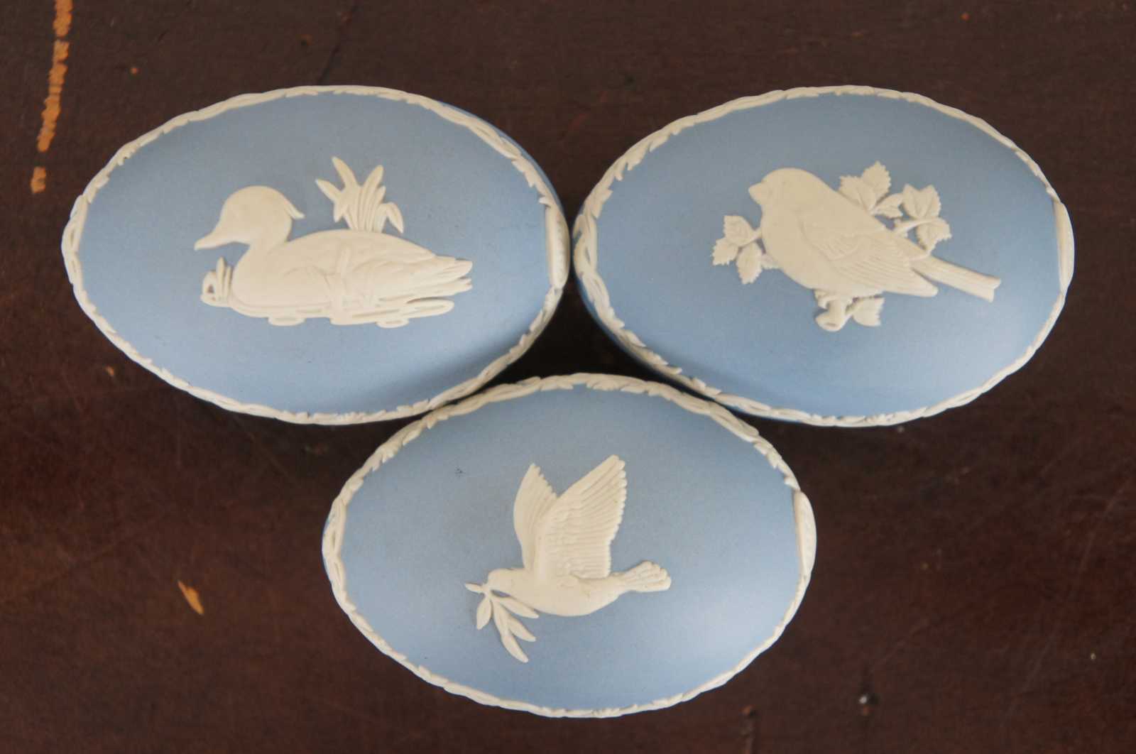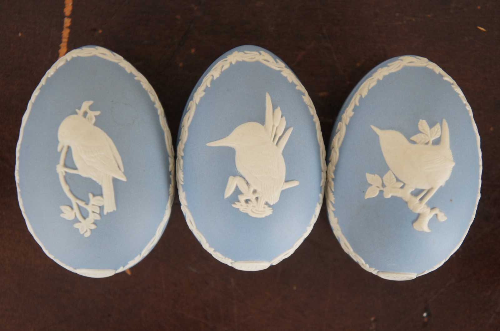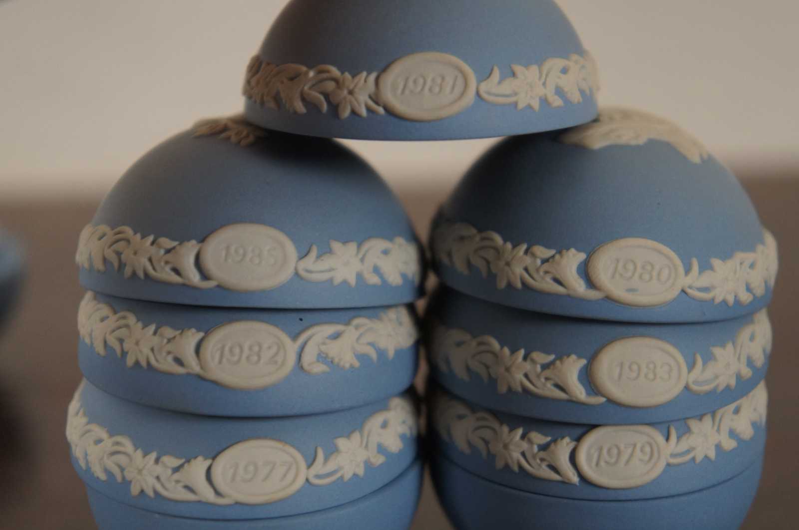 8 Wedgwood Anniversary Eggs. 1977,1979,1980,1981,1982,1983,1985. (7 Blue & 1 Yellow) Made from Porcelain with low relief animal portraits.