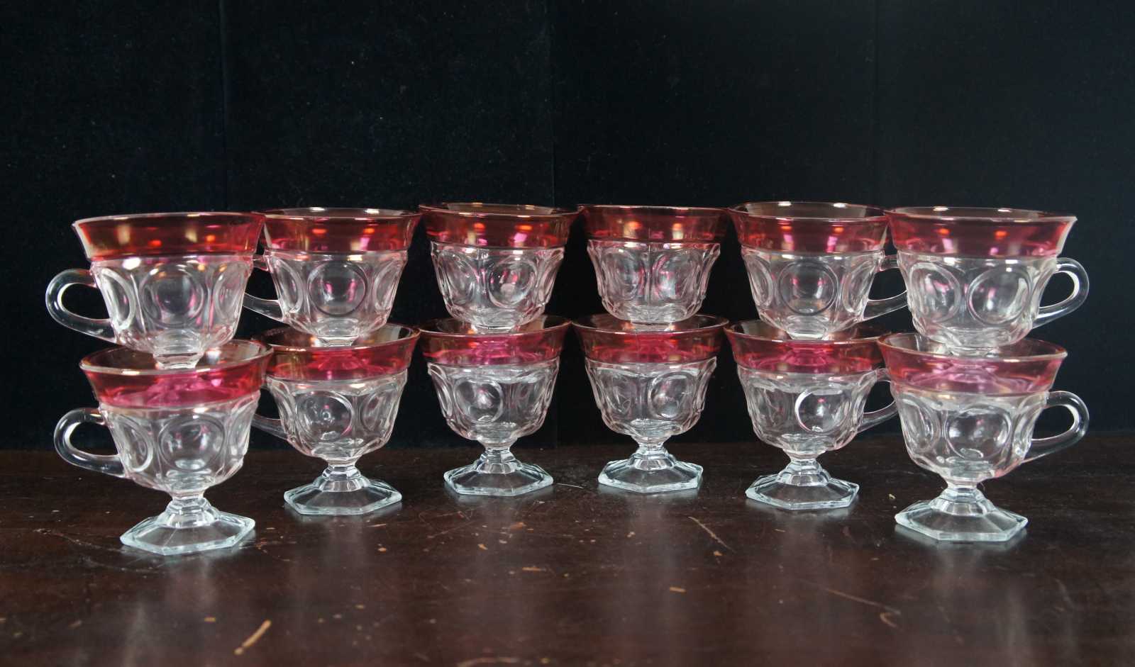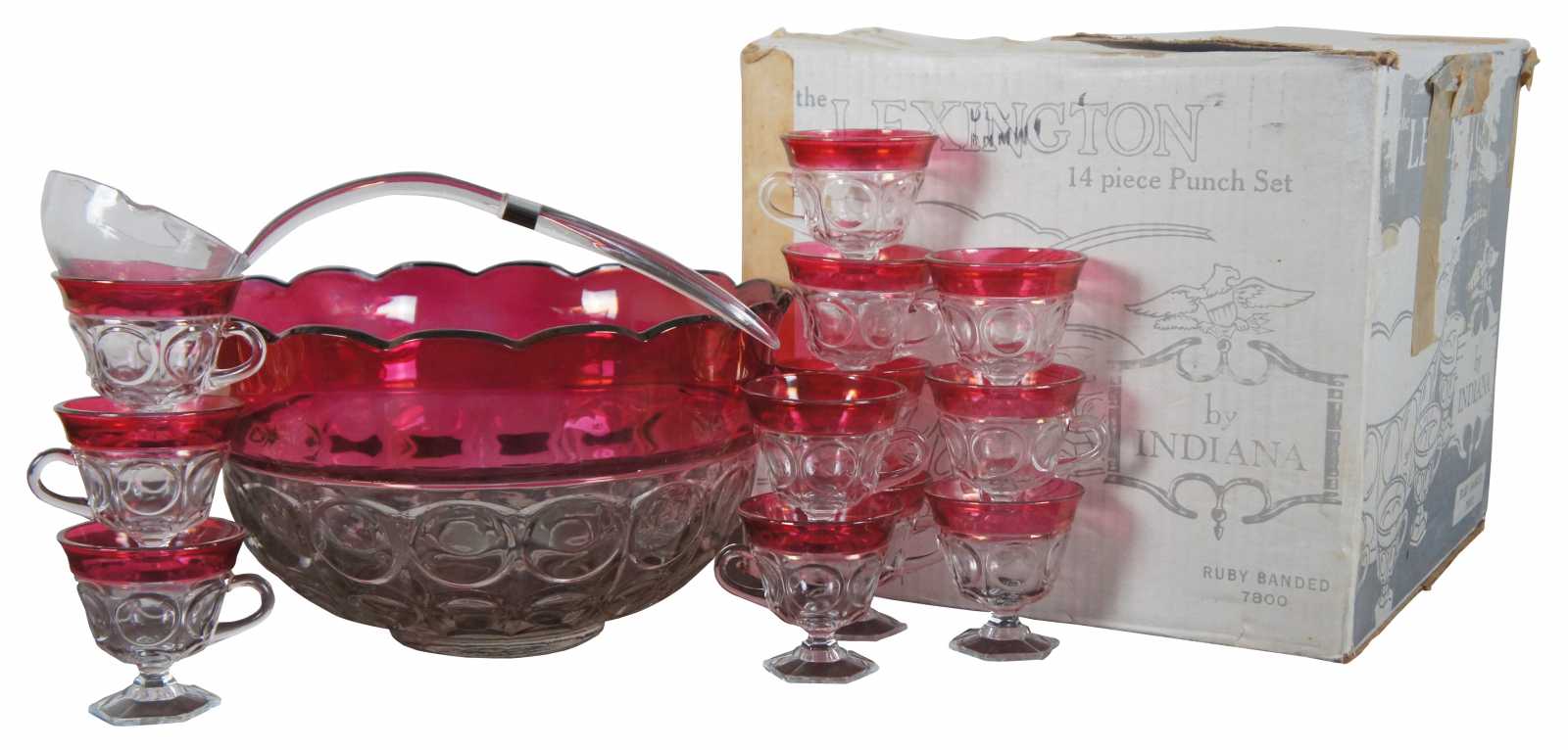 The Lexington 14 piece punch bowl, cups and ladle set by Indiana Glass in Ruby Banded thumbprint cranberry glass. Includes original box.