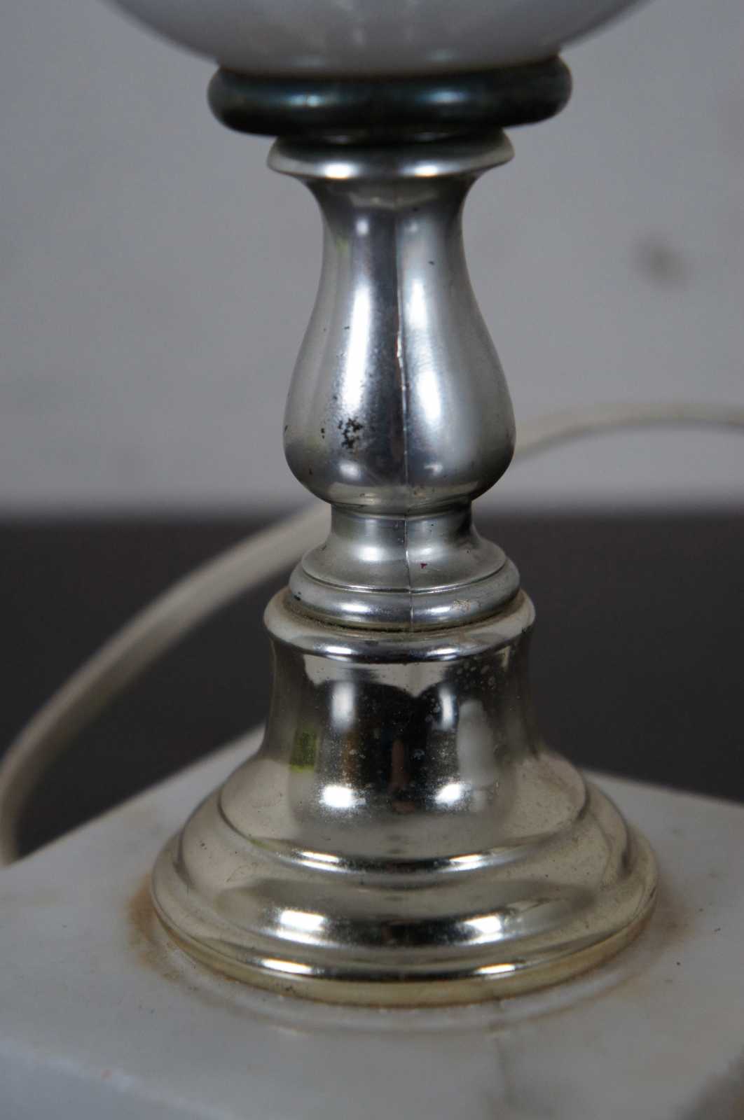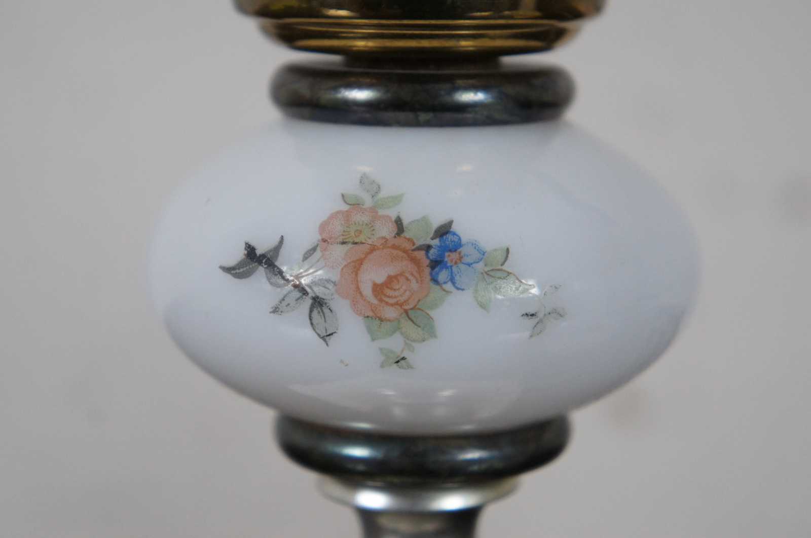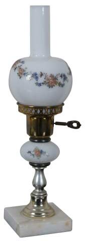 Small Gone with the Wind style budoir lamp, styled like a converted oil lamp with white floral glass hurricane and marble base.