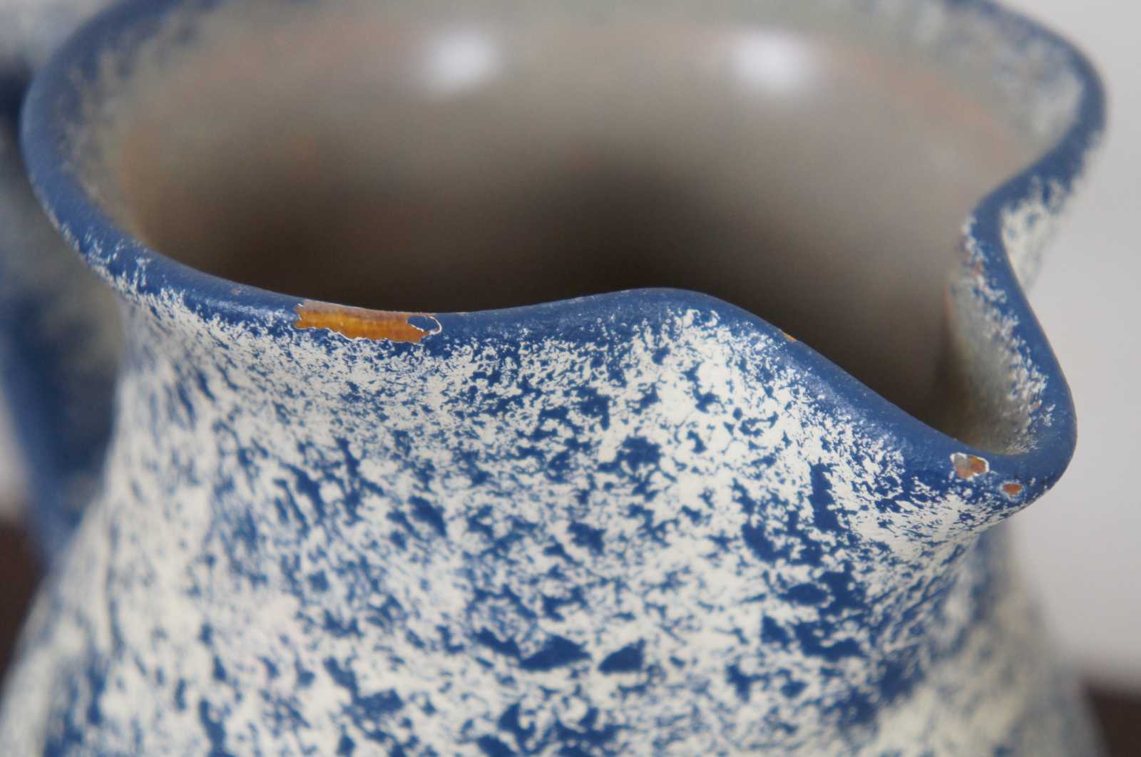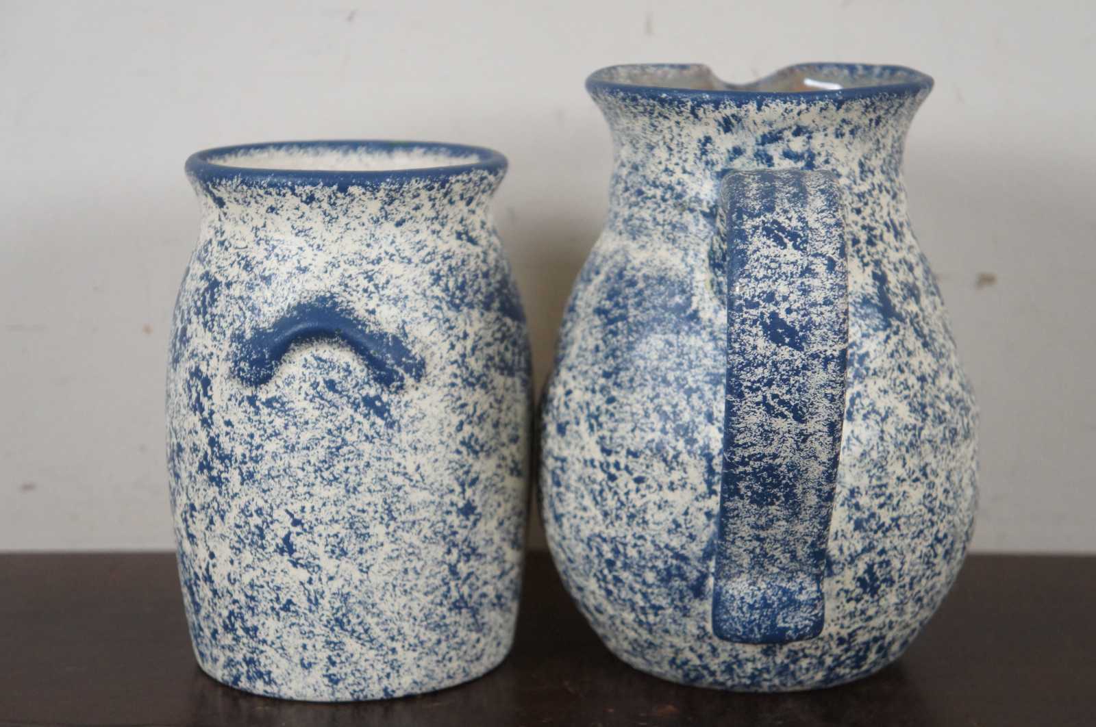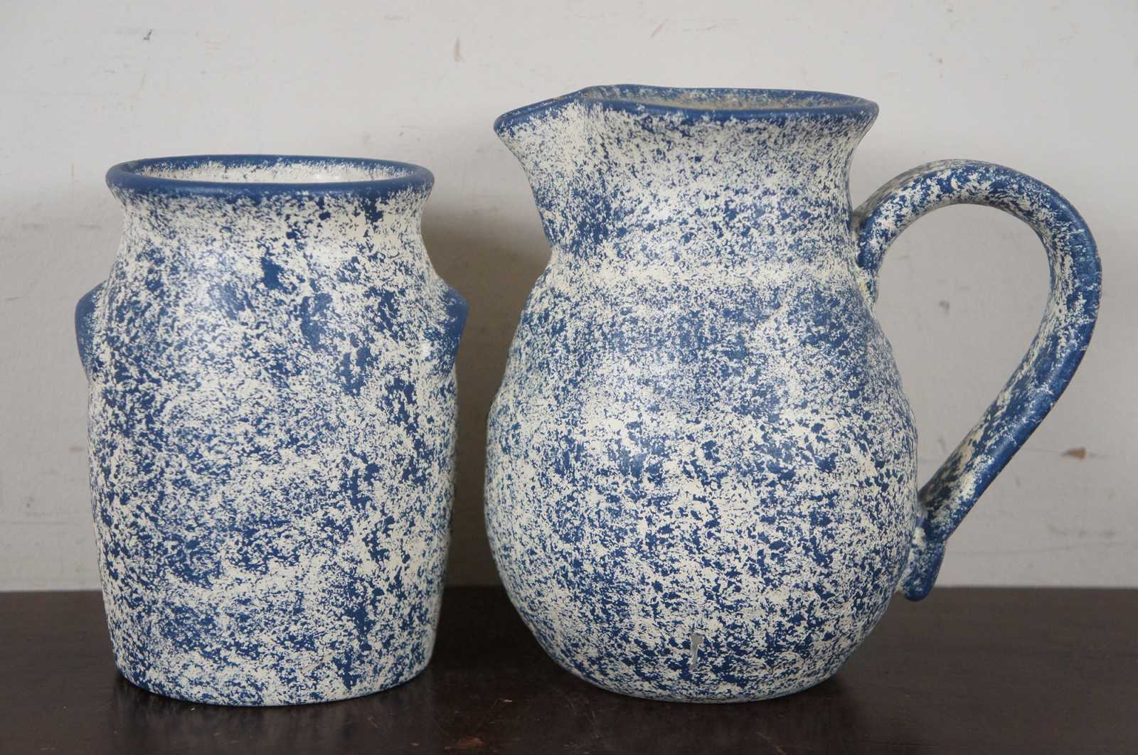 Vintage blue and white spongeware drink pitcher and utensil crock or vase.