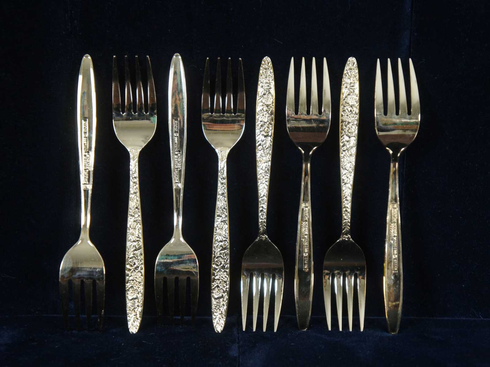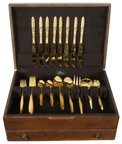 Gilded floral flatware set with wooden chest, mostly Stanley Roberts Stainless in the Bouquet pattern, with serving pieces by JH Carlyle in Golden Bouquet.