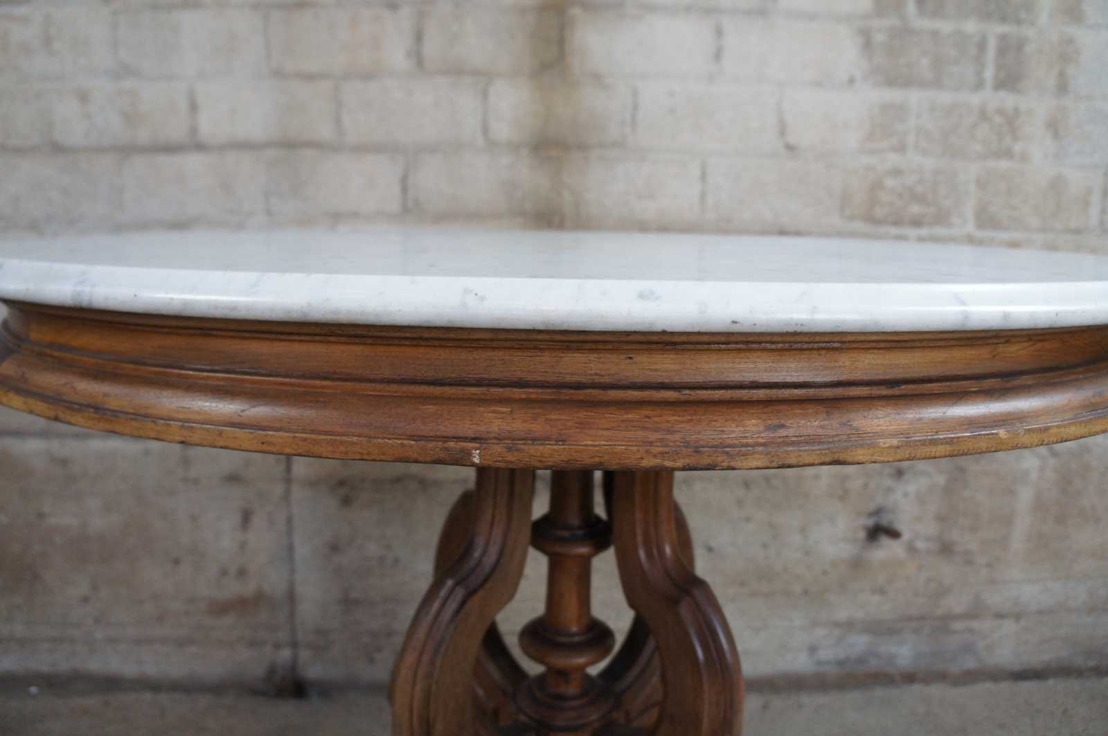 Antique Victorian Eastlake parlor table. Circa 1880s. Made from walnut with an oval white marble top. Base features a turned center support surrounded by four serpentine carved legs leading to castors.