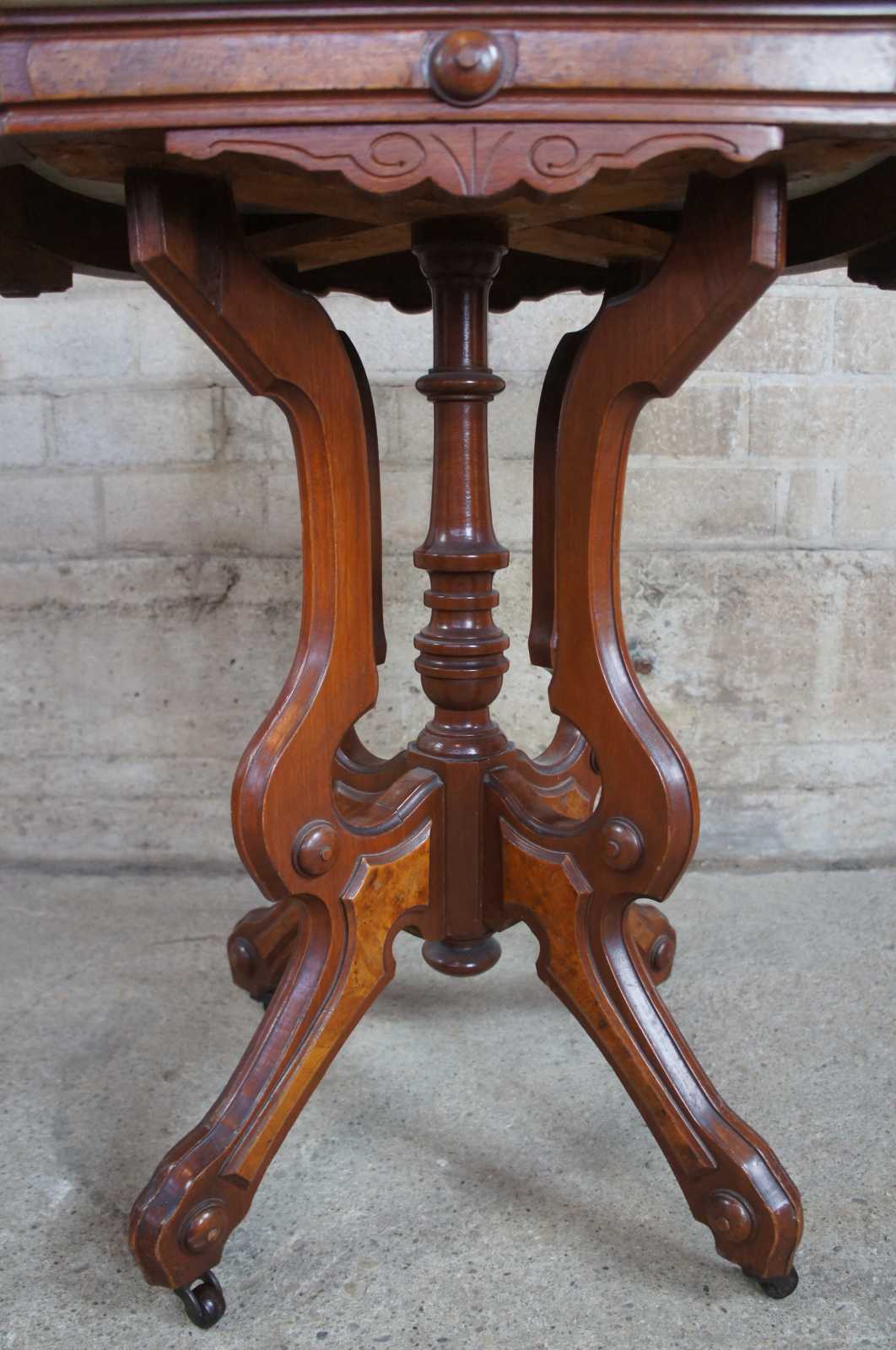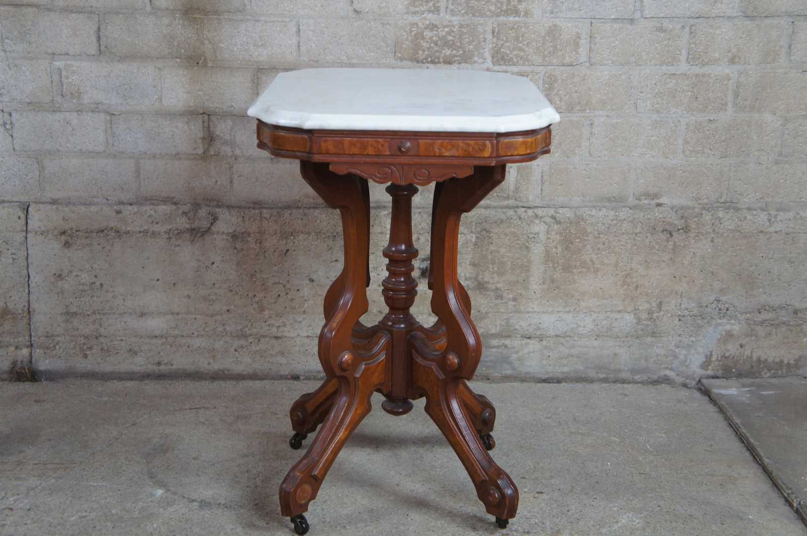 Antique Victorian Eastlake parlor table made by A. H. Heilman & Co. Made from walnut and walnut burl panels with an rectangualr shaped white marble top with serpentine corners. Base features a turned center support surrounded by four serpentine carved legs leading to castors. A.H. Heilman & Co operated out of Williamsport, Pa and specialiazed in chamber suites during the 19th century.
