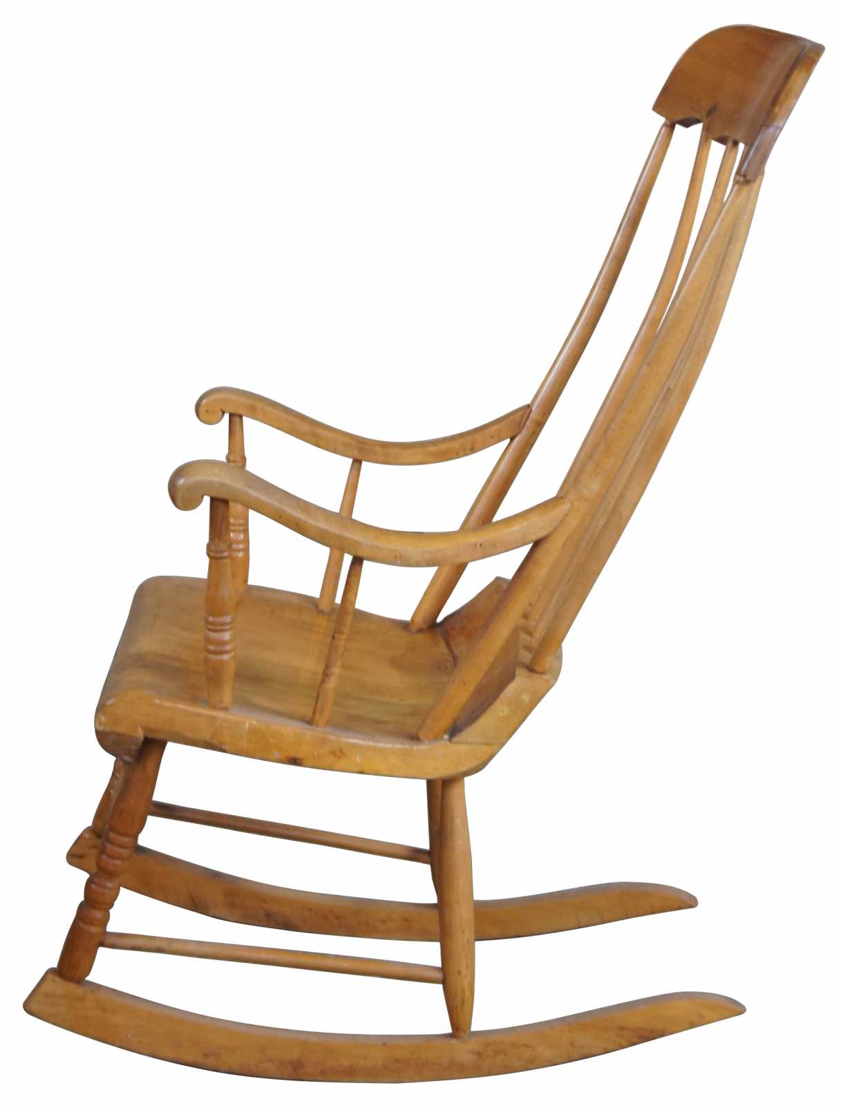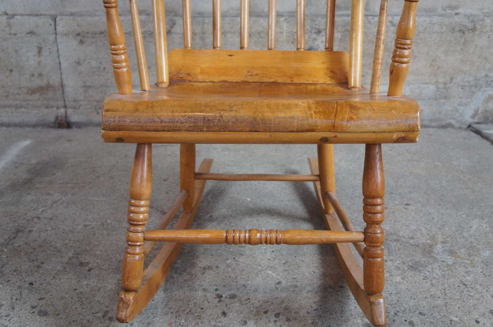Antique artisinal or craftsman made windsor style rocking chair. Made from pine with a spindle back and contoured arms.