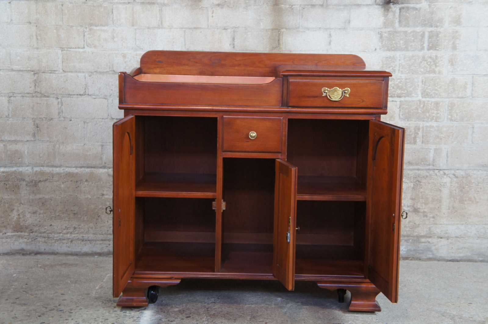 Circa 1960s Pennsylvania House cherry dry sink. Includes copper insert, two drawers and lower cabinet space. On wheels for ease of movement.