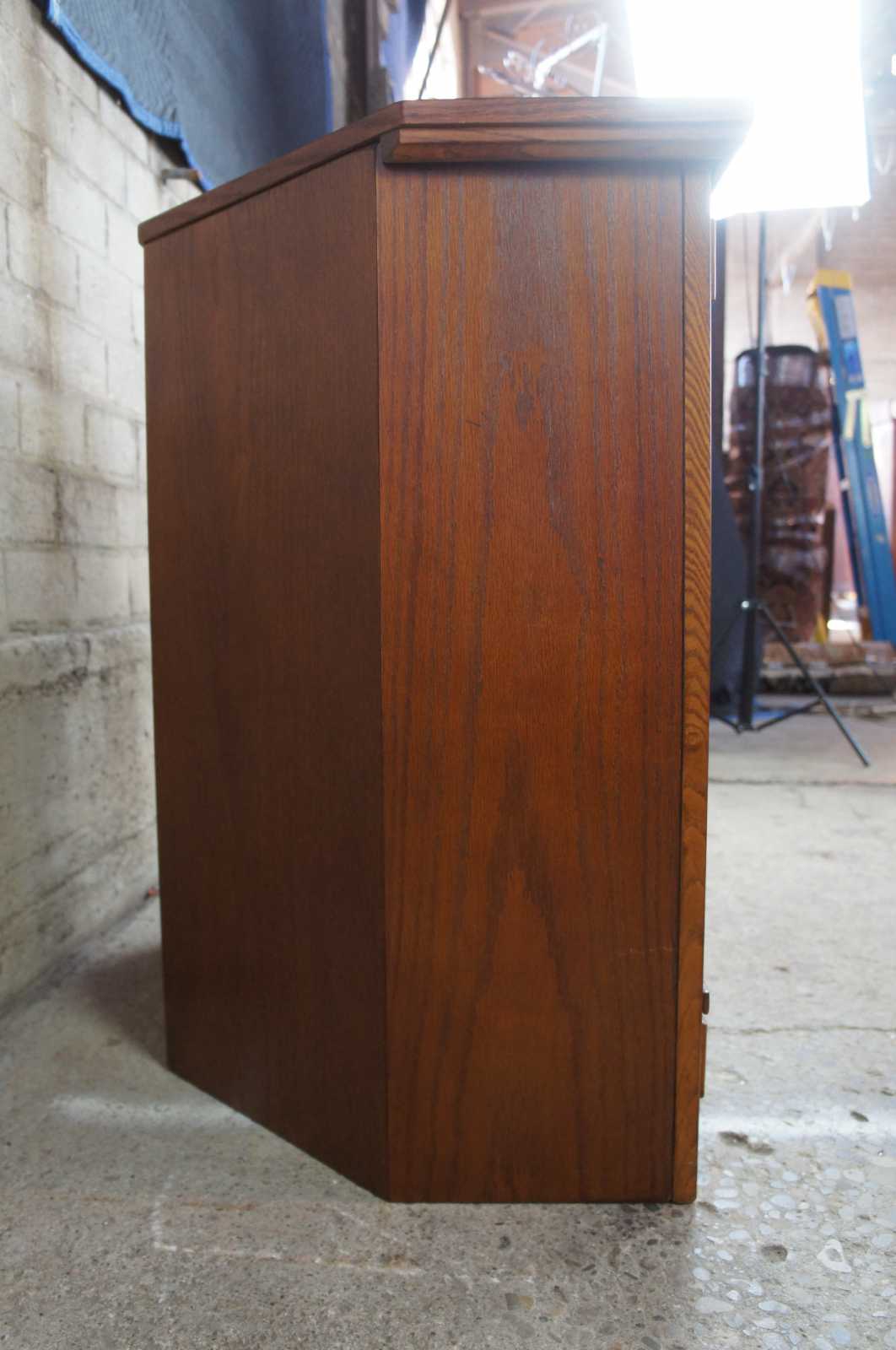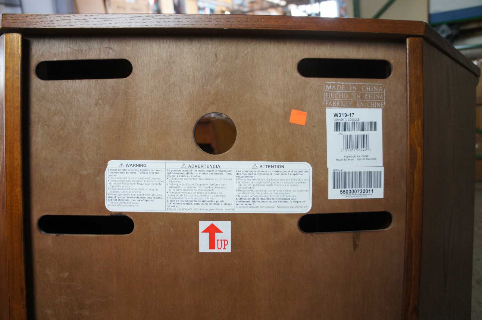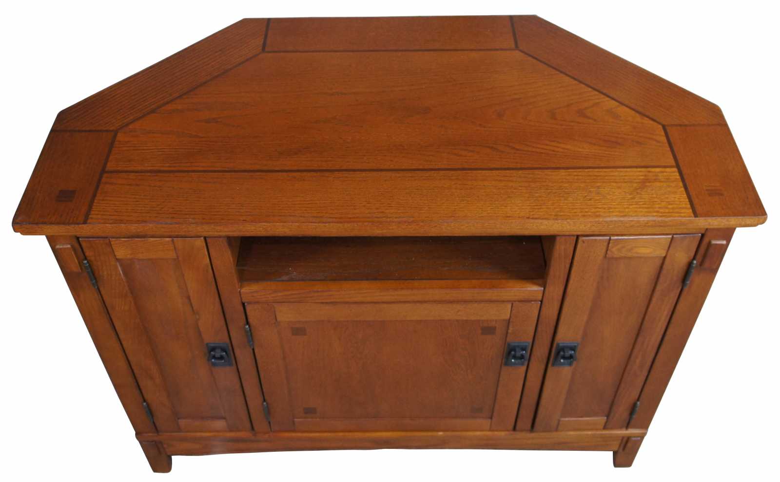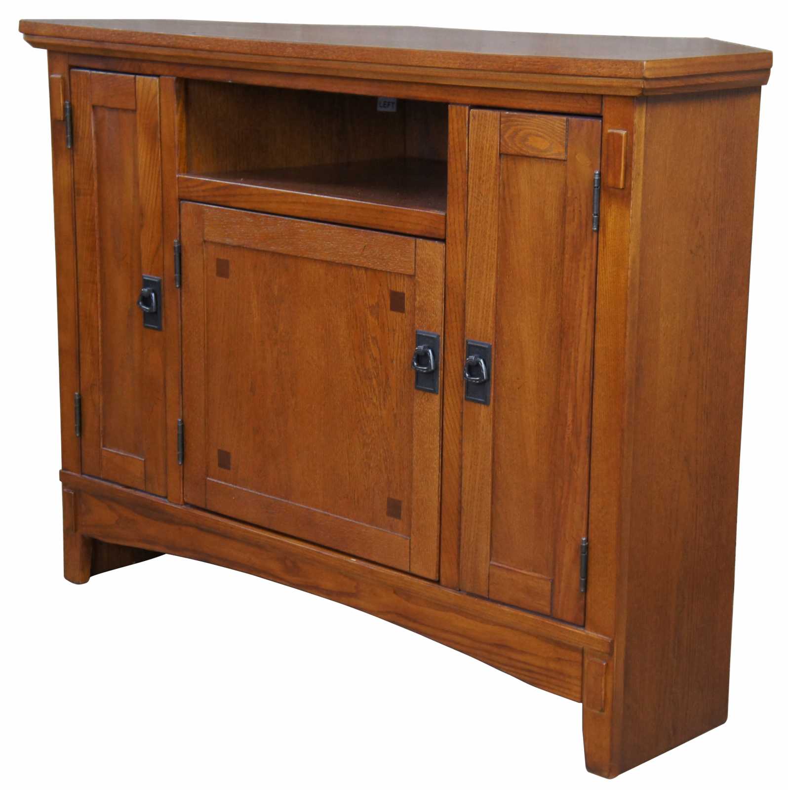 Richly detailed mission design of the "Cross Island" TV stand captures the beauty of rich country style with a versatility that enhances any living room area. The medium brown oak stained finish is beautifully accented by the mortise through ornamentation to create the rustic beauty of finely crafted mission styled furniture. With framed doors, featuring mission styled overlay slats, that open to ample storage areas and cast hardware finished in an aged bronze color, this TV stand perfectly enhances any living environment.