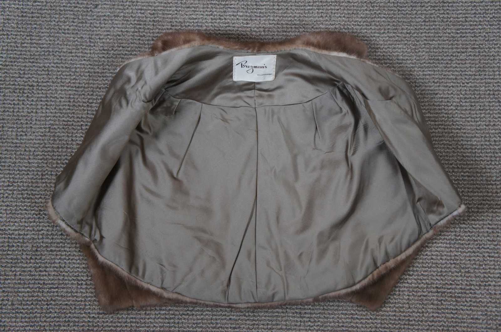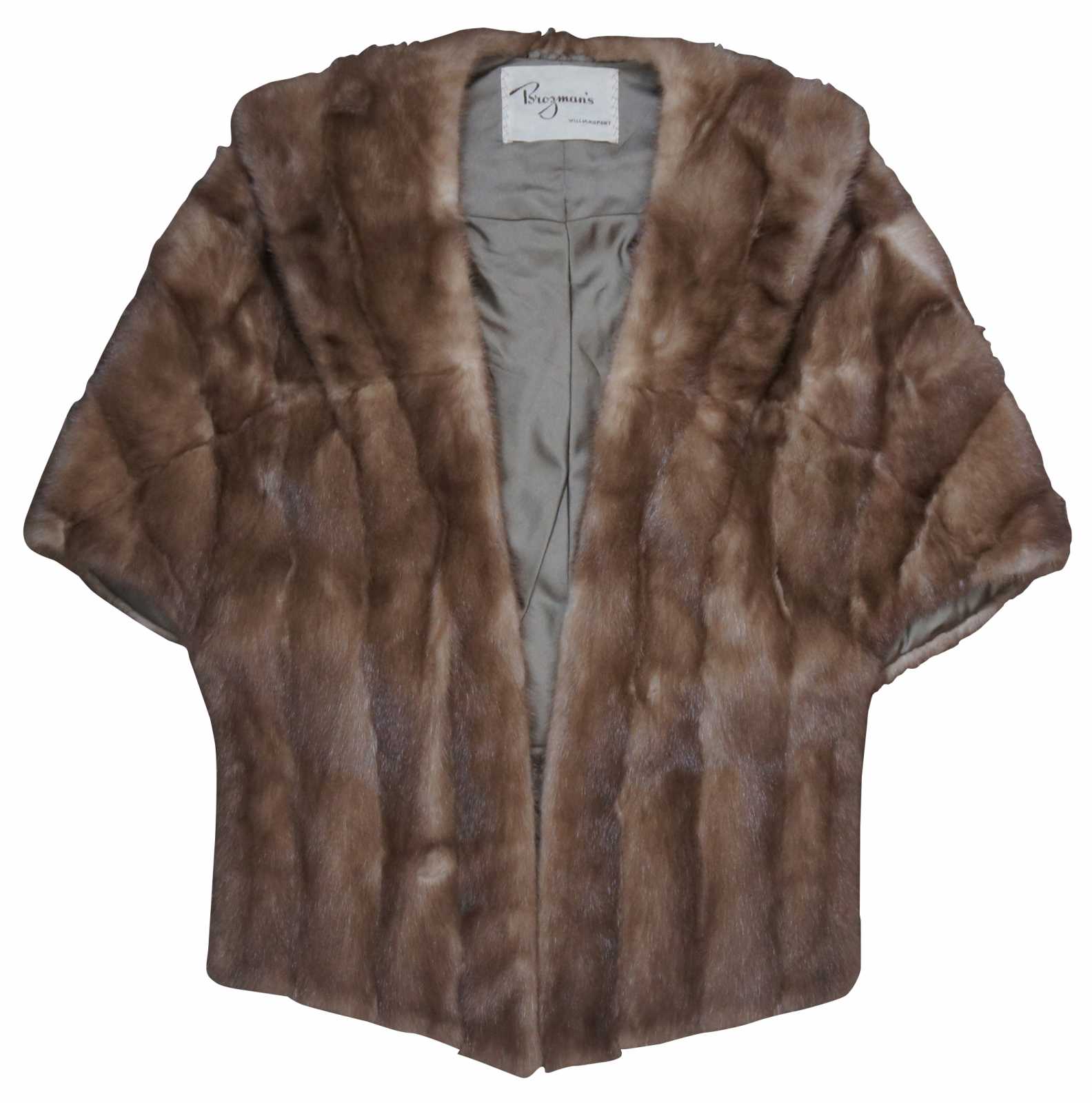 Vintage light brown mink shawl wrap coat or jacket with satin lining and interior pockets; purchased at Brozman’s and monogrammed.