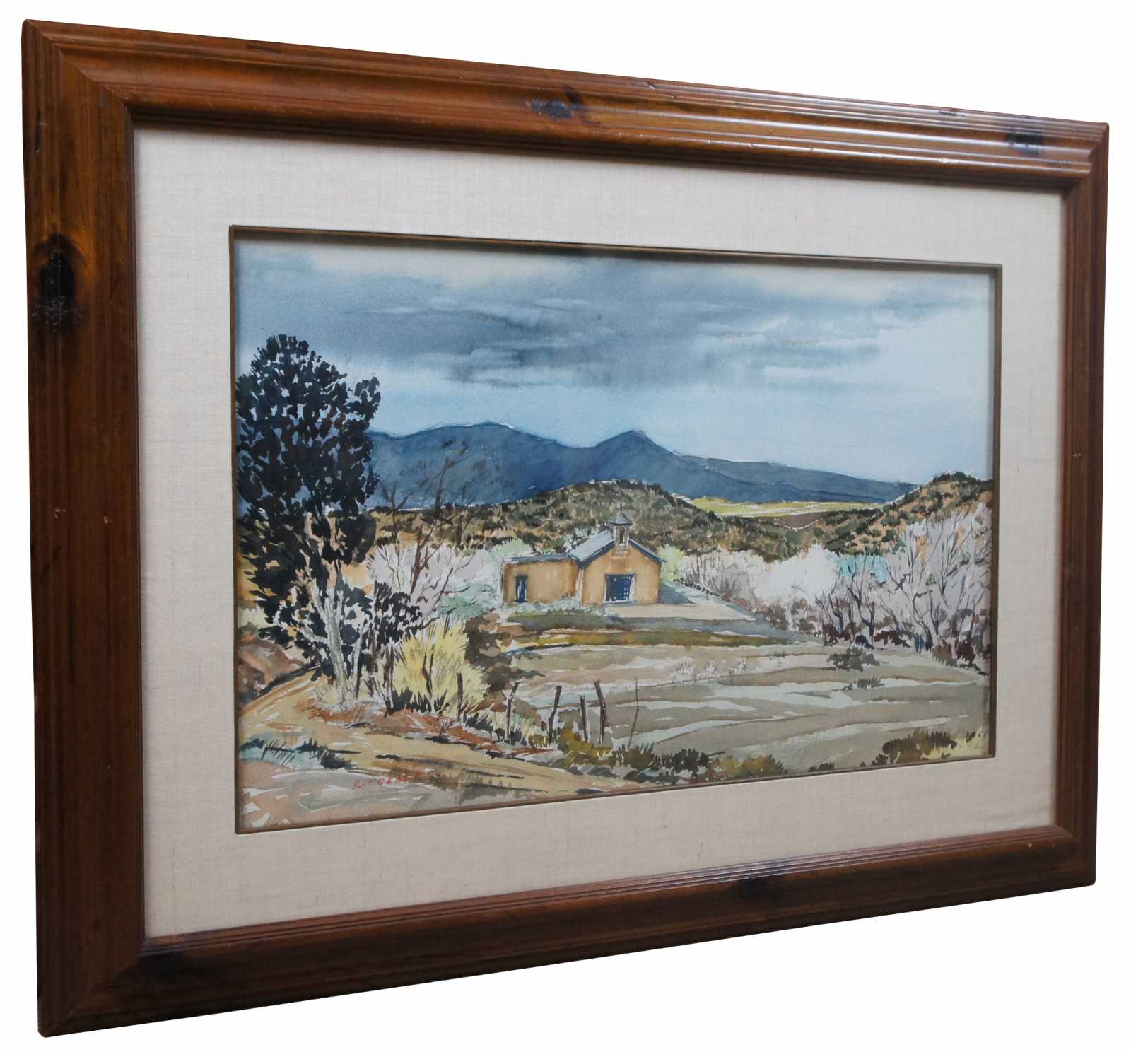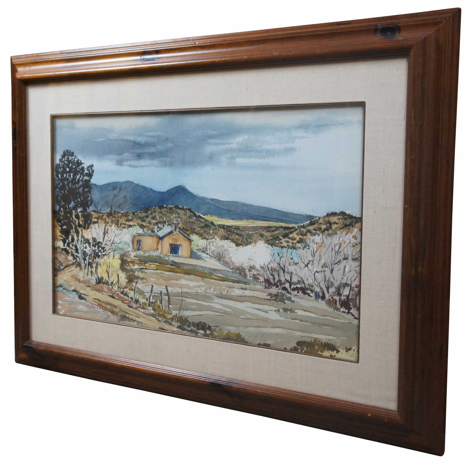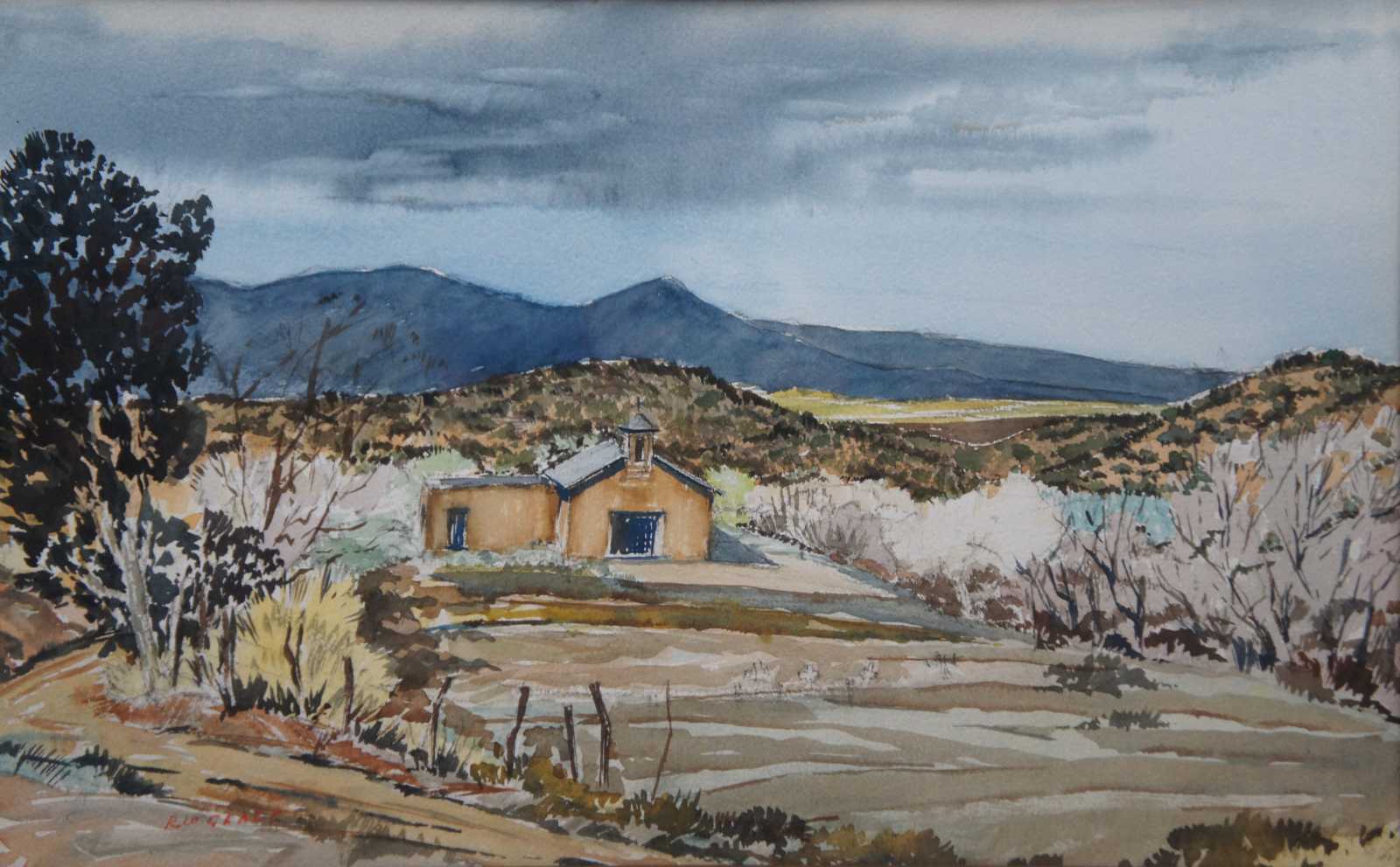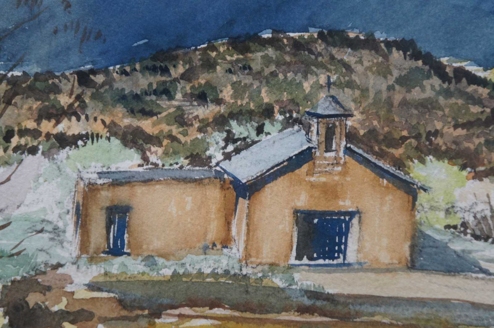 Signed watercolor painting featuring a western country landscape with scraggly trees and a background of mountains behind a simple country church and graveyard.