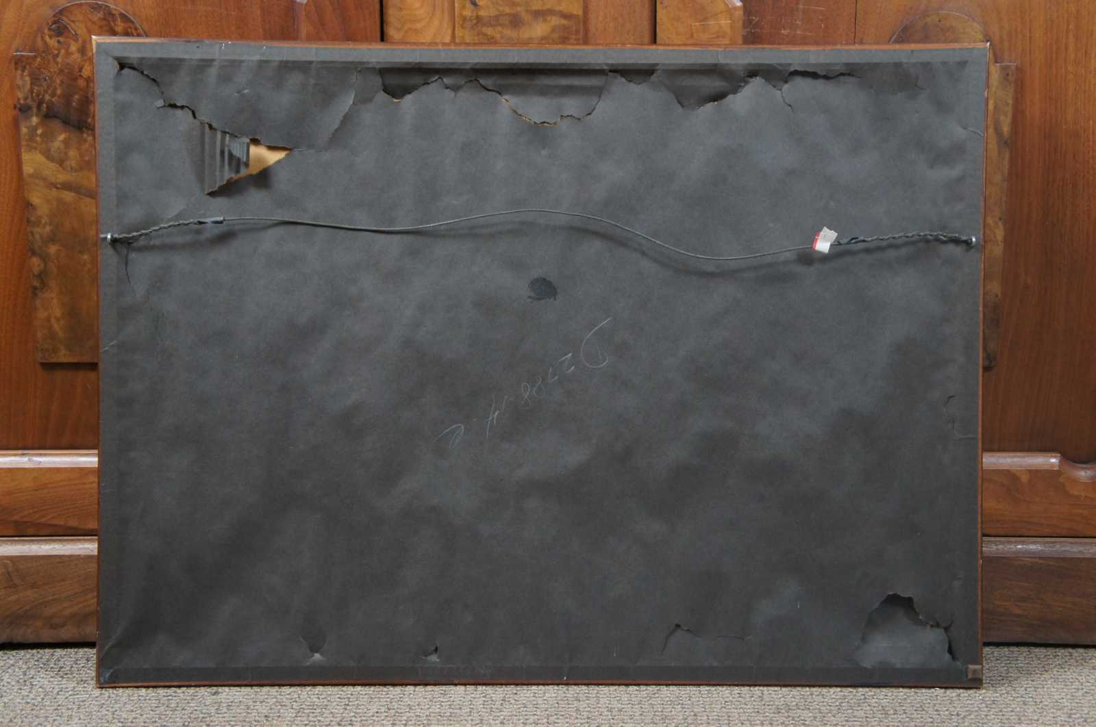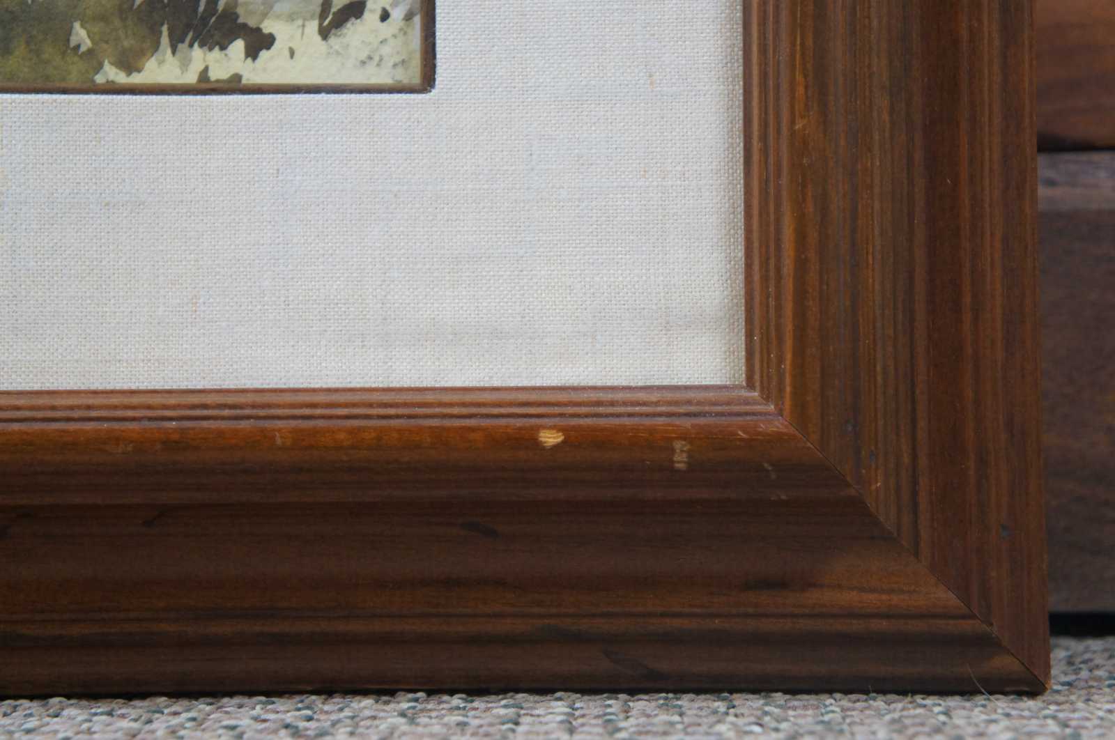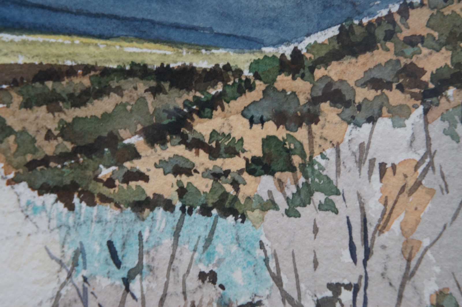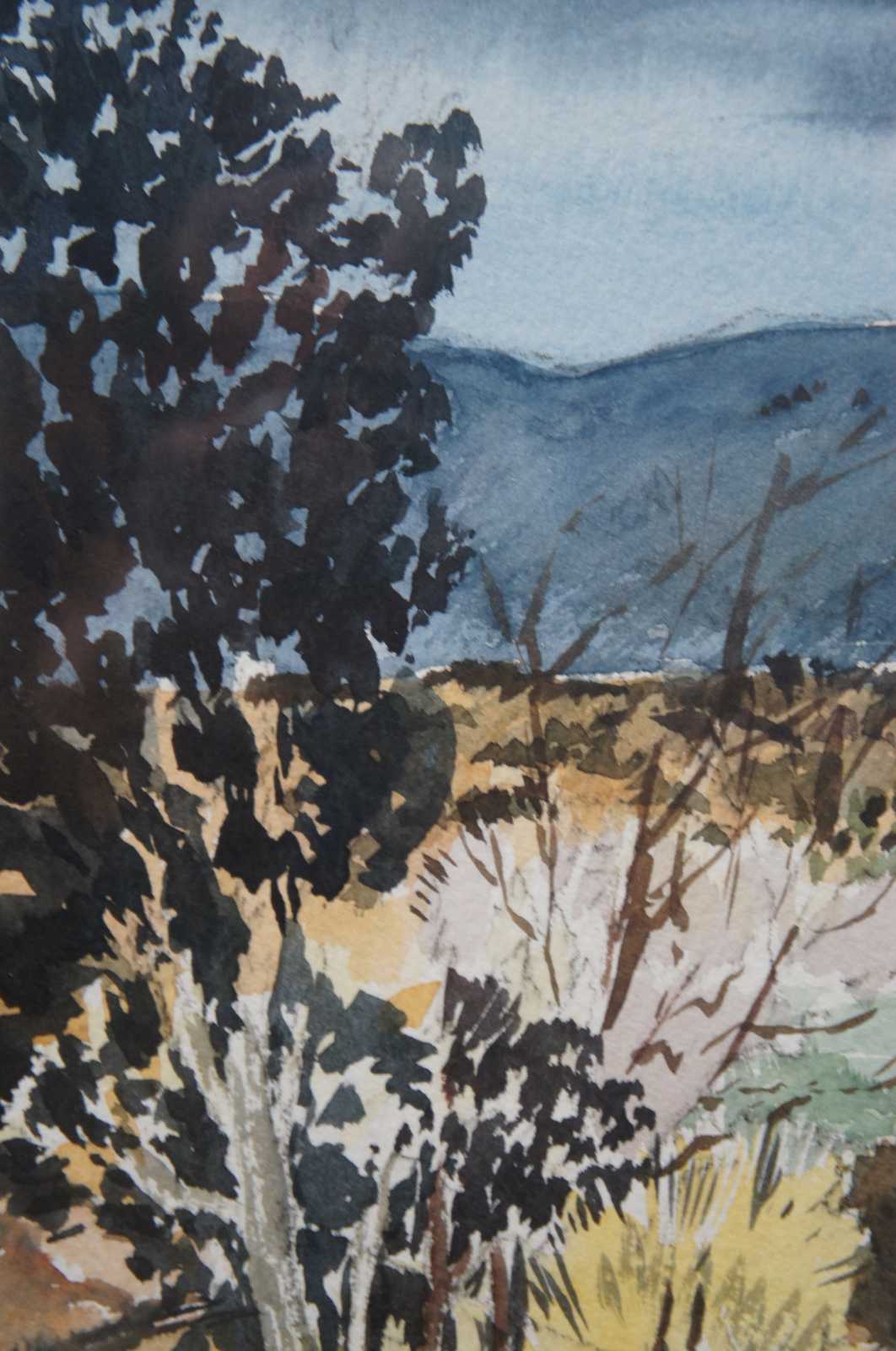 Signed watercolor painting featuring a western country landscape with scraggly trees and a background of mountains behind a simple country church and graveyard.