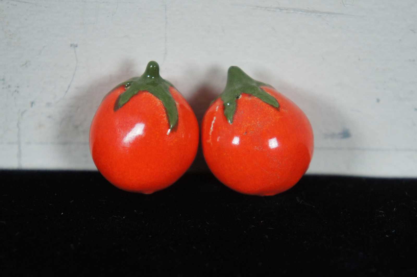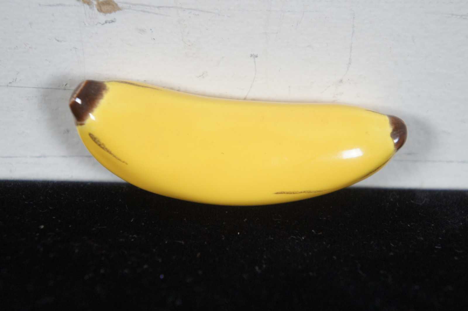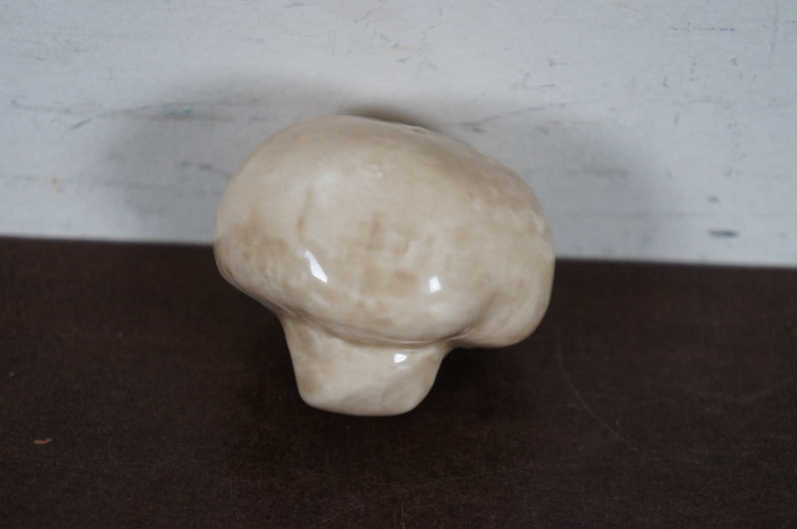 Vintage art pottery centerpiece bowl of fruit and veggies. Features a mushroom, strawberry, banana, carrot, two tomatoes and a ruffled cabbage bowl.
