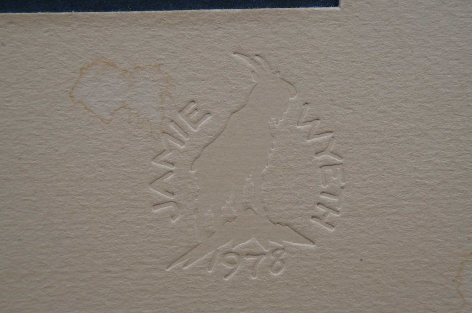 “Born in 1946, James Browning Wyeth came of age when the meaning of patriotism was clouded by the traumas of the Vietnam War and the scandals of Watergate. Working in an era of turmoil and questioning of governmental authority, he did art that encompassed both marching off to war and marching in protest. One of James's early masterworks, Draft Age (1965) depicts a childhood friend as a defiant Vietnam-era teenager resplendent in dark sunglasses and black leather jacket in a suitably insouciant pose. Two years later Wyeth painstakingly composed a haunting, posthumous Portrait of President John F. Kennedy (1967) that seems to catch the martyred Chief Executive in a moment of agonized indecision. As Wyeth Center curator Lauren Raye Smith points out, Wyeth ""did not deify the slain president, [but] on the contrary made him seem almost too human."" Based on hours of study and sketching of JFK's brothers Robert and Edward - documented by insightful studies in the exhibition - the final, pensive portrait seemed too realistic to family members and friends. ""His brother Robert,"" writes Smith in the exhibition catalogue, ""reportedly felt uneasy about this depiction, and said it reminded him of the President during the Bay of Pigs invasion."" In spite of these misgivings, James's JFK likeness has been reproduced frequently and is one of the highlights of this show. The poignancy, appeal and perceptiveness of this portrait, painted when the youngest Wyeth was 21 years old, makes one wish he would do more portraits of important public figures. James himself feels he is at his best painting people he knows well, as exemplified by his vibrant Portrait of Jean Kennedy Smith (1972), which captures the vitality of the slain President's handsome sister. He did paint a portrait of Jimmy Carter for the January 1977 man-of-the-year cover of Time magazine, showing the casually dressed President-elect as a straightforward character posed under a flag-draped water tower next to the family peanut plant in Plains, Ga. James recalls that Carter had one Secret Service agent guarding him as he posed outdoors, a far cry from the protection our Chief Executives require today. As a participating artist in the ""Eyewitness to Space"" program organized by the National Aeronautics and Space Administration in collaboration with the National Gallery of Art in the late 1960s, Wyeth deftly recorded in a series of watercolors his eyewitness observations of dramatic spacecraft launchings and more mundane scenes associated with the space program. Commissioned by Harper's Magazine to cover the 1974 congressional hearings and trials of Watergate figures, James Wyeth executed a series of perceptive and now evocative sketches that recall those dark chapters in our history. Memorable images include a scowling John Ehrlichman, a hollow-eyed Bob Haldeman, an owlish Charles Colson, a focused Congressman Peter Rodino, a grim visaged Father/ Congressman Robert Drinan, and vignettes of the press and various courtroom activities. An 11-by-14-inch pencil sketch of the unflappable Judge John Sirica is especially well done. These ""images are powerful as historical records,"" observes Smith, ""and as lyrically journalistic impressions of events that changed the nation forever."" Wyeth's sketch of early-morning crowds lined up outside the Supreme Court building hoping to hear the Watergate case, with the ubiquitous TV cameramen looking on, is reminiscent of recent scenes as the high court grappled with the Bush-Gore contest. The Wyeth family penchant for whimsy and enigmatic images is evident in Islanders (1990), showing two of James's friends, wearing goofy hats, sitting on the porch of a small Monhegan Island (Me.) cottage draped with a large American flag. Mixing the serious symbolism of Old Glory with the irreverent appearance of the two men, James has created a puzzling but interesting composition. Painting White House Christmas cards for President and Mrs Ronald Reagan, James first showed the familiar mansion as a homey place, with a single light burning in the Reagans' bedroom on a snowy evening in Christmas at the White House (1981). In 1984, he chose a view with Old Glory flying over a close-up, snowed-in image of the North Portico, in Christmas Morning at the White House. While at work on the official portrait of the White House as part of its bicentennial anniversary, James Wyeth spent a great deal of time on the grounds of the mansion, examining it from all angles and at all hours. ""It's just so amazing that this is the home of the leader of the free world,"" he says, ""yet it is really not a large structure. Visitors come expecting to see something on the scale of Versailles, and here is this comparatively small house on the hill, but it is the center of power for this country.