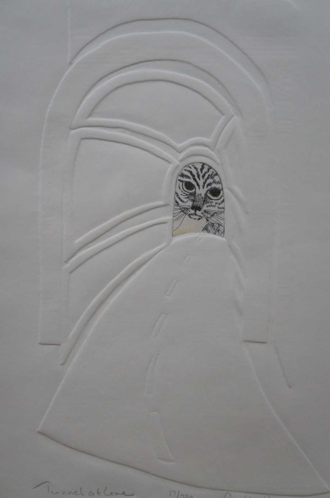Vintage 1989 print by Carol M. Hershey, pencil signed and numbered 17/250, titled “Tunnel of Love,” portraying a pressed relief in the paper of a tunnel and road, leading to a mousehole shaped opening, through which a cat with yellow eyes is peering.