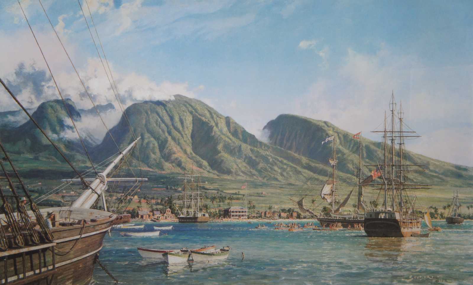 Vintage print featuring “Lahaina: The Whaling (fishing) Brig ‘Isabella’ Arriving (returning) to a Warm Welcome in 1865” by John Stobart, pencil signed and numbered 95/950.