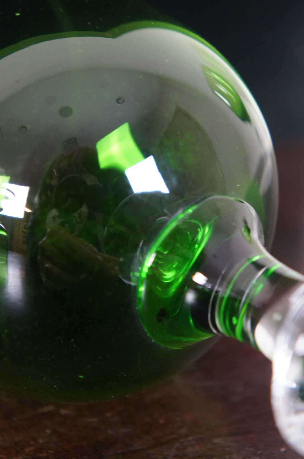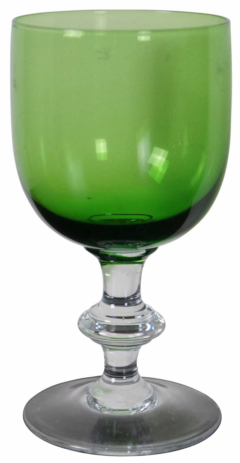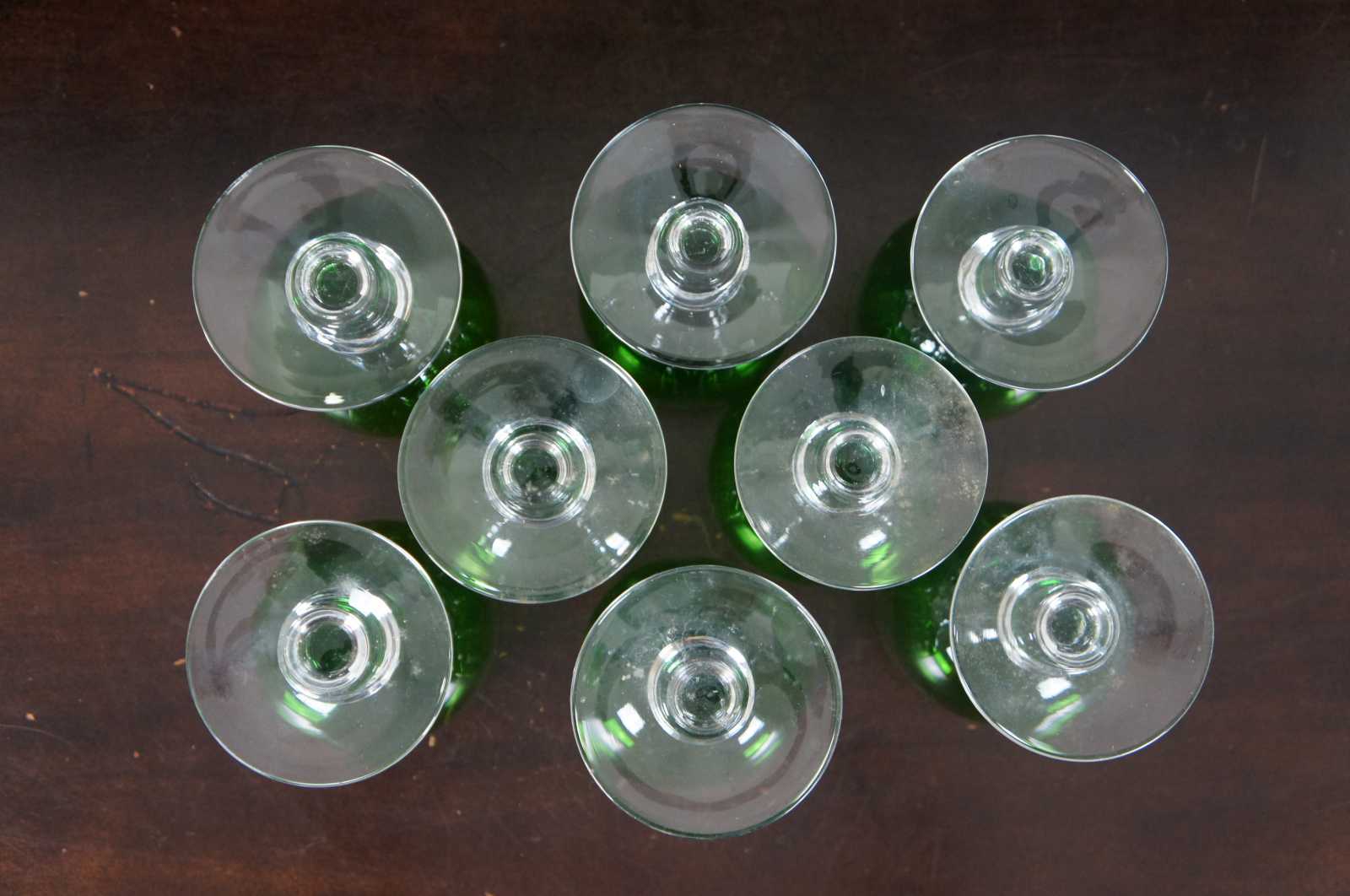 Set of eight vintage wine goblets with green glass tops and clear bases.