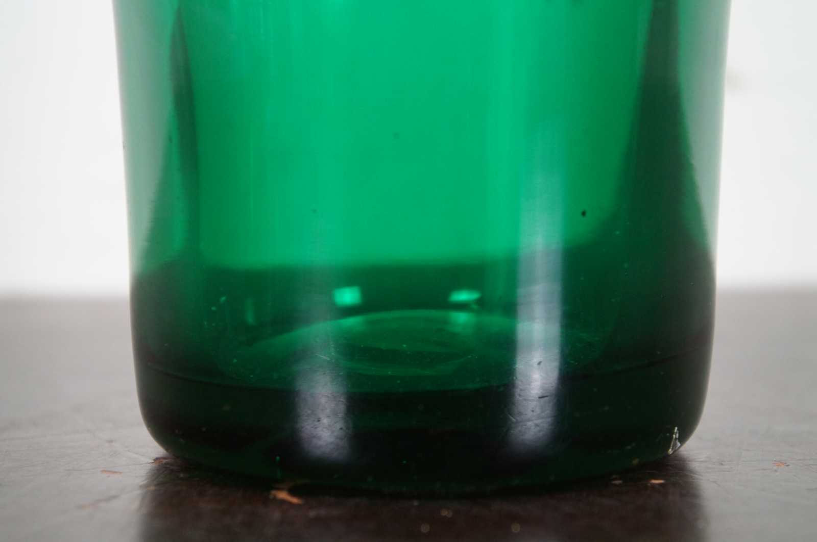 Vitnage hand blown green glass decanter. Features beautiful green glass with a shaved pontil mark and stopper.