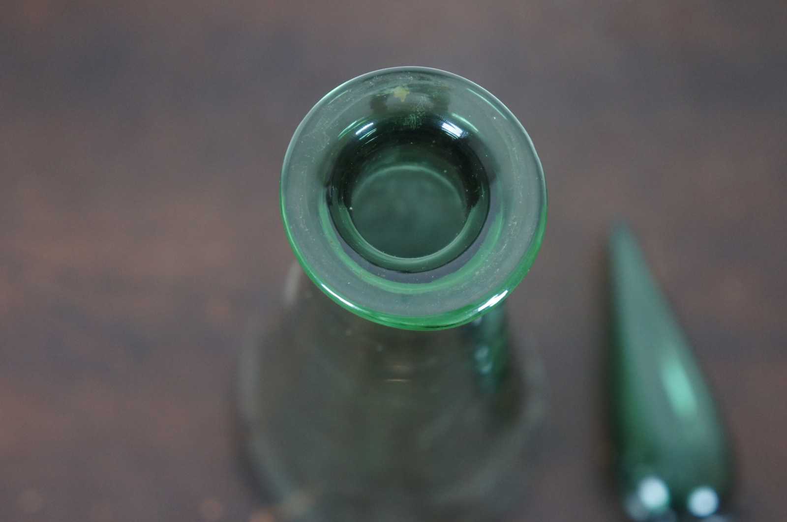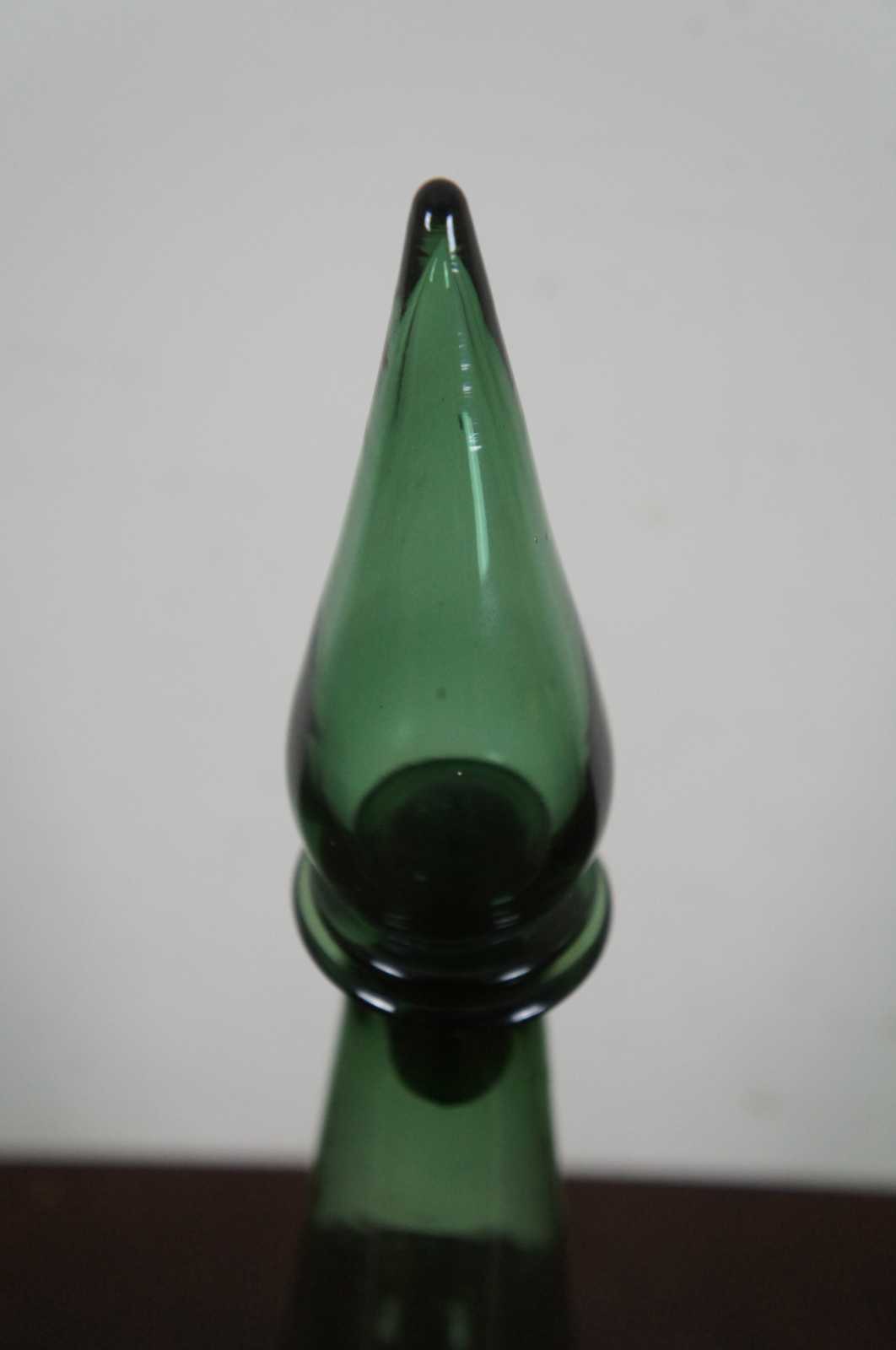 Vitnage mid century modern hand blown green glass decanter. Features green art glass with a shaved pontil mark and tall pointed stopper.